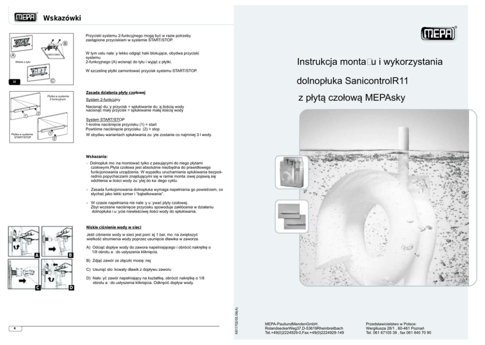 Wskazówki Przyciski systemu 2-funkcyjnego mogą być w razie potrzeby zastąpione przyciskiem w systemie START/STOP. B W tym celu należy lekko odgiąć haki blokujące, obydwa przyciski systemu 2-funkcyjnego (A) wcisnąć do tyłu i wyjąć z płytki. A Widok z tyłu Instrukcja montażu i wykorzystania W szczelinę płytki zamontować przycisk systemu START/STOP. dolnopłuka SanicontrolR11 C 11 Zasada działania płyty czołowej Płytka w systemie 2-funkcyjnym z płytą czołową MEPAsky System 2-funkcyjny Nacisnąć duży przycisk = spłukiwanie dużą ilością wody Nacisnąć mały przycisk = spłukiwanie małą ilością wody 1 2 System START/STOP 1-krotne naciśnięcie przycisku (1) = start Powtórne naciśnięcie przycisku (2) = stop W obydwu wariantach spłukiwania zużyte zostanie co najmniej 3 l wody. 1 Płytka w systemie START/STOP 2 Wskazania: - Dolnopłuk można montować tylko z pasującymi do niego płytami czołowymi.Płyta czołowa jest absolutnie niezbędna do prawidłowego funkcjonowania urządzenia. W wypadku uruchamiania spłukiwania bezpośrednio popychaczami znajdującymi się w ramie montażowej pojawią się odchlenia w ilości wody zużytej do każdego cyklu. - Zasada funkcjonowania dolnopłuka wymaga napełniania go powietrzem, co słychać jako lekki szmer i “bąbelkowanie”. - W czasie napełniania nie należy używać płyty czołowej. Zbyt wczesne naciśnięcie przycisku spowoduje zakłócenia w działaniu dolnopłuka i użycie niewłaściwej ilości wody do spłukiwania. Niskie ciśnienie wody w sieci Jeśli ciśnienie wody w sieci jest poniżej 1 bar, można zwiększyć wielkość strumienia wody poprzez usunięcie dławika w zaworze. A B A) Odciąć dopływ wody do zawora napelniającego i obrócić nakrętkę o 1/8 obrotu aż do usłyszenia kliknięcia. B) Zdjąć zawór ze złączki mosiężnej C) Usunąć stożkowaty dławik z dopływu zaworu D) Nałożyć zawór napełniający na kształtkę, obrócić nakrętkę o 1/8 obrotu aż do usłyszenia kliknięcia. Odkręcić dopływ wody. 4 D K811702/03.06(A) C MEPA-PauliundMendenGmbH. RolandseckerWeg37,D-53619Rheinbreitbach Tel.+49(0)2224929-0,Fax:+49(0)2224929-149 Przedstawicielstwo w Polsce: Wergiliusza 28/1 , 60-461 Poznań Tel. 061 67105 39 , fax 061 840 70 90 Dolnopłuk SanicontrolR11 A B Płyta czołowa MEPAsky Dociąć nożem osłonę rewizji do poziomu płytek. Cieszymy się, że zdecydowaliście się Państwo na zakup stelaża do WC z dolnopłukiem Sanicontrol R11. Aby zapewnić bezproblemowe funkcjonowanie dolnopłuka prosimy o dokonanie montażu zgodnie z załączoną instrukcją. U T T E R C Przyłącze wody ze zintegrowanym zaworem kątowym jest fabrycznie zamontowane z tyłu dolnopłuka (A). Można jednak dokonać zmiany i przekładając je zapewnić dopływ boczny (B). Proszę się upewnić, że zawór kątowy jest zamknięty.Można go otworzyć dopiero wtedy, gdy rama płyty czołowej zostanie połączona z wężem spiralnym (rys. 8). 1 A 6 ODKRĘCENIE DOPŁYWU WODY PRZED ZAŁOŻENIEM WĘŻA NA PŁYTĘ SPOWODUJE STAŁY WYCIEK WODY DO MISKI !!! Zamocować trzpienie montażowe (A). A 20mm B A Odległość pomiędzy przednim końcem trzpieni dystansowych a przednią krawędzią otworu rewizyjnego winna wynosić 20 mm (B). Posadowić styropianową ramkę uszczelniającą (C) w otworze rewizyjnym. Przepłukać gruntownie instalację.Podłączyć wodę. 2 B C 7 Jeśli ciśnienie wody w sieci jest poniżej 1 bar, proszę zapoznać się ze wskazówkami na stronie 4 niniejszej instrukcji. Wąż spiralnyjest fabrycznie zamontowany na krućcu syfonu spustowego. Jego wolny koniec należy wsunąć lekkim ruchem obrotowym na znajdujący się z tyłu ramy montażowej króciec (A). Wielkość spłukiwania jest nastawiona fabrycznie na 6 l. Zmiana tej wielkości jest w razie potrzeby możliwa przez zmianę ustawienia zielonego suwaka (B): A UWAGA: WIDOK OD TYŁU Max. Środek 6l - 9l 7,5 l 6l Zmian ustawienia wielkości spłukiwania można bez kłopotów dokonywać już po zakończeniu montażu i położeniu płytek. 3 A B Wąż spiralny musi przebiegać z tyłu stalowego węża zasilającego zawór napełniający (rys.B). Należy unikać tworzenia się na wężu dodatkowych zagięć (rys.C) C Rama montażowa płyty czołowej stanowi zamkniętą całość.Przez nią odbywa się odpowietrzanie całego układu.Nie można jej rozmontowywać, nie podlega żadnym regulacjom. 8 Uwaga: W wypadku zastosowania do obudowy stelaża prefabrykowanych przez firmę MEPA płyt gipso-włókninowych należy zastosować adapter (A), mocując go od tyłu przytwierdzanej płyty. Odkręcić zawór kątowy. Zamocować ramę montażową przykręcając ją do trzpieni dystansowych za pomocą znajdujących się w komplecie wkrętów. W wypadku zastosowania innych płyt, docinanych w miejscu montażu należy otwór rewizyjny wykonać stosownie do wymiarów osłony rewizji.Adapter nie jest wówczas potrzebny. 4 9 3 Po zamocowaniu płyt GK lub gipso-włókninowych zaślepić na powrót osłonę rewizyjną znajdującą się w komplecie pokrywą. Płyta czołowa MEPAsky jest fabrycznie zmontowana w systemie 2funkcyjnym. 2 1 5 2 W razie potrzeby można ją jednak przezbroić przy wykorzystaniu standardowo dołączanych elementów i zastosować w systemie START/STOP. Przedstawiono to na rysunku 11. 10 3