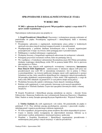 SPRAWOZDANIE Z DZIAŁALNO CI FUNDACJI ITAKA W ROKU 2002 W 2002 r. zgłoszono do Fundacji prawie 700 przypadków zagini spraw zostało wyja nionych. z czego około 57% Najwa niejsze realizowane przez nas projekty to: 1. Zespół Poszukiwa i Identyfikacji. Pracownicy i wolontariusze pracuj codziennie od poniedziałku do pi tku. Poszukujemy zaginionych i identyfikujemy ludzi o nieznanej to samo ci. • Przyjmujemy zgłoszenia o zagini ciach, monitorujemy prac policji w konkretnych sprawach oraz prac innych instytucji mog cych pomóc w poszukiwaniach. • Współpracujemy z polskimi słu bami konsularnymi oraz z licznymi organizacjami pozarz dowymi w kraju i na wiecie, które pomagaj nam w poszukiwaniach. • Publikujemy w mediach informacje o zagini ciach. • Wydajemy broszury z fotografiami zaginionych adresowane do noclegowni i schronisk. • Pomagamy przywróci to samo osobom, które nie pami taj , kim s . • We współpracy z Centralnym Laboratorium Kryminalistycznym KG Policji prowadzimy działania wspieraj ce identyfikacj zwłok NN za pomoc bada DNA. Jest to pierwsza taka inicjatywa w Polsce. • Prowadzimy baz danych osób zaginionych: wewn trzn i internetow . Internetowa Baza Danych Osób Zaginionych – zamieszczamy w internecie zdj cia osób przez nas poszukiwanych oraz osób NN (o nieustalonej to samo ci). Jest to jedyny w Polsce (a prawdopodobnie i na wiecie) publicznie dost pny rejestr osób zaginionych w postaci formularza on-line, który umo liwia identyfikacj bez znajomo ci danych personalnych). Od pocz tku działalno ci zarejestrowali my w bazie około 1700 zaginionych, z czego do ko ca roku 2002 odnalazło si ponad 62% (w tym połowa dzi ki naszej pracy). • Wydali my broszur dla szpitali z informacj o bazie danych i instrukcj obsługi. • Rodziny osób zaginionych, w razie potrzeby, kierowane s do naszych specjalistów pracuj cych w Telefonie Zaufania. Cz sto nasi specjali ci dzwoni do rodzin z własnej inicjatywy. W Zespole Poszukiwa i Identyfikacji pracuj zatrudnione na umow – zlecenie Iwona Fabiszewska i Katarzyna Szablewska oraz wolontariuszki Katarzyna Pancewicz i Magdalena Połe . Nadzór ze strony Zarz du sprawuj Krystyna Napiórkowska i Wojciech Tochman. 2. Telefon Zaufania dla osób zaginionych i ich rodzin. Od poniedziałku do pi tku w godzinach 17-21. Przy telefonie pracuj psychologowie, prawnicy i pracownik socjalny – udzielaj porad i wsparcia psychicznego rodzinom zaginionych. • W wielu wypadkach przygotowujemy pisma urz dowe dla rodzin nieporadnych yciowo. • Cz sto w imieniu rodzin wyst pujemy do odpowiednich instytucji. Głównie s to interwencje w policji, prokuraturze, instytucjach pomocy społecznej. • Wspólnie z Zespołem Poszukiwa i Identyfikacji organizujemy poszukiwania i monitorujemy prac policji i innych instytucji w zakresie poszukiwa . Fundacja ITAKA – Sprawozdanie 2002 1 • • • • W Telefonie Zaufania udzielamy rodzinom zaginionych około 100 porad tygodniowo. Zespół Telefonu Zaufania prowadzi te program: Linia “ adnych Pyta ” dla zaginionych, którzy zastanawiaj si nad powrotem do domu i nie wiedz , jak to zrobi oraz dla tych, którzy wróci nie chc , ale pozwol nam poinformowa rodzin , e yj . Dy ury przy telefonie pełni wolontariusze (Michał Czy ewski, Jolanta Łagodzi ska, Mirella Szeremeta, Aneta Wróbel). Wydali my broszur prawn (autorstwa Katarzyny Staniewskiej) “Kiedy zagin ł człowiek. Podstawowe informacje prawne” adresowan do rodzin osób zaginionych. W broszurze omawiamy podstawowe problemy prawne, na jakie napotykaj rodziny zaginionych. Wydali my równie ksi k (pod redakcj Katarzyny Staniewskiej) “Kiedy zagin ł człowiek. Zagadnienia prawne”. Ksi ka zawiera ekspertyzy wybitnych prawników oraz raport Katarzyny Staniewskiej na temat tych rozwi za w przepisach prawa, które naszym zdaniem wymagaj pilnej zmiany. Przy okazji tej publikacji 31 sierpnia w siedzibie Fundacji zorganizowali my konferencj prasow , której efektem były liczne publikacje na ten temat (m.in. w głównych “Wiadomo ciach”, “Panoramie”, “Gazecie Wyborczej”). Zespół Telefonu Zaufania to: Mariola Barczyk – pracownik socjalny, psychologowie Jolanta Łagodzi ska, Michał Czy ewski i Agata Tomaszewska, prawnik Katarzyna Staniewska (koordynator) i asystent prawnika (student) Przemysław widrowski. Nadzór z ramienia zarz du: Michał Czy ewski. 3. Grupy wsparcia dla rodzin osób zaginionych. Spotkania odbywaj si raz w miesi cu. Organizowali my tak e spotkania grup wsparcia w Krakowie. Udzielamy psychicznego wsparcia rodzinom osób zaginionych, tak e w okresie ałoby. Grupy wsparcia prowadz wolontariusze – Jolanta Łagodzi ska (koordynator), Magdalena Bieniewicz, Lucyna Gromulska, Agata Tomaszewska, Aneta Wróbel. 4. www.zaginieni.pl – strony internetowe Fundacji ITAKA odwiedza miesi cznie 15 tysi cy internautów. Rzadko która organizacja pozarz dowa w Polsce mo e pochwali si tak ilo ci wizyt na stronie www. W internecie szukamy ludzi zaginionych. Radzimy rodzinom zaginionych, jak poszukiwa bliskich, prezentujemy działania fundacji, prowadzimy działania prewencyjne (np. proste zasady adresowane do rodziców małych dzieci i nastolatków, których przestrzeganie zmniejsza ryzyko zagini cia lub ucieczki z domu, prowadzimy serwis ITAKA dla lekarzy). Bezpo rednio ze strony mo na pobra formularz zgłoszeniowy informuj cy Fundacj o fakcie zagini cia. Opiek informatyczn nad stron internetow i baz danych osób zaginionych sprawuje Tomasz Nowak (cz ciowo jako wolontariusz). Nadzór merytoryczny i redakcja – Wojciech Tochman. 5. Program “Nie uciekaj” skierowany do młodzie y, nauczycieli, rodziców. Nasi trenerzy prowadz w warszawskich gimnazjach warsztaty, podczas których pokazuj młodzie y, jak rozwi zywa problemy, tak aby ucieczka nie była jedynym wyj ciem z trudnej sytuacji. Fundacja ITAKA – Sprawozdanie 2002 2 W roku 2002 przeprowadzili my warsztaty w 51 klasach, poza tym odbyły si spotkania dla rodzicó