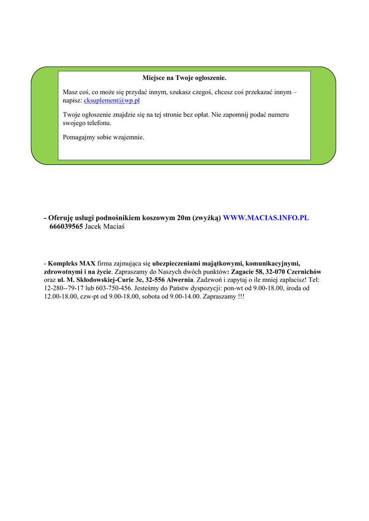 Miejsce na Twoje ogłoszenie. Masz coś, co może się przydać innym, szukasz czegoś, chcesz coś przekazać innym – napisz: [email protected] Twoje ogłoszenie znajdzie się na tej stronie bez opłat. Nie zapomnij podać numeru swojego telefonu. Pomagajmy sobie wzajemnie. - Oferuję usługi podnośnikiem koszowym 20m (zwyżką) WWW.MACIAS.INFO.PL 666039565 Jacek Maciaś - Kompleks MAX firma zajmująca się ubezpieczeniami majątkowymi, komunikacyjnymi, zdrowotnymi i na życie. Zapraszamy do Naszych dwóch punktów: Zagacie 58, 32-070 Czernichów oraz ul. M. Skłodowskiej-Curie 3e, 32-556 Alwernia. Zadzwoń i zapytaj o ile mniej zapłacisz! Tel: 12-280--79-17 lub 603-750-456. Jesteśmy do Państw dyspozycji: pon-wt od 9.00-18.00, środa od 12.00-18.00, czw-pt od 9.00-18.00, sobota od 9.00-14.00. Zapraszamy !!!