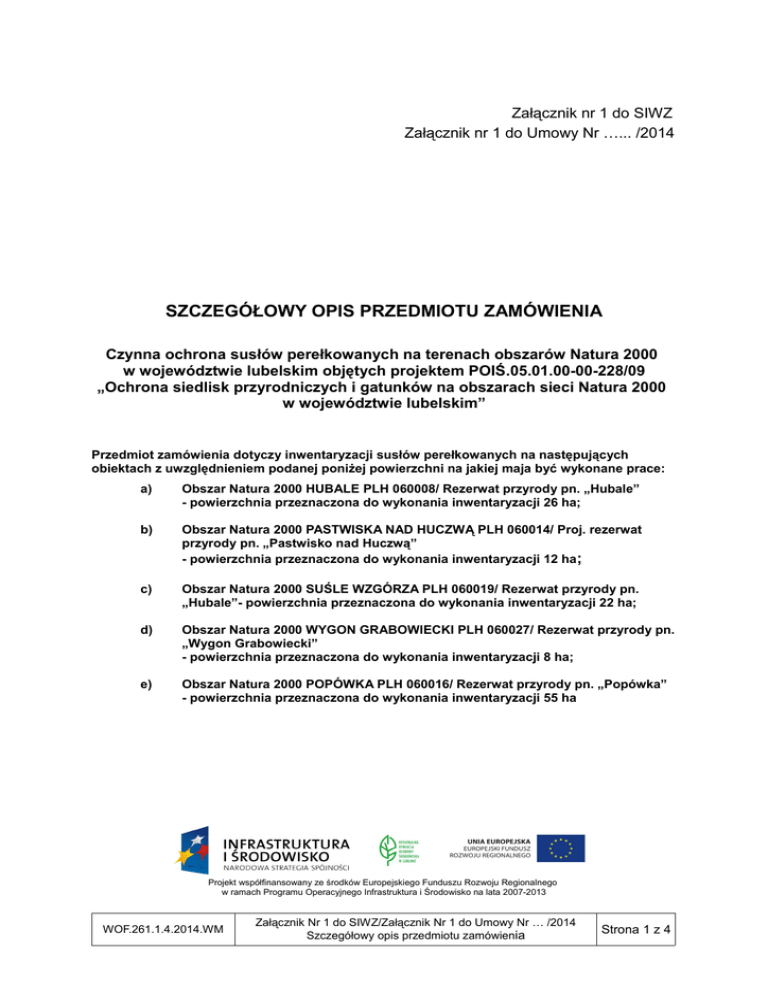 Załącznik nr 1 do SIWZ Załącznik nr 1 do Umowy Nr …... /2014 SZCZEGÓŁOWY OPIS PRZEDMIOTU ZAMÓWIENIA Czynna ochrona susłów perełkowanych na terenach obszarów Natura 2000 w województwie lubelskim objętych projektem POIŚ.05.01.00-00-228/09 „Ochrona siedlisk przyrodniczych i gatunków na obszarach sieci Natura 2000 w województwie lubelskim” Przedmiot zamówienia dotyczy inwentaryzacji susłów perełkowanych na następujących obiektach z uwzględnieniem podanej poniżej powierzchni na jakiej maja być wykonane prace: a) Obszar Natura 2000 HUBALE PLH 060008/ Rezerwat przyrody pn. „Hubale” - powierzchnia przeznaczona do wykonania inwentaryzacji 26 ha; b) Obszar Natura 2000 PASTWISKA NAD HUCZWĄ PLH 060014/ Proj. rezerwat przyrody pn. „Pastwisko nad Huczwą” - powierzchnia przeznaczona do wykonania inwentaryzacji 12 ha ; c) Obszar Natura 2000 SUŚLE WZGÓRZA PLH 060019/ Rezerwat przyrody pn. „Hubale”- powierzchnia przeznaczona do wykonania inwentaryzacji 22 ha; d) Obszar Natura 2000 WYGON GRABOWIECKI PLH 060027/ Rezerwat przyrody pn. „Wygon Grabowiecki” - powierzchnia przeznaczona do wykonania inwentaryzacji 8 ha; e) Obszar Natura 2000 POPÓWKA PLH 060016/ Rezerwat przyrody pn. „Popówka” - powierzchnia przeznaczona do wykonania inwentaryzacji 55 ha Projekt współfinansowany ze środków Europejskiego Funduszu Rozwoju Regionalnego w ramach Programu Operacyjnego Infrastruktura i Środowisko na lata 2007-2013 WOF.261.1.4.2014.WM Załącznik Nr 1 do SIWZ/Załącznik Nr 1 do Umowy Nr … /2014 Szczegółowy opis przedmiotu zamówienia Strona 1 z 4 Badania liczebności, zagęszczenia i rozsiedlenia populacji susłów perełkowanych (zasady ogólne) Podstawową zasadą jaka ma zostać spełniona przy wykonaniu przedmiotu zamówienia tj. przy przeprowadzeniu inwentaryzacji populacji susłów perełkowanych jest zasada całkowitej bezinwazyjności zastosowanej metody (brak fizycznego kontaktu ze zwierzętami, a tym samym ograniczenie czynników stresogennych). Wyniki badań powinny być uzyskane bez potrzeby odławiania susłów, stosując metody oparte na liczeniu nor tych gryzoni. W zależności od zasiedlonego przez susły areału należy liczyć wszystkie nory na danym obszarze lub tylko na wydzielonych powierzchniach próbnych. Powierzchnię próbną powinny stanowić zwykle odcinki tzw. transekty podzielone na poletka badawcze, które rozmieszczone są na areale zasiedlonym przez susły. W badaniach tego typu przyjmuje się zasadę, że powierzchnia próbna nie może być mniejsza od powierzchni ustalonej przez Varšavskiego (1952). Wszystkie kolonie zwarte susłów zajmują określone obszary, poza które nie mogą one emigrować (bariery ekologiczne, techniczne), dlatego dla każdej z nich należy obliczyć liczebność bezwzględną populacji. W badaniach należy zastosować jedną z trzech metod: ✔ metoda I – polega na liczeniu nor po zatkaniu ich otworów wejściowych: wariant 1 – na całym zasiedlonym przez susły terenie, wariant 2 – na powierzchni próbnej (transekty); ✔ metoda II – polega na liczeniu nor bez zatykania ich otworów wejściowych: wariant 1 – na całym zasiedlonym przez susły terenie, wariant 2 – na powierzchni próbnej (transekty); ✔ metoda III – polega na liczeniu tzw. „nor wiosennych”: wariant1 – na całym zasiedlonym przez susły terenie, wariant 2 – na powierzchni próbnej (transekty). W czasie liczenia nor metodami I i II należy ustalać i notować ich typy. Następnie liczebność susłów obliczyć dzieląc liczbę nor wyliczoną przez ekstrapolację przez odpowiednie wskaźniki. Precyzyjna identyfikacja oraz klasyfikacja nor jest niezmiernie trudna i wymaga Projekt współfinansowany ze środków Europejskiego Funduszu Rozwoju Regionalnego w ramach Programu Operacyjnego Infrastruktura i Środowisko na lata 2007-2013 WOF.261.1.4.2014.WM Załącznik Nr 1 do SIWZ/Załącznik Nr 1 do Umowy Nr … /2014 Szczegółowy opis przedmiotu zamówienia Strona 2 z 4 wieloletniego doświadczenia. Dokładne obliczenie liczby poszczególnych rodzajów nor jest bardzo ważne również z tego względu, że z procentowego stosunku, np. nor pionowych do ukośnych można wnioskować o stanie regresywnym lub progresywnym kolonii. W metodzie I w celu określenia nory jako zasiedlonej używa się tzw. zatykania otworu wejściowego. Polega to na tym że, otwór wejściowy zatykany jest delikatnie czopem z miękkiej słomy w przeddzień wykonywania liczenia nor. Następnego dnia nory są obserwowane i klasyfikowane jako zasiedlone w wypadku odetkania przez susły. Gryzonie te przy dobrej pogodzie wychodzą z nory przynajmniej raz w ciągu kilkunastu godzin. Nie bez znaczenia jest fakt, iż metoda ta nie powoduje stresogennego wpływu na te zwierzęta, gdyż delikatne zatykanie nor praktycznie nie różni się od przytykania ich poprzez obfite pokosy trawy na pastwiskach, a susły bez znacznego wysiłku je otwierają. Metoda III jest metodą którą można stosować jedynie w bardzo ograniczonym okresie w sezonie aktywności susłów. Wiąże się to z tym, że w okresie wiosennym, podczas wychodzenia susłów na powierzchnię po śnie zimowym, wykopują one tzw. „nory wiosenne”. Są to nory pionowe, ale charakteryzują się tym, że są węższe od nor pionowych wykopanych w lecie. Metodę III uzupełnia się najczęściej jedną z pozostałych metod (I lub II) w związku z tym, iż nie obejmuje ona możliwości uwzględnienia w wyliczeniach osobników młodych urodzonych w roku bieżącym. Zagęszczenie susłów w badanych populacjach należy obliczać na wstępie na 1ha powierzchni, biorąc za podstawę dane dotyczące całkowitej liczby susłów stwierdzonych na powierzchniach próbnych, a następnie na całym zasiedlonym areale lub na poszczególnych jego częściach wydzielonych w zależności od ukształtowania terenu i szaty roślinnej. Badania rozsiedlenia (wielkości areałów) populacji susłów Wielkość