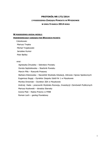 PROTOKÓŁ NR 173/2014 Z POSIEDZENIA ZARZĄDU POWIATU W MYSZKOWIE W DNIU 5 MARCA 2014 ROKU W POSIEDZENIU UDZIAŁ WZIĘLI: PRZEWODNICZĄCY ZARZĄDU PAN WOJCIECH PICHETA Członkowie: Mariusz Trepka Michał Trojakowski Jarosław Kumor Piotr Bańka oraz: Agnieszka Żmudzka – Sekretarz Powiatu Dorota Sędzielewska – Skarbnik Powiatu Marcin Pilis – Rzecznik Prasowy Barbara Kilanowska – Naczelnik Wydziału Edukacji, Zdrowia i Spraw Społecznych Eugeniusz Bugaj – Dyrektor Zespołu Szkół Nr 1 w Myszkowie Monika Drewniak – Dyrektor ZEA w Myszkowie Andrzej Hada – pracownik Wydziału Rozwoju, Inwestycji i Zamówień Publicznych Mariusz Kozłowski – doradca Starosty Iwona Ptaś – Radca Prawny w PINB Roman Lech – geolog Powiatowy 1 PORZĄDEK POSIEDZENIA: 1. Stwierdzenie prawomocności posiedzenia Zarządu Powiatu. 2. Przyjęcie porządku posiedzenia Zarządu Powiatu. 3. Przyjęcie protokołu Nr 171/14 z dnia 26.02.14r, Nr 172/14 z dnia 28.02.14r 4. Pismo dot. remontu dachu sali gimnastycznej w Zespole Szkół Nr 1 w Myszkowie. Referuje Pan Eugeniusz Bugaj, Pani Monika Drewniak, Pan Andrzej Hada. 5. Podpisanie aneksu do Porozumienia w sprawie ponoszenia wydatków związanych z opieką i wychowaniem dziecka w Powiecie Będzińskim (zmiana konta bankowego). Referuje Pani Agnieszka Żmudzka. 6. Pismo w sprawie zwiększenia godzin dydaktycznych nauczania indywidualnego dla ucznia Zespołu Szkół w Żarkach. Referuje Pani Barbara Kilanowska. 7. Informacja na temat dokonanych zmian w planie finansowym PUP w Myszkowie. Referuje Pani Dorota Sędzielewska. 8. Rozpatrzenie kwestii skarpy w obrębie działki 301/2 w m. Mzurów 40. Referuje Pan Roman Lech. 9. Sprawy bieżące: - informacja Doradcy Starosty- Pana M. Kozłowskiego w sprawie wybory Koordynatora ds. budowy strategii Powiatu Myszkowskiego. -Informacja dot. uzyskania dofinansowania przez Powiatowy Urząd Pracy w Myszkowie projektu pn ”Dojrzały i aktywny”. Referuje Pani Marzena Kulak – Zastępca Dyrektora Powiatowego Urzędu Pracy w Myszkowie. 2 Przebieg posiedzenia Zarządu Powiatu Ad.1.Stwierdzenie prawomocności posiedzenia Zarządu Powiatu. Pan Wojciech Picheta na podstawie listy obecności, stanowiącej załącznik nr 1 do niniejszego protokołu stwierdził prawomocność posiedzenia w dniu 5 marca 2014 roku. W posiedzeniu uczestniczyło 5 Członków Zarządu Ad.2. Przyjęcie porządku posiedzenia Zarządu Powiatu. Do porządku posiedzenia na wniosek Pani A. Żmudzkiej zostały wprowadzone następujące tematy: - informacja Doradcy Starosty- Pana M. Kozłowskiego w sprawie wybory Koordynatora ds. budowy strategii Powiatu Myszkowskiego, -informacja w sprawie uzyskania dofinansowania przez Powiatowy Urząd Pracy w Myszkowie dot. projektu pn ”Dojrzały i aktywny”. Pan Piotr Bańka zapytał: - czy jest już gotowa opinia prawna dot. naliczania opłat za zajęcie pasa drogowego w związku z ustawieniem tablic informacyjnych, odpowiedzi udzieliła Pani Agnieszka Żmudzka –informacja jest w trakcie opracowania. Pan Piotr Bańka: - czy została sprawdzona dokumentacja dot. remontu dachu sali gimnastycznej w Zespole Szkół Nr 1 w Myszkowie, gdyż padły zastrzeżenia w sprawie remontu z roku 2010 ze strony Pana Dyrektora E. Bugaja. Odpowiedzi udzielił Pan Wojciech Picheta – mamy dokumentację, będziemy dziś na ten temat rozmawiać. Do przedstawionego porządku po zmianach Zarząd nie wniósł uwag, przyjął go jednogłośnie. Ad.3. Przyjęcie protokołu Nr 171/14 z dnia 26.02.14r, Nr 172/14 z dnia 28.02.14r Protokół Nr 171/14 i Nr 172/14 zostały jednogłośnie przyjęte i podpisane. Ad.4. Pismo dot. remontu dachu sali gimnastycznej w Zespole Szkół Nr 1 w Myszkowie , pismo w tej sprawie stanowi załącznik nr 2 do protokołu. Pan Eugeniusz Bugaj wyjaśnił: proponuję, aby brakująca kwota za remont dachu została pokryta z budżetu szkoły z § 4300 – praktyki. O wyjaśnienia w sprawie remontu dachu w Zespole Szkół Nr 1 w Myszkowie w latach 20092010 została poproszona Pani Monika DrewniakW roku 2010 została przeprowadzona termomodernizacja sali gimnastycznej w Zespole Szkół Nr 1 przy okazji tego były wykonane następujące prace: termomodernizacja dachu budynku sali gimnastycznej, ankrowanie ścian i podbicie pękniętych ław fundamentowych. Szczegóły na pewno zna Pan A. Hada, ponieważ było to realizowane przez Wydział Rozwoju, Inwestycji i Zamówień Publicznych. 3 W/w przedstawiła także kosztorys wykonanych robót, wartość netto robót wynosiła 53 802,016 złotych, brutto 65 636,00 złotych. Roboty wykonywała firmy „Dex Pol” z Dąbrowy Górniczej. Pan Eugeniusz Bugaj – sala gimnastyczna położona jest na miękkim gruncie i systematycznie osiada i dlatego zaczęły pękać ściany. Aby sala nie pękła na dwie części należało spiąć ze sobą dwie ściany klamrami w dwóch miejscach. Mam korespondencję z wykonawcą, gdzie zgłaszałem usterki do wykonanego dachu i jakości wykonania. Poprawki zostały zrobione, remont był wykonywany w porze zimowej, warunki atmosferyczne były złe, gdyż padł śnieg. Pani Monika Drewniak- roboty zostały rozpoczęte w późniejszym terminie, ze względu na warunki atmosferyczne roboty zostały zakończone do 31 marca (podpisany został stosowny aneks). W umowie była zawarta informacja dot. gwarancji i rękojmi, wykonawca udzielił 36miesięcy gwarancji na przedmiot umowy, licząc od daty odbioru końcowego obiektu oraz uprawnienia zmawiającego z tytułu rękojmi wygasają w terminie 3 lat od daty odbioru tj. od dnia 9.04.2010 roku, więc okres 3-letni minął. Pan Piotr Bańka – w kosztorysie nie jest ujęte, że było wykonywane docieplenie dachu, tylko pokrycie dachu ponad 100 m²- papą zgrzewalną. Pan Piotr Bańka – w kosztorysie jest ujęte tylko pokrycie dachu papą, w jaki sposób płyty styropianowe były mocowane? Pan Andrzej Hada – dach wygląda jak dwie połacie. Płyty były klejone. Pan Wojciech Picheta – czy można w