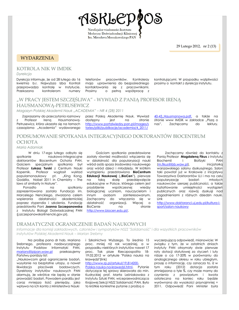 29 Lutego 2012, nr 2 (13) WYDARZENIA KOTROLA NIK W IMDIK Dyrekcja Dyrekcja informuje, że od 28 lutego do 16 kwietnia b.r. Najwyższa Izba Kontroli przeprowadza kontrolę w Instytucie. Przekazano kontrolerom numery telefonów pracowników. Kontrolerzy maja uprawnienia do bezpośredniego kontaktowania się z pracownikami. Prosimy o pełną współpracę z kontrolującymi. W przypadku wątpliwości prosimy o kontakt z dyrekcja instytutu. „W PRACY JESTEM SZCZĘŚLIWA” - WYWIAD Z PANIĄ PROFESOR IRENĄ HAUSMANOWĄ-PETRUSEWICZ Magazyn Polskiej Akademii Nauk „ACADEMIA” – NR 4 (28) 2011 Zapraszamy do przeczytania rozmowy z Profesor Ireną HausmanowąPetrusewicz, która ukazała się na łamach czasopisma „Academia” wydawanego przez Polską Akademię Nauk. Wywiad dostępny jest na stronie http://www.portalwiedzy.pan.pl/images/s tories/pliki/publikacje/academia/4_2011/ 40-43_Hausmanowa.pdf, a także na stronie www IMDiK w zakładce „Piszą o nas”. Zachęcamy do lektury. PODSUMOWANIE SPOTKANIA INTEGRACYJNEGO DOKTORANTÓW BIOCENTRUM OCHOTA Maria Adamiak W dniu 17-ego lutego odbyło się spotkanie naukowo-integracyjne doktorantów Biocentrum Ochota PAN. Gościem specjalnym spotkania był Profesor Łukasz Turski z Centrum Nauki Kopernik. Profesor wygłosił wykład popularnonaukowy pt. „King Kong, Godzilla, Nobel 2011 in Chemistry – The laws of similarity In Nature”. Ponadto na spotkaniu zaprezentowana została Fundacja im. Marcelego Nenckiego, stworzona celem wspierania działalności akademickiej poprzez stypendia i szkolenia. Fundację przedstawiła Pani Joanna Szczepanowska z Instytutu Biologii Doświadczalnej PAN ([email protected]). Gościom spotkania przedstawione zostały również możliwości włączenia się w działalność dla popularyzacji nauki wśród osób spoza środowiska naukowego oraz wśród dzieci i młodzieży. W krótkim wystąpieniu przedstawiono BioCentrum Edukacji Naukowej („BioCen”), pierwsze na taką skalę przedsięwzięcie edukacyjne w Polsce, którego celem jest przybliżenie współczesnej wiedzy biologicznej uczniom, nauczycielom i innym osobom zainteresowanym. Zachęcamy do włączania się w działalność organizacji. Więcej o BioCenie na stronie http://www.biocen.edu.pl/. Zachęcamy również do kontaktu z Panią Profesor Magdaleną Fikus z Instytutu Biochemii i Biofizyki PAN ([email protected]), inicjatorką warszawskiego salonu dyskusyjnego. Salon taki powstał już w Krakowie z inicjatywy Towarzystwa Doktorantów UJ i ma na celu popularyzację badań młodych naukowców szerszej publiczności, a także kształtowanie umiejętności wystąpień publicznych oraz rozwój dyskusji nad zagadnieniami z różnych dziedzin nauki. Link http://www.doktoranci.uj.edu.pl/kultura-isport/salon-naukowy DRAMATYCZNE OGRANICZENIE BADAŃ NAUKOWYCH Informacje dla komisji zakładowych, członków i sympatyków NSZZ "Solidarność" i dla wszystkich pracowników instytutów Polskiej Akademii Nauk – Marian Srebrny Na prośbę pana dr hab. Mariana Srebrnego, profesora nadzwyczajnego Instytutu Podstaw Informatyki PAN, [email protected] przekazujemy Państwu poniższy list: „Naukowcom grozi ograniczenie badań, wysyłanie na bezpłatne urlopy, a nawet likwidacja placówek badawczych. Dyrektorzy instytutów naukowych PAN alarmują, że wkrótce nie będą w stanie prowadzić badań. Powodem paraliżu jest coraz mniejsza ilość pieniędzy, jaka wpływa na ich konta z Ministerstwa Nauki i Szkolnictwa Wyższego. To średnio 15 proc. mniej niż rok wcześniej, a w przypadku niektórych instytutów nawet 17 proc. Tak pisze Rzeczpospolita 1819.02.2012 w artykule "Polska nauka na krawędzi"(link) http://www.rp.pl/artykul/19,814200Polska-nauka-na-krawedzi.html. Pytanie dotyczące tej sprawy skierowała do min. Kudryckiej prof. Marta Leśniakowska z Instytutu Sztuki PAN, wiceprzewodnicząca Krajowej Sekcji NSZZ Solidarność PAN. Było to krótkie konkretne pytanie z prośbą o wyczerpującą odpowiedź, mianowicie: W związku z tym, że w ostatnich dniach instytuty PAN otrzymały dwie pierwsze raty dotacji statutowej za styczeń i luty niższe o ca 17-20% w porównaniu do analogicznego okresu w roku ubiegłym, proszę o informację, czy oznacza to, iż w tym roku (2012) dotacja została zmniejszona o tyle %, czy może mamy do czynienia z prowizorium i kwota ostateczna na koniec roku będzie wyrównana do wysokości przynajmniej = 2011. Odpowiedź Pani Minister była krótka, zwięzła, gładka i cząstkowa: "Następne transze pieniędzy instytuty otrzymają w kolejnych 2-3 miesiącach, a w następnym tygodniu, mam nadzieje, wydany zostanie projekt Rozporządzenia Ministra." Kropka. Było to 15.02 na wspólnym posiedzeniu sejmowych Podkomisji stałych ds. nauki i szkolnictwa wyższego oraz ds. ekonomiki edukacji i nauki, z porządkiem dziennym: "Rozpatrzenie informacji Ministra Nauki i Szkolnictwa Wyższego na temat zasad finansowania nauki i szkolnictwa wyższego z uwzględnieniem kryteriów dystrybucji środków". Nagranie video z tego posiedzenia jest w całości dostępne (http://www.sejm.gov.pl/sejm7.nsf/transm isje.xsp?unid=30326EF781CCC126C125799 D003A240F). Prof. Marta Leśniakowska jest w środku planu. Nasze pytanie jest około godz. 16:56-58. Poparcie przedstawiciela Krajowej Sekcji Nauki Solidarności - około 17:12, Wiceprezesa PAN 17:20. Odpowiedz Pani Minister - 17:56-57. W dyskusji posłanka Łybacka (SLD) zgłosiła ok 16:48 ważną propozycję wprowadzenia do ustawy budżetowej 1% odpisu od podatku CIT, płaconego przez przedsiębiorstwa i firmy, na badania naukowe w wybranej przez płatnika jednostce naukowej. Jeśli przejdzie, miałoby to działać od przyszłego roku na takich zasadach jak 1% odpisu z PIT-u. (Wybór jednostki obdarowanej należy do darczyńcy.) Taki odpis działa we Francji z powodzeniem od wielu lat. Wg danych zebranych przez Solidarność PAN i Inicjatywę Obywatelska Instytutów PAN, jest to już drugi rok ograniczania bad