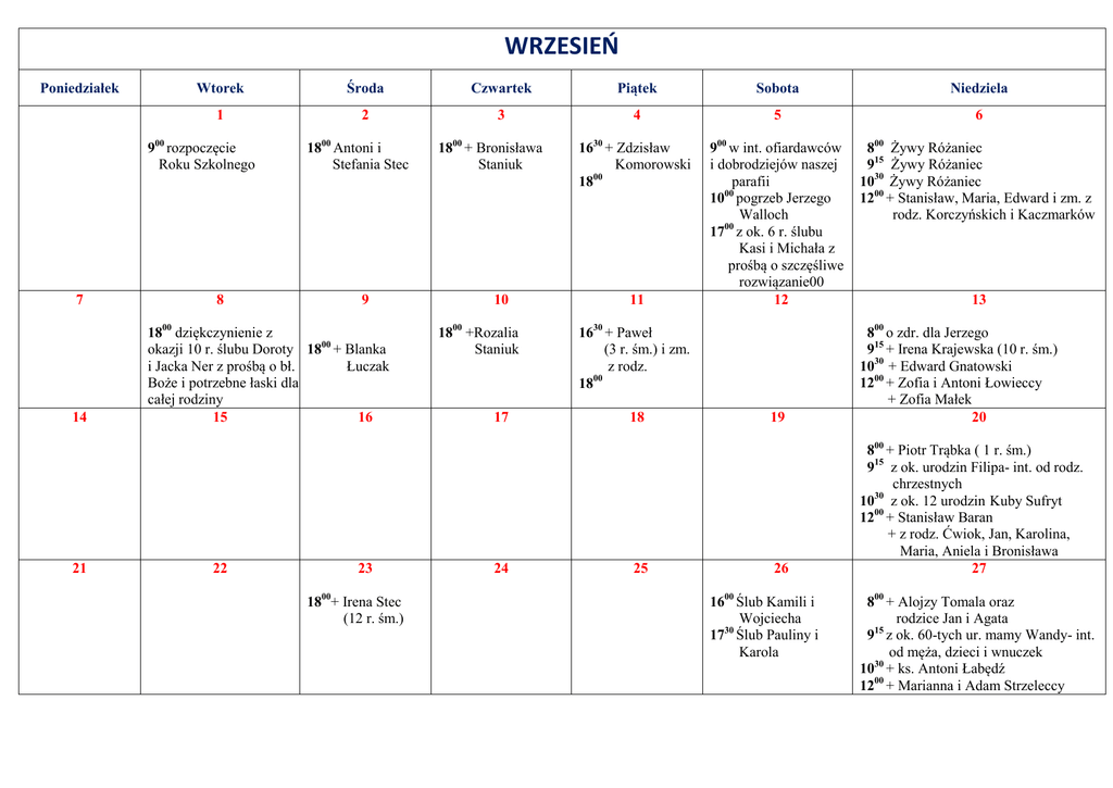 WRZESIEŃ Poniedziałek Wtorek Środa Czwartek Piątek Sobota Niedziela 1 2 3 4 5 6 1630 + Zdzisław Komorowski 1800 900 w int. ofiardawców i dobrodziejów naszej parafii 1000 pogrzeb Jerzego Walloch 1700 z ok. 6 r. ślubu Kasi i Michała z prośbą o szczęśliwe rozwiązanie00 12 800 Żywy Różaniec 915 Żywy Różaniec 1030 Żywy Różaniec 1200 + Stanisław, Maria, Edward i zm. z rodz. Korczyńskich i Kaczmarków 900 rozpoczęcie Roku Szkolnego 7 14 21 8 1800 Antoni i Stefania Stec 9 1800 dziękczynienie z okazji 10 r. ślubu Doroty 1800 + Blanka i Jacka Ner z prośbą o bł. Łuczak Boże i potrzebne łaski dla całej rodziny 15 16 22 23 1800+ Irena Stec (12 r. śm.) 1800 + Bronisława Staniuk 10 1800 +Rozalia Staniuk 17 24 11 1630 + Paweł (3 r. śm.) i zm. z rodz. 1800 18 25 13 19 800 o zdr. dla Jerzego 915 + Irena Krajewska (10 r. śm.) 1030 + Edward Gnatowski 1200 + Zofia i Antoni Łowieccy + Zofia Małek 20 26 800 + Piotr Trąbka ( 1 r. śm.) 915 z ok. urodzin Filipa- int. od rodz. chrzestnych 1030 z ok. 12 urodzin Kuby Sufryt 1200 + Stanisław Baran + z rodz. Ćwiok, Jan, Karolina, Maria, Aniela i Bronisława 27 1600 Ślub Kamili i Wojciecha 1730 Ślub Pauliny i Karola 800 + Alojzy Tomala oraz rodzice Jan i Agata 915 z ok. 60-tych ur. mamy Wandy- int. od męża, dzieci i wnuczek 1030 + ks. Antoni Łabędź 1200 + Marianna i Adam Strzeleccy 28 29 1800 + Janina Myśliwiec (miesiąc po pogrzebie) 30 1800 w int. Agnieszki z ok. urodzin