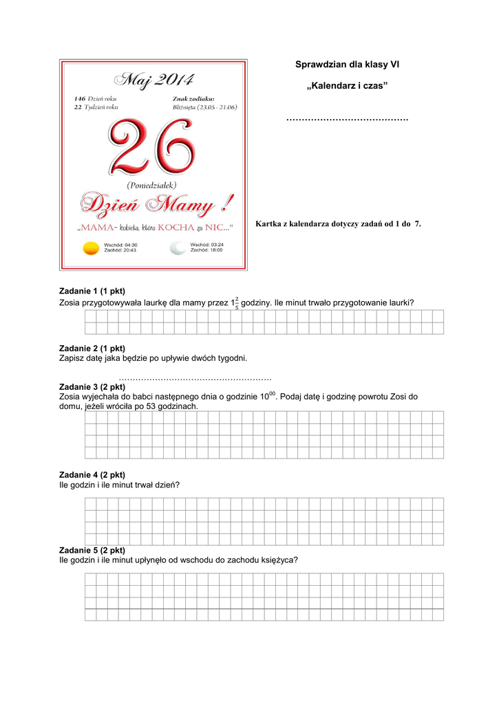 Sprawdzian dla klasy VI „Kalendarz i czas” …………………………………. Kartka z kalendarza dotyczy zadań od 1 do 7. Zadanie 1 (1 pkt) 2 Zosia przygotowywała laurkę dla mamy przez 1 godziny. Ile minut trwało przygotowanie laurki? 5 Zadanie 2 (1 pkt) Zapisz datę jaka będzie po upływie dwóch tygodni. ………………………………………………. Zadanie 3 (2 pkt) 00 Zosia wyjechała do babci następnego dnia o godzinie 10 . Podaj datę i godzinę powrotu Zosi do domu, jeżeli wróciła po 53 godzinach. Zadanie 4 (2 pkt) Ile godzin i ile minut trwał dzień? Zadanie 5 (2 pkt) Ile godzin i ile minut upłynęło od wschodu do zachodu księżyca? Zadanie 6 (3 pkt) Dzień Ojca obchodzony jest 23 czerwca. Za ile dni było święto taty i jaki to był dzień tygodnia w 2014 roku? Zadanie 7 (3 pkt) Ile dni pozostało do końca 2014r. W jakim dniu tygodnia był ostatni dzień 2014 roku? Zadanie 8 (2 pkt) a) Jaką częścią godziny jest 42 minuty? b) 7 12 minuty. Ile to sekund? Zadanie 9 (3 pkt) Zosia uczestniczyła w wycieczce klasowej do Krakowa. Zwiedzanie Wawelu zajęło im 3,5 godziny co stanowiło 7 16 całego czasu wycieczki. Oblicz ile godzin trwała wycieczka? Zadanie 10 (3 pkt) Uzupełnij tabelę Rok Który to wiek Czy rok jest przestępny czy nieprzestępny 1524 1700 2001 1600 972 1322 Opracowała: Krystyna Kozik Nauczyciel matematyki