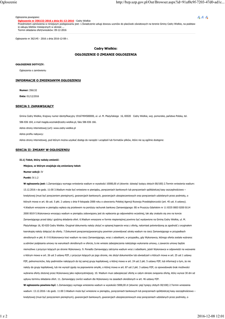Ogłoszenie 1z2 http://bzp.uzp.gov.pl/Out/Browser.aspx?id=91af0c9f-7203-47d0-ad1c... Ogłoszenia powiązane: Ogłoszenie nr 356132-2016 z dnia 01-12-2016 - Cedry Wielkie Przedmiotem zamówienia w niniejszym postępowaniu jest: 1.Świadczenie usługi dowozu uczniów do placówek oświatowych na terenie Gminy Cedry Wielkie, na podstaw ie zakupu biletów miesięcznych w okresie ... Termin składania ofert/wniosków: 09-12-2016 Ogłoszenie nr 362145 - 2016 z dnia 2016-12-08 r. Cedry Wielkie: OGŁOSZENIE O ZMIANIE OGŁOSZENIA OGŁOSZENIE DOTYCZY: Ogłoszenia o zamówieniu INFORMACJE O ZMIENIANYM OGŁOSZENIU Numer: 356132 Data: 01/12/2016 SEKCJA I: ZAMAWIAJĄCY Gmina Cedry Wielkie, Krajowy numer identyfikacyjny 19167494500000, ul. ul. M. Płażyńskiego 16, 83020 Cedry Wielkie, woj. pomorskie, państwo Polska, tel. 586 836 164, e-mail [email protected], faks 586 836 166. Adres strony internetowej (url): www.cedry-wielkie.pl Adres profilu nabywcy: Adres strony internetowej, pod którym można uzyskać dostęp do narzędzi i urządzeń lub formatów plików, które nie są ogólnie dostępne: SEKCJA II: ZMIANY W OGŁOSZENIU II.1) Tekst, który należy zmienić: Miejsce, w którym znajduje się zmieniany tekst: Numer sekcji: IV Punkt: IV.1.2 W ogłoszeniu jest: 1.Zamawiający wymaga wniesienia wadium w wysokości 10000,00 zł (słownie: dziesięć tysięcy złotych 00/100) 2.Termin wniesienia wadium: 13.12.2016 r do godz. 11:00 3.Wadium może być wniesione w pieniądzu, poręczeniach bankowych lub poręczeniach spółdzielczej kasy oszczędnościowo – kredytowej (musi być poręczeniem pieniężnym), gwarancjach bankowych, gwarancjach ubezpieczeniowych oraz poręczeniach udzielanych przez podmioty, o których mowa w art. 6b ust. 5 pkt. 2 ustawy z dnia 9 listopada 2000 roku o utworzeniu Polskiej Agencji Rozwoju Przedsiębiorczości (art. 45 ust. 6 ustawy). 4.Wadium wnoszone w pieniądzu wpłaca się przelewem na poniższy rachunek bankowy Zamawiającego: BS w Pruszczu Gdańskim nr 11 8335 0003 0200 0114 2000 0019 5.Wykonawca wnoszący wadium w pieniądzu zobowiązany jest do wpłacenia go odpowiednio wcześniej, tak aby znalazło się ono na koncie Zamawiającego przed datą i godziną składania ofert. 6.Wadium wnoszone w formie niepieniężnej powinno być wystawione na Gminę Cedry Wielkie, ul. M. Płażyńskiego 16, 83-020 Cedry Wielkie. Oryginał dokumentu należy złożyć w opisanej kopercie wraz z ofertą, natomiast potwierdzoną za zgodność z oryginałem kserokopię należy dołączyć do oferty. 7.Dokument poręczenia/gwarancyjny powinien przewidywać utratę wadium na rzecz Zamawiającego w przypadkach określonych w pkt. 8 i 9 8.Wykonawca traci wadium na rzecz Zamawiającego, wraz z odsetkami, w przypadku, gdy Wykonawca, którego oferta została wybrana: a.odmówi podpisania umowy na warunkach określonych w ofercie, b.nie wniesie zabezpieczenia należytego wykonania umowy, c.zawarcie umowy będzie niemożliwe z przyczyn leżących po stronie Wykonawcy. 9. Ponadto Zamawiający zatrzyma wadium wraz z odsetkami, jeżeli Wykonawca w odpowiedzi na wezwanie o którym mowa w art. 26 ust 3 ustawy PZP, z przyczyn leżących po jego stronie, nie złożył dokumentów lub oświadczeń o których mowa w art. 25 ust 1 ustawy PZP, pełnomocnictw, listy podmiotów należących do tej samej grupy kapitałowej, o której mowa w art. 24 ust 2 pkt. 5 ustawy PZP, lub informacji o tym, że nie należy do grupy kapitałowej, lub nie wyraził zgody na poprawienie omyłki, o której mowa w art. 87 ust 2 pkt. 3 ustawy PZP, co spowodowało brak możliwości wybrania oferty złożonej przez Wykonawcę jako najkorzystniejszej. 10. Wadium musi zabezpieczać ofertę w całym okresie związania ofertą, który wynosi 30 dni od upływu terminu składania ofert. 11. Zamawiający zwróci wadium dla Wykonawcy na zasadach określonych w art. 46 ustawy PZP. W ogłoszeniu powinno być: 1.Zamawiający wymaga wniesienia wadium w wysokości 5000,00 zł (słownie: pięć tysięcy złotych 00/100) 2.Termin wniesienia wadium: 13.12.2016 r do godz. 11:00 3.Wadium może być wniesione w pieniądzu, poręczeniach bankowych lub poręczeniach spółdzielczej kasy oszczędnościowo – kredytowej (musi być poręczeniem pieniężnym), gwarancjach bankowych, gwarancjach ubezpieczeniowych oraz poręczeniach udzielanych przez podmioty, o 2016-12-08 12:01 Ogłoszenie http://bzp.uzp.gov.pl/Out/Browser.aspx?id=91af0c9f-7203-47d0-ad1c... których mowa w art. 6b ust. 5 pkt. 2 ustawy z dnia 9 listopada 2000 roku o utworzeniu Polskiej Agencji Rozwoju Przedsiębiorczości (art. 45 ust. 6 ustawy). 4.Wadium wnoszone w pieniądzu wpłaca się przelewem na poniższy rachunek bankowy Zamawiającego: BS w Pruszczu Gdańskim nr 11 8335 0003 0200 0114 2000 0019 5.Wykonawca wnoszący wadium w pieniądzu zobowiązany jest do wpłacenia go odpowiednio wcześniej, tak aby znalazło się ono na koncie Zamawiającego przed datą i godziną składania ofert. 6.Wadium wnoszone w formie niepieniężnej powinno być wystawione na Gminę Cedry Wielkie, ul. M. Płażyńskiego 16, 83-020 Cedry Wielkie. Oryginał dokumentu należy złożyć w opisanej kopercie wraz z ofertą, natomiast potwierdzoną za zgodność z oryginałem kserokopię należy dołączyć do oferty. 7.Dokument poręczenia/gwarancyjny powinien przewidywać utratę wadium na rzecz Zamawiającego w przypadkach określonych w pkt. 8 i 9 8.Wykonawca traci wadium na rzecz Zamawiającego, wraz z odsetkami, w przypadku, gdy Wykonawca, którego oferta została wybrana: a.odmówi podpisania umowy na warunkach określonych w ofercie, b.nie wniesie zabezpieczenia należytego wykonania umowy, c.zawarcie umowy będzie niemożliwe z przyczyn leżących po stronie Wykonawcy. 9. Ponadto Zamawiający zatrzyma wadium wraz z odsetkami, jeżeli Wykonawca w odpowiedzi na wezwanie o którym mowa w art. 26 ust 3 ustawy PZP, z przyczyn leżących po jego stronie, nie złożył dokumentów lub oświadczeń o których
