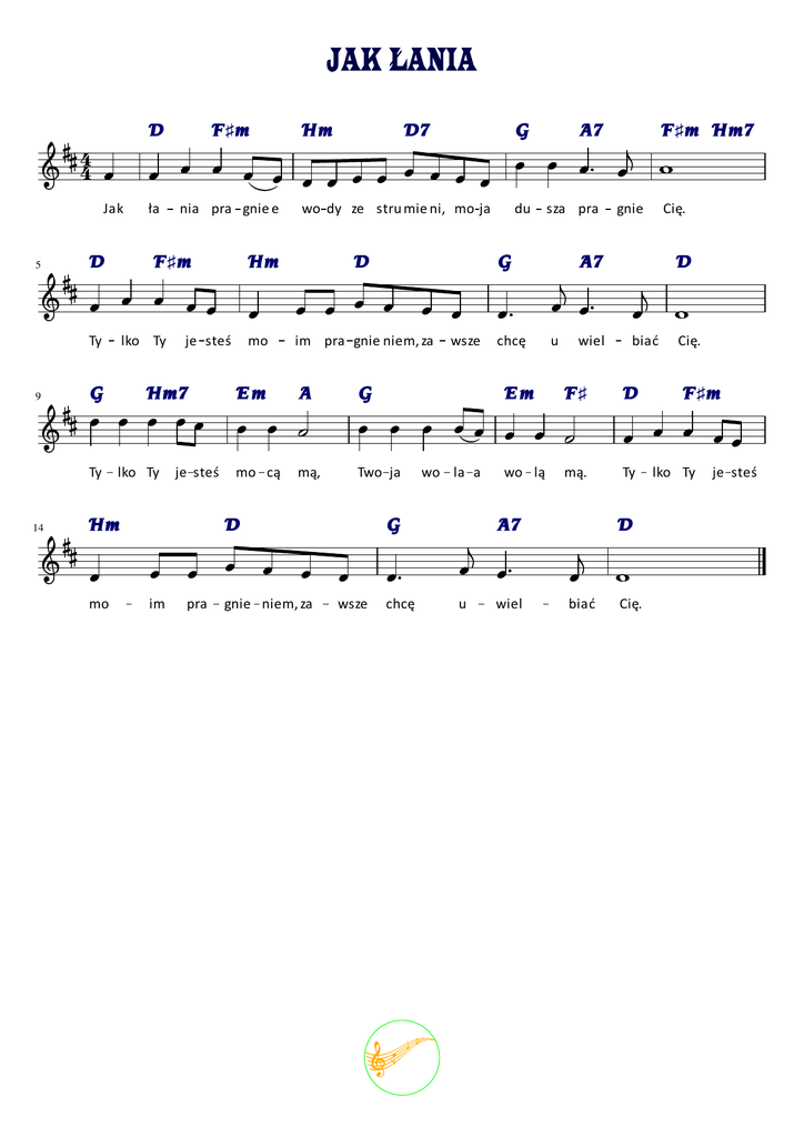 JAK ŁANIA D 4 4 Jak D 5 F ♯m 14 A7 F ♯m Hm7 ła Cię. nia pra gnie e lko Ty je steś Hm7 lko Ty D mo im pra gnie niem, za A wsze G sza pra gnie A7 D chcę u biać Cię. Em wiel F♯ D F ♯m mo cą Two ja Ty mą, D du G Em je steś Hm wo dy ze stru mie ni, mo ja Hm Ty G F ♯m G 9 D7 Ty Hm wo la a G mo im pra gnie niem, za wo lą A7 wsze chcę u C mą. wiel D biać Cię. lko Ty je steś