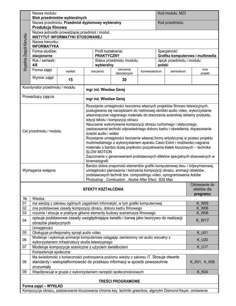 Nazwa modułu: Blok przedmiotów wybieralnych Nazwa przedmiotu: Przedmiot dyplomowy wybieralny Kod modułu: M23 Kod przedmiotu: Wypełnia Zespół Kierunku Produkcja filmowa Nazwa jednostki prowadzącej przedmiot / moduł: INSTYTUT INFORMATYKI STOSOWANEJ Nazwa kierunku: INFORMATYKA Forma studiów: Profil kształcenia: Specjalność: stacjonarne PRAKTYCZNY Grafika komputerowa i multimedia Rok / semestr: Status przedmiotu /modułu: Język przedmiotu / modułu: 4/8 wybieralny polski ćwiczenia inne Forma zajęć wykład ćwiczenia konwersatorium seminarium laboratoryjne projekt Wymiar zajęć 15 Koordynator przedmiotu / modułu Prowadzący zajęcia Cel przedmiotu / modułu Wymagania wstępne 30 mgr inż. Wiesław Gerej mgr inż. Wiesław Gerej Rozwijanie umiejętności tworzenia własnych projektów filmowo telewizyjnych, posługiwania się narzędziami do nieliniowej obróbki audio video, wykorzystanie własnoręcznie nagranego materiału do stworzenia autorskiej reklamy produktu, edycji tekstu i kompozycji obrazu Nauczenie wykonywania kompozycji obrazu ruchomego i statycznego, zastosowanie techniki odpowiedniego doboru kadru i oświetlenia, dopasowanie ścieżki audio i wideo Rozwijanie umiejętności tworzenia własnej formy artystycznej w postaci projektu multimedialnego z wykorzystaniem aparatu Casio Exlim i możliwości nagrania materiału o bardzo dużej prędkości pozyskiwania klatek kluczowych – technika SLOW MOTION Zapoznanie z generowaniem podstawowych efektów specjalnych stosowanych w kinematografii Bardzo dobra znajomość elementów grafiki komputerowej dwu- i trójwymiarowej, umiejętności planowania i tworzenia kompozycji obrazu, animacji obiektów, podstawowych technik tzw. compositingu video, oprogramowania Adobe Photoshop , Combustion , Abobe After Efect, 3DS Max Odniesienie do EFEKTY KSZTAŁCENIA efektów dla programu Nr 01 02 03 Wiedza ma wiedzę z zakresu ogólnych zagadnień informatyki, w tym grafiki komputerowej zna podstawowe zasady kompozycji obrazu, doboru kadru filmowego rozumie i stosuje w praktyce główne elementy budowy scenariusza filmowego 04 opisuje podstawowe zasady uwzględniające światło i barwę jako tworzywo do realizacji obrazów plastycznych 05 06 07 Umiejętności Obsługuje profesjonalny sprzęt audio video Modeluje i wykonuje animacje komputerowe osiągając zamierzony cel audio wizualny z wykorzystaniem infrastruktury studia telewizyjnego Modeluje kompozycje sceniczne z użyciem światłocieni K_W05 K_W06 K_W06 K_W17 K_U01 K_U20 K_U17 Kompetencje społeczne Ma świadomość z konieczności podnoszenia poziomu wiedzy z zakresu IT. Stosuje otwarte 08 standardy i wieloplatformowość do przekazu informacji w sposób powszechnie zrozumiały 09 Współpracuje w grupie z wykorzystaniem narzędzi społecznościowych K_K01, K_K06 K_K04 TREŚCI PROGRAMOWE Forma zajęć – WYKŁAD Kompozycja obrazu, zastosowanie kluczowania chroma key, techniki greenbox, algorytm Diamond Keyer, omówienie podstawowych filtrów (Fast Gaussian Blur). Omówienie i analiza kreowania podstawowych cyfrowych efektów specjalnych z zastosowaniem aplikacji Combustion 4.0, korekcji kolorów, stabilizacji obrazu, malowania i rotowania wektorowego, efektów tekstowych, edycji form krótkometrażowych, wyrażeń, efektów końcowych w formacie Flash i innych. Realistyczna symulacja płynów i innych obiektów z zakresu fizyki ogólnej za pomocą programu Realflow. Forma zajęć – LABORATORIUM Podczas zajęć laboratoryjnych studenci zapoznają się ze sposobem działania i funkcjonowania studia telewizji, budową podstawowych składowych studia, sposobem przepływu danych wewnątrz studia, rodzajem sprzętu audio video. Studenci wykonają własne nagrania materiału, wraz z edycją nieliniową audio video, kluczowaniem, nadawaniem efektów specjalnych za pomocą aplikacji Combustion. Głównym zadaniem jest wykonanie profesjonalnego materiału audio video w postaci reklamy telewizyjnej, reportażu, animacji komputerowej wraz z kluczowaniem i zastosowaniem trakingu obrazu rzeczywistego. Metody kształcenia Wykład z prezentacją multimedialną z omawianiem zagadnień problemowych. Laboratoria z dyskusją uzyskanych wyników z zastosowaniem metody projektów oraz tekstu przewodniego. Nr efektu kształcenia z sylabusa 02,03,05,07, 08, 09, 01,04 06 Metody weryfikacji efektów kształcenia Projekt praktyczny Rozwiązywanie zadań laboratoryjnych Dyskusja Forma i warunki zaliczenia Wykład: egzamin pisemny, Laboratorium: projekt, dwa kolokwia w semestrze Literatura podstawowa 1. 3D Studio MAX. Czarna księga animatora, S. Kennedy, G. Maestri, R. Frantz 1998, wydawnictwo Helion 2. 3D Studio MAX 3.x. Techniki i narzędzia animacyjne. Biblia, Kelly L. Murdock 2001, wydawnictwo Helion 3. Adobe After Effects CS4. Oficjalny podręcznik, Adobe Creative Team 2009, wydawnictwo Helion 4. MAX 3.x. Techniki i narzędzia animacyjne. Biblia, Kelly L. Murdock 2001, wydawnictwo Helion 5. Adobe After Effects CS4. Oficjalny podręcznik, Adobe Creative Team 2009, wydawnictwo Helion Literatura uzupełniająca NAKŁAD PRACY STUDENTA: Udział w wykładach Samodzielne studiowanie tematyki wykładów Udział w ćwiczeniach audytoryjnych i laboratoryjnych* Samodzielne przygotowywanie się do ćwiczeń* Przygotowanie projektu / eseju / itp. * Przygotowanie się do egzaminu / zaliczenia Udział w konsultacjach Inne ŁĄCZNY nakład pracy studenta w godz. Liczba punktów ECTS za przedmiot Obciążenie studenta związane z zajęciami praktycznymi* Obciążenie studenta na zajęciach wymagających bezpośredniego udziału nauczycieli akademickich Liczba godzin 15 5 30 15 20 10 5 100 4 ECTS 65 2,6 ECTS 50 2 ECTS