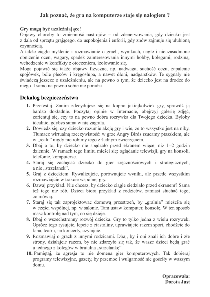 Jak poznać, że gra na komputerze staje się nałogiem ? Gry mogą być uzależniające! Objawy choroby to zmienność nastrojów – od zdenerwowania, gdy dziecko jest z dala od sprzętu grającego, do uspokojenia i euforii, gdy znów zajmuje się ulubioną czynnością. A także ciągłe myślenie i rozmawianie o grach, wynikach, nagłe i nieuzasadnione obniżenie ocen, wagary, spadek zainteresowania innymi hobby, kolegami, rodziną, wchodzenie w konflikty z otoczeniem, izolowanie się. Mogą pojawić się także objawy fizyczne, np. nadwaga, suchość oczu, zapalenie spojówek, bóle pleców i kręgosłupa, a nawet dłoni, nadgarstków. Te sygnały nie świadczą jeszcze o uzależnieniu, ale na pewno o tym, że dziecko jest na drodze do niego. I samo na pewno sobie nie poradzi. Dekalog bezpieczeństwa 1. Przetestuj. Zanim zdecydujesz się na kupno jakiejkolwiek gry, sprawdź ją bardzo dokładnie. Poczytaj opinie w Internacie, obejrzyj galerię zdjęć, zorientuj się, czy to na pewno dobra rozrywka dla Twojego dziecka. Byłoby idealnie, gdybyś sama w nią zagrała. 2. Dowiedz się, czy dziecko rozumie akcję gry i wie, że to wszystko jest na niby. Tłumacz wirtualną rzeczywistość: w grze Angry Birds rzucamy ptaszkiem, ale w „realu” nigdy nie robimy tego z żadnym zwierzęciem. 3. Dbaj o to, by dziecko nie spędzało przed ekranem więcej niż 1–2 godzin dziennie. W ramach tego limitu mieści się: oglądanie telewizji, gry na konsoli, telefonie, komputerze. 4. Staraj się zachęcać dziecko do gier zręcznościowych i strategicznych, a nie „strzelanek”. 5. Graj z dzieckiem. Rywalizujcie, porównujcie wyniki, ale przede wszystkim rozmawiajcie w trakcie wspólnej gry. 6. Dawaj przykład. Nie chcesz, by dziecko ciągle siedziało przed ekranem? Sama też tego nie rób. Dzieci biorą przykład z rodziców, zamiast słuchać tego, co mówią. 7. Staraj się tak zaprojektować domową przestrzeń, by „gralnia” mieściła się w części wspólnej, np. w salonie. Tam ustaw komputer, konsolę. W ten sposób masz kontrolę nad tym, co się dzieje. 8. Dbaj o wszechstronny rozwój dziecka. Gry to tylko jedna z wielu rozrywek. Oprócz tego rysujcie, lepcie z ciastoliny, uprawiajcie razem sport, chodźcie do kina, teatru, na koncerty, czytajcie. 9. Rozmawiaj o grach z innymi rodzicami. Dbaj, by i oni znali ich dobre i złe strony, działajcie razem, by nie zdarzyło się tak, że wasze dzieci będą grać u jednego z kolegów w brutalną „strzelankę”. 10. Pamiętaj, że agresja to nie domena gier komputerowych. Tak dobieraj programy telewizyjne, gazety, by przemoc i wulgarność nie gościły w waszym domu. Opracowała: Dorota Just