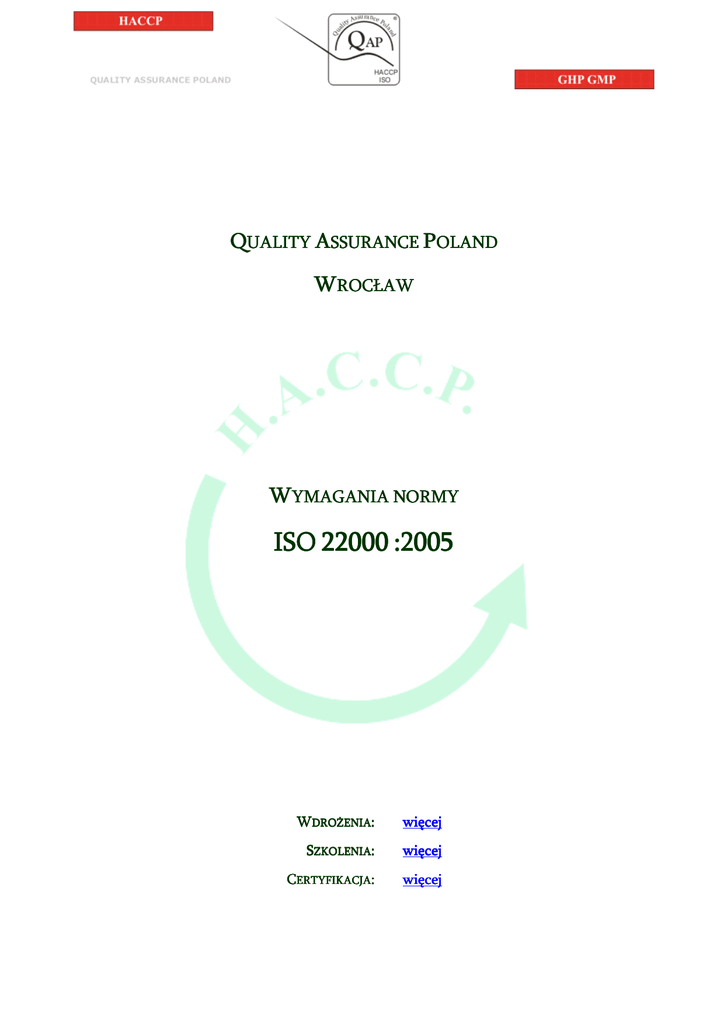 QUALITY ASSURANCE POLAND WROCŁAW WYMAGANIA NORMY ISO 22000 :2005 WDROŻENIA: więcej SZKOLENIA: więcej CERTYFIKACJA: więcej 1 Zakres normy ISO 22000 2 3 4 Powołania normatywne i odniesienia Terminy i definicje zastosowane w normie System zarządzania ISO 22000 4.1 4.2 5 5.1 5.2 5.3 5.4 5.5 5.6 5.7 5.8 6 6.1 6.2 6.3 6.4 7 7.1 7.2 7.3 7.4 7.5 7.6 7.7 7.8 7.9 7.10 8 8.1 8.2 8.3 8.4 8.5 Wymagania ogólne systemu Wymagania w zakresie dokumentacji Odpowiedzialność najwyższego kierownictwa Zaangażowanie najwyższego kierownictwa Polityka bezpieczeństwa żywności lub pasz Planowanie systemu bezpieczeństwa żywności wg ISO 22000 Odpowiedzialność i uprawnienia w firmie Przewodniczący zespołu ds. HACCP Komunikacja wewnętrzna i zewnętrzna Reagowanie na sytuacje awaryjne, wycofanie z rynku (recall) Przegląd systemu zarządzania bezpieczeństwem żywności lub pasz Zarządzanie zasobami w organizacji Zapewnienie zasobów niezbędnych do realizacji polityki Zasoby ludzkie oraz szkolenia Wyposażenie i infrastruktura w organizacji Środowisko pracy Planowanie i realizacja bezpiecznych produktów Postanowienia ogólne Programy warunków wstępnych (PRP) Działania wstępne umożliwiające analizę zagrożeń w systemie HACCP Analiza zagrożeń w systemie HACCP Operacyjne programy wstępne (PRP) Ustanowienie i wdrożenie planu HACCP Aktualizacja informacji oraz dokumentacji PRP i HACCP Planowanie weryfikacji i audytów wewnętrznych System identyfikacji i identyfikowalności Nadzór nad nieprawidłowościami Walidacja i weryfikacja systemu oraz doskonalenie Postanowienia ogólne w zakresie weryfikacji Walidacja wybranych środków nadzoru Kontrola monitorowania i pomiarów w procesach Weryfikacja Doskonalenie systemu zarządzania bezpieczeństwem żywności ZAŁĄCZNIK A Powiązania ISO 22000:2005 oraz ISO 9001:2008 ZAŁĄCZNIK B Powiązania systemu HACCP i ISO 22000:2005 ZAŁĄCZNIK C Odniesienia do Codex Alimentarius www.haccp-polska.pl tel. 71 733-67-67; tel. 605-660-993 ul. Żernicka 296, Wrocław Strona: 2/2