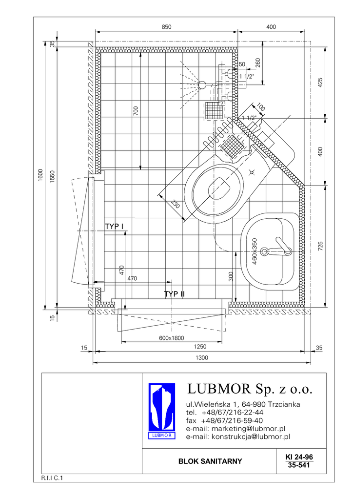 400 260 35 850 50 425 1 1/2" 700 0 10 1550 1600 400 1 1/2" 0 23 725 300 470 460x350 TYP I 470 15 TYP II 600x1800 1250 15 35 1300 LUBMOR Sp. z o.o. LUBMOR ul.Wieleñska 1, 64-980 Trzcianka tel. +48/67/216-22-44 fax +48/67/216-59-40 e-mail: [email protected] e-mail: [email protected] BLOK SANITARNY R.f.l C.1 KI 24-96 35-541 BLOK SANITARNY PRZEZNACZENIE WYROBU Blok sanitarny z natryskiem przeznaczony jest do montażu na statkach jako kompletna łazienka do obsługi kabin załogi lub pasażerów. Blok taki może być również zainstalowany w pomieszczeniach budynków lądowych. WYKONANIE WYROBU Korpus bloku wykonany jest ze ścianek o grubości 33 mm utworzonych z kaset z blachy stalowej ocynkowanej wypełnionych wełną mineralną. Kasety wewnętrzne ścianek o grubości 0,75 mm - pokryte folią PCV, lub o grubości 1,5 mm - wyklejone płytkami ceramicznymi. Kasety zewnętrzne mają grubość 0,75 mm. Podłoga wykonana z blachy stalowej podzielona jest na część prysznicową i ogólną. Zewnętrzne i wewnętrzne powierzchnie podłogi zabezpieczone są antykorozyjnie. Podłoga wyklejona jest płytkami ceramicznymi przeciwślizgowymi z gretingiem w natrysku. Sufit tworzą dwie blachy stalowe ocynkowane o grubości 0,75mm izolowane wewnątrz wełną mineralną. Kasety dolne ścianek sufitowych pokryte są folią PCV lub powłoką lakierniczą. W bloku zamontowane są drzwi klasy B-15 ze skrzydłem wykonanym z blachy pokrytej folią PCV i wypełnionym wełną mineralną lub z płyty mineralnej pokrytej laminatem dekoracyjnym. Wyposażenie bloku mogą stanowić : - uchwyty sztormowe - miska ustępowa wisząca - umywalka z bateria - wieszaki na ręcznik - bateria natryskowa z termostatem lub bez termostatu - zasłona prysznicowa - wieszaki na płaszcze kąpielowe - anemostat wyciągowy ∅80mm/∅100mm - koszyk na mydło i gąbkę - grzejnik elektryczny 400W lub ogrzewanie podłogowe - uchwyt na papier toaletowy + zapasowy - koszyk na mydło - szafka toaletowa lub lustro - szczotka WC - lampa naścienna z gniazdkiem do golarki - inne wg życzenia Rurociągi doprowadzające ciepłą i zimną wodę izolowane są przeciwpotnie. Rurociągi wewnątrz bloku pokryte są powłoką niklowo-chromową. ZAKRES DOSTAWY Dostawa obejmuje kompletnie wyposażony blok sanitarny przystosowany do podłączenia do instalacji wodnej i elektrycznej. Blok sanitarny może być dostarczony w całości lub w częściach (do zamontowania w miejscu przeznaczenia). OPAKOWANIE, TRANSPORT, MAGAZYNOWANIE Bloki sanitarne opakowane są folią, drzwi zabezpieczone są płytą pilśniową. Przemieszczanie bloków odbywa się za pomocą wózków widłowych lub dźwigów. Muszą być składowane w zamkniętych pomieszczeniach magazynowych. Bloki sanitarne dostarczane w częściach pakowane są w skrzynie drewniane. PODZIAŁ, OZNACZENIE I WYKOŃCZENIE Odmiany : P - prawy - jak na rysunku L - lewy - jako lustrzane odbicie Typy : I - jak na rysunku II - jak na rysunku Kierunki otwierania drzwi : A - L/P - drzwi otwierane na zewnątrz lewe lub prawe Wyposażenie : 1 - umywalka 2 - natrysk z brodzikiem 5 - miska ustępowa Rodzaj spłukiwania : a - system grawitacyjny c - system podciśnieniowy PRZYKŁAD OZNACZENIA Blok sanitarny o wymiarach 1300x1600 prawy, typu I z drzwiami lewymi otwieranymi na zewnątrz wyposażony w umywalkę, natrysk z brodzikiem, miskę ustępową ze spłukiwaniem grawitacyjnym. BLOK SANITARNY 1300x1600-P-IA-L-125a wg karty informacyjnej nr KI 24-96/35-541.