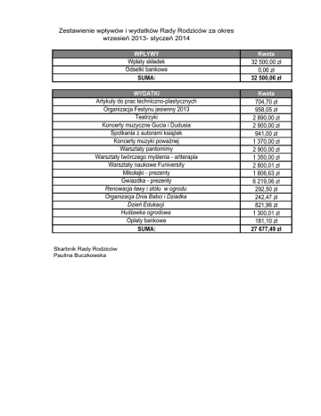 Zestawienie wpływów i wydatków Rady Rodziców za okres wrzesień 2013- styczeń 2014 WPŁYWY Wpłaty składek Odsetki bankowe SUMA: Kwota 32 500,00 zł 0,06 zł 32 500,06 zł WYDATKI Artykuły do prac techniczno-plastycznych Organizacja Festynu jesienny 2013 Teatrzyki Koncerty muzyczne Gucia i Dudusia Spotkania z autorami książek Koncerty muzyki poważnej Warsztaty pantomimy Warsztaty twórczego myślenia - artterapia Warsztaty naukowe Funiversity Mikołajki - prezenty Gwiazdka - prezenty Renowacja ławy i stółu w ogrodu Organizacja Dnia Babci i Dziadka Dzień Edukacji Huśtawka ogrodowa Opłaty bankowe SUMA: Kwota 704,70 zł 958,05 zł 2 890,00 zł 2 900,00 zł 941,00 zł 1 370,00 zł 2 900,00 zł 1 350,00 zł 2 800,01 zł 1 806,63 zł 6 219,06 zł 292,50 zł 242,47 zł 821,96 zł 1 300,01 zł 181,10 zł 27 677,49 zł Skarbnik Rady Rodziców Paulina Buczkowska