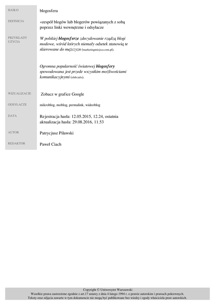 HASŁO blogosfera DEFINICJA «zespół blogów lub blogerów powiązanych z sobą poprzez linki wewnętrzne i odsyłacze» PRZYKŁADY UŻYCIA W polskiej blogosferze zdecydowanie rządzą blogi modowe, wśród których niemały odsetek stanowią te skierowane do mężczyzn (marketingmiejsca.com.pl). Ogromna popularność światowej blogosfery spowodowana jest przede wszystkim możliwościami komunikacyjnymi (ebib.info). WIZUALIZACJE Zobacz w grafice Google ODSYŁACZE mikroblog, moblog, permalink, wideoblog DATA Rejestracja hasła: 12.05.2015, 12.24, ostatnia aktualizacja hasła: 29.08.2016, 11.53 AUTOR Patrycjusz Pilawski REDAKTOR Paweł Ciach Copyright © Uniwersytet Warszawski Wszelkie prawa zastrzeżone zgodnie z art.17 ustawy z dnia 4 lutego 1994 r. o prawie autorskim i prawach pokrewnych. Teksty oraz zdjęcia zawarte w tym dokumencie nie mogą być publikowane bez wiedzy i zgody właściciela praw autorskich. Powered by TCPDF (www.tcpdf.org)