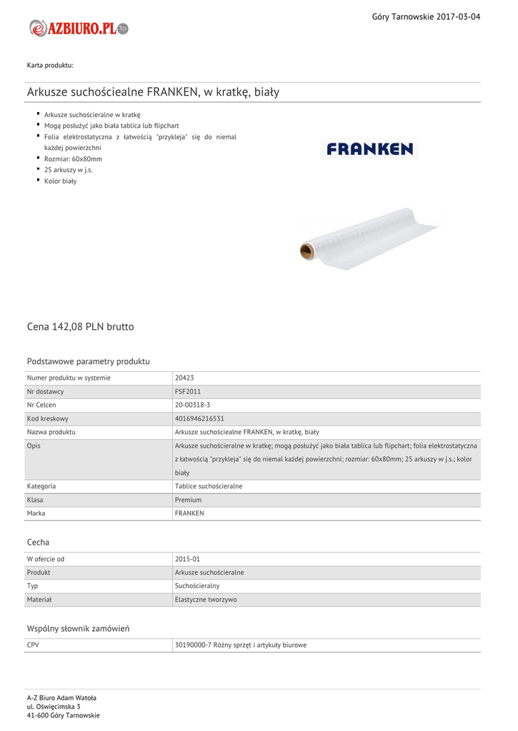 Góry Tarnowskie 2017-03-04 Karta produktu: Arkusze suchościealne FRANKEN, w kratkę, biały Arkusze suchościeralne w kratkę Mogą posłużyć jako biała tablica lub flipchart Folia elektrostatyczna z łatwością "przykleja" się do niemal każdej powierzchni Rozmiar: 60x80mm 25 arkuszy w j.s. Kolor biały Cena 142,08 PLN brutto Podstawowe parametry produktu Numer produktu w systemie 20423 Nr dostawcy FSF2011 Nr Celcen 20-00318-3 Kod kreskowy 4016946216531 Nazwa produktu Arkusze suchościealne FRANKEN, w kratkę, biały Opis Arkusze suchościeralne w kratkę; mogą posłużyć jako biała tablica lub flipchart; folia elektrostatyczna z łatwością "przykleja" się do niemal każdej powierzchni; rozmiar: 60x80mm; 25 arkuszy w j.s.; kolor biały Kategoria Tablice suchościeralne Klasa Premium Marka FRANKEN Cecha W ofercie od 2015-01 Produkt Arkusze suchościeralne Typ Suchościeralny Materiał Elastyczne tworzywo Wspólny słownik zamówień CPV A-Z Biuro Adam Watoła ul. Oświęcimska 3 41-600 Góry Tarnowskie 30190000-7 Różny sprzęt i artykuły biurowe Góry Tarnowskie 2017-03-04 Karta katalogowa produktu cd. Arkusze suchościealne FRANKEN, w kratkę, biały Certyfikaty Nowy produkt w ofercie Standard Hit Standard Kolor Kolor Biały Wymiary Wymiary (mm) Pozostałe zdjęcia produktu Serdecznie zapraszamy do współpracy A-Z Biuro Adam Watoła zespół. A-Z Biuro Adam Watoła ul. Oświęcimska 3 41-600 Góry Tarnowskie 600x800