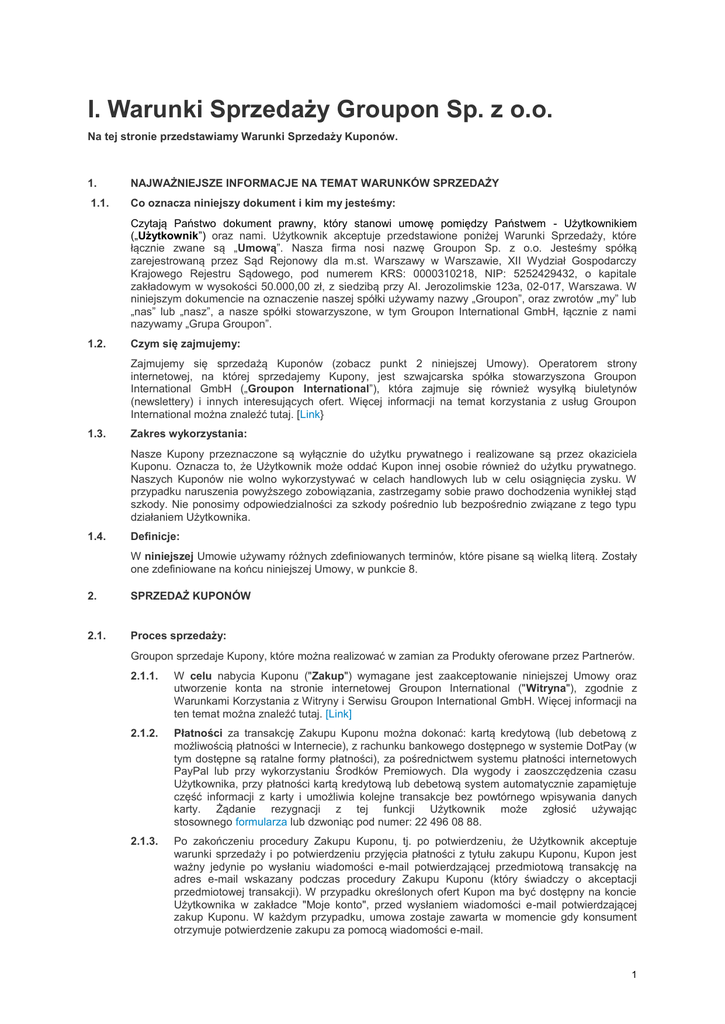 I. Warunki Sprzedaży Groupon Sp. z o.o.