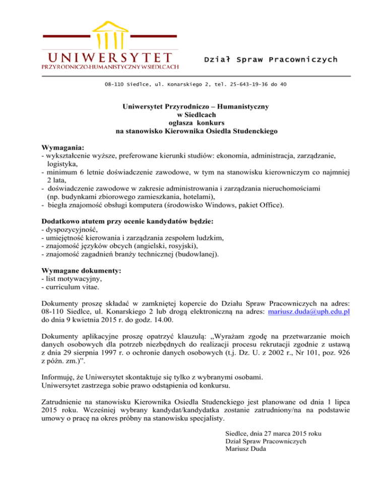 Dział Spraw Pracowniczych 08-110 Siedlce, ul. Konarskiego 2, tel. 25-643-19-36 do 40 Uniwersytet Przyrodniczo – Humanistyczny w Siedlcach ogłasza konkurs na stanowisko Kierownika Osiedla Studenckiego Wymagania: - wykształcenie wyższe, preferowane kierunki studiów: ekonomia, administracja, zarządzanie, logistyka, - minimum 6 letnie doświadczenie zawodowe, w tym na stanowisku kierowniczym co najmniej 2 lata, - doświadczenie zawodowe w zakresie administrowania i zarządzania nieruchomościami (np. budynkami zbiorowego zamieszkania, hotelami), - biegła znajomość obsługi komputera (środowisko Windows, pakiet Office). Dodatkowo atutem przy ocenie kandydatów będzie: - dyspozycyjność, - umiejętność kierowania i zarządzania zespołem ludzkim, - znajomość języków obcych (angielski, rosyjski), - znajomość zagadnień branży technicznej (budowlanej). Wymagane dokumenty: - list motywacyjny, - curriculum vitae. Dokumenty proszę składać w zamkniętej kopercie do Działu Spraw Pracowniczych na adres: 08-110 Siedlce, ul. Konarskiego 2 lub drogą elektroniczną na adres: [email protected] do dnia 9 kwietnia 2015 r. do godz. 14.00. Dokumenty aplikacyjne proszę opatrzyć klauzulą: „Wyrażam zgodę na przetwarzanie moich danych osobowych dla potrzeb niezbędnych do realizacji procesu rekrutacji zgodnie z ustawą z dnia 29 sierpnia 1997 r. o ochronie danych osobowych (t.j. Dz. U. z 2002 r., Nr 101, poz. 926 z późn. zm.)”. Informuję, że Uniwersytet skontaktuje się tylko z wybranymi osobami. Uniwersytet zastrzega sobie prawo odstąpienia od konkursu. Zatrudnienie na stanowisku Kierownika Osiedla Studenckiego jest planowane od dnia 1 lipca 2015 roku. Wcześniej wybrany kandydat/kandydatka zostanie zatrudniony/na na podstawie umowy o pracę na okres próbny na stanowisku specjalisty. Siedlce, dnia 27 marca 2015 roku Dział Spraw Pracowniczych Mariusz Duda