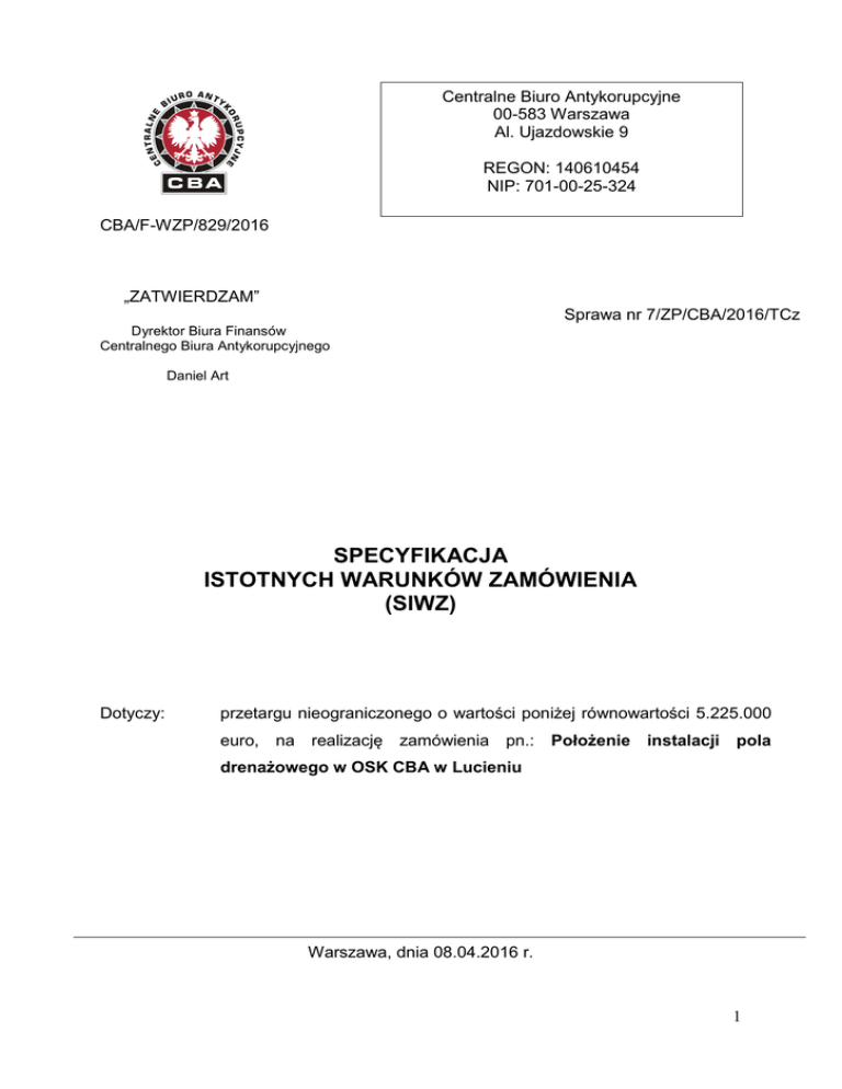 Centralne Biuro Antykorupcyjne 00-583 Warszawa Al. Ujazdowskie 9 REGON: 140610454 NIP: 701-00-25-324 CBA/F-WZP/829/2016 „ZATWIERDZAM” Sprawa nr 7/ZP/CBA/2016/TCz Dyrektor Biura Finansów Centralnego Biura Antykorupcyjnego Daniel Art SPECYFIKACJA ISTOTNYCH WARUNKÓW ZAMÓWIENIA (SIWZ) Dotyczy: przetargu nieograniczonego o wartości poniżej równowartości 5.225.000 euro, na realizację zamówienia pn.: Położenie instalacji pola drenażowego w OSK CBA w Lucieniu Warszawa, dnia 08.04.2016 r. 1 Zamawiający zaprasza do udziału w postępowaniu prowadzonym w trybie przetargu nieograniczonego pn.: Położenie instalacji pola drenażowego w OSK CBA w Lucieniu, zgodnie z wymaganiami określonymi w niniejszej Specyfikacji Istotnych Warunkach Zamówienia, zwanej dalej SIWZ. I. INFORMACJE OGÓLNE 1. Do udzielenia przedmiotowego zamówienia stosuje się przepisy ustawy z dnia 29 stycznia 2004r. – Prawo zamówień publicznych (t.j. Dz. U. z 2013 r. poz. 907 z późn. zm.) zwanej dalej ustawą Pzp oraz akty wykonawcze wydane na jej podstawie. 2. Do czynności podejmowanych przez Zamawiającego i Wykonawców w postępowaniu o udzielenie zamówienia publicznego stosuje się przepisy ustawy z dnia 23 kwietnia 1964 r. – Kodeks cywilny (Dz. U. Nr 16, poz. 93 z późn. zm.), jeżeli przepisy ustawy Pzp nie stanowią inaczej. 3. Postępowanie o udzielenie zamówienia publicznego prowadzi się w języku polskim (art. 9 ust. 2 ustawy Pzp). Zamawiający dopuszcza wykorzystanie języka obcego w zakresie określonym w art. 11 ustawy z dnia 7 października 1999r. o języku polskim (Dz. U. Nr 90, poz. 999 z późn. zm.). II. NAZWA ORAZ ADRES ZAMAWIAJĄCEGO Centralne Biuro Antykorupcyjne Al. Ujazdowskie 9 00-583 Warszawa Regon: 140610454 Adres do korespondencji: BIURO FINANSÓW CBA, Wydział Zamówień Publicznych ul. Poleczki 3, 02-822 Warszawa tel.: 22 437 13 43, fax: 22 437 13 90, e-mail: [email protected] Informacje związane z przedmiotowym postępowaniem objęte ustawowym wymogiem publikacji na stronie internetowej Zamawiającego będą udostępniane pod adresem: www.cba.gov.pl III. TRYB UDZIELENIA ZAMÓWIENIA 1. Postępowanie prowadzone jest w trybie przetargu nieograniczonego, w którym w odpowiedzi na publiczne ogłoszenie o zamówieniu, oferty mogą składać wszyscy zainteresowani Wykonawcy. 2. Zamawiający nie przewiduje przeprowadzenia aukcji elektronicznej, o której mowa w art. 91a – 91c ustawy Pzp. 2 IV. OPIS PRZEDMIOTU ZAMÓWIENIA 1. Przedmiotem zamówienia są roboty budowlane polegające na położeniu instalacji pola drenażowego w OSK CBA w Lucieniu. Przedmiotem zamówienia jest realizacja robót związanych z uporządkowaniem istniejącej kanalizacji sanitarnej na terenie Ośrodka Szkoleniowo – Konferencyjnego CBA w Lucieniu, polegających na położeniu instalacji pola drenażowego rozsączającego ścieki z biologicznej oczyszczalni ścieków. W ramach przedsięwzięcia przewiduje się: a) roboty ziemne – wykonanie wykopów liniowych i jamistych w gruntach sypkich, b) roboty montażowe w wykopach – budowa przewodów kanalizacji ściekowych grawitacyjnych i tłocznych, c) roboty budowlane wewnątrz zbiorników i montaż urządzeń, d) montaż zbiorników prefabrykowanych, tuneli drenażowych i studzienki kanalizacyjnej, e) wykonanie instalacji – montaż w istniejącym zbiorniku pompy z aramaturą i wyposażeniem, f) odtworzenie nawierzchni terenu do stanu istniejącego. Przedmiot zamówienia, został szczegółowo opisany w załącznikach nr 1,2,3 do niniejszej SIWZ. 2. Przedmiot zamówienia określony został we Wspólnym Słowniku Zamówień kodem: kod CPV 45.11.10.00-8, 45.33.00.00-9. 3. Zamawiający nie dopuszcza składania ofert częściowych. 4. Zamawiający nie dopuszcza składania ofert wariantowych. 5. Zamawiający nie przewiduje możliwości udzielenia zamówień uzupełniających o których mowa w art. 67 ust. 1 pkt. 6 ustawy pzp. 6. Zgodnie z art. 30 ustawy Pzp, Zamawiający dopuszcza rozwiązania równoważne opisywanym. Wskazanie równoważności oferowanego przedmiotu zamówienia spoczywa na Wykonawcy. 7. Zamawiający dopuszcza powierzenie zamówienia podwykonawcom Wykonawcy. W takim wypadku Wykonawca ma obowiązek (zgodnie z art. 36b ustawy Pzp) zawrzeć w ofercie: a) części zamówienia, której wykonanie zamierzają powierzyć podwykonawcy, b) nazwę (firm) podwykonawców, na których zasoby wykonawca powołuje się na zasadach określonych w art. 26 ust. 2b, w celu wykazania spełniania warunków udziału w postępowaniu. Jeżeli zmiana albo rezygnacja z podwykonawcy dotyczy podmiotu, na którego zasoby wykonawca powoływał się w celu wykazania spełniania warunków udziału w postępowaniu, wykonawca jest obowiązany wykazać zamawiającemu, iż proponowany inny podwykonawca lub wykonawca samodzielnie spełnia je w stopniu nie mniejszym niż wymagany w trakcie postępowania o udzielenia zamówienia. 3 Brak powyższych informacji w ofercie oznaczać będzie, że Wykonawca nie będzie korzystał z podwykonawstwa przy realizacji zamówienia. 8. Ilekroć w dalszych postanowieniach Specyfikacji Istotnych Warunków Zamówienia, mowa jest o przedmiocie zamówienia bez bliższego oznaczenia, należy przez to rozumieć przedmiot zamówienia opisany w ust. 1, w załącznikach do SIWZ oraz w projekcie umowy. V. TERMIN WYKONANIA ZAMÓWIENIA Termin realizacji zamówienia: umowy. w ciągu 45 dni roboczych od dnia zawarcia VI. WARUNKI UDZIAŁU W POSTĘPOWANIU ORAZ DOKONYWANIA OCENY SPEŁNIANIA TYCH WARUNKÓW: OPIS SPOSOBU 1. O zamówienie może się ubiegać Wykonawca, który spełnia warunki określone w art. 22 ust. 1 ustawy Pzp, w szczególności: a) posiada wiedzę i doświadczenie, w tym należycie wykonał w okresie pięciu lat przed upływem terminu składania ofert, a jeżeli okres prowadzenia działalności jest krótszy – w tym okresie, minimum 1 robotę budowlaną w zakresie wykonania robót na istniejącej instalacji kanalizacji sanitarnej, polegając