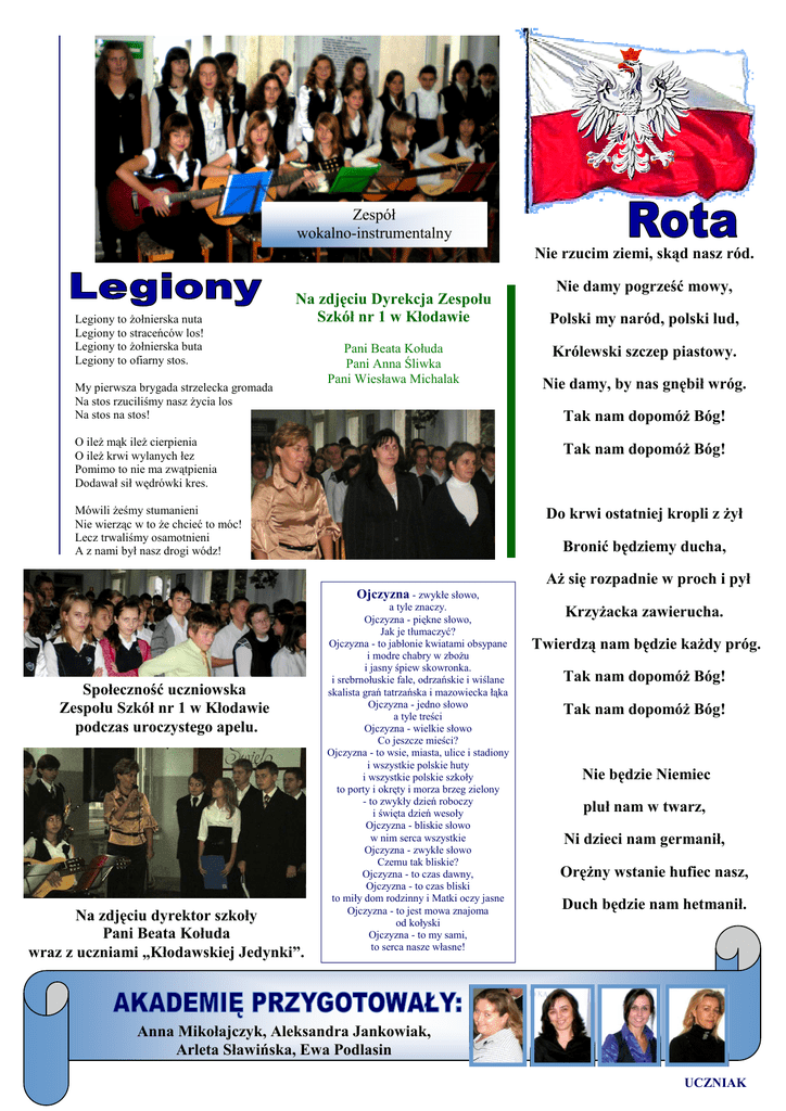 Zespół wokalno-instrumentalny Nie rzucim ziemi, skąd nasz ród. Legiony to Ŝołnierska nuta Legiony to straceńców los! Legiony to Ŝołnierska buta Legiony to ofiarny stos. Na zdjęciu Dyrekcja Zespołu Szkół nr 1 w Kłodawie My pierwsza brygada strzelecka gromada Na stos rzuciliśmy nasz Ŝycia los Na stos na stos! Pani Beata Kołuda Pani Anna Śliwka Pani Wiesława Michalak Nie damy pogrześć mowy, Polski my naród, polski lud, Królewski szczep piastowy. Nie damy, by nas gnębił wróg. Tak nam dopomóŜ Bóg! O ileŜ mąk ileŜ cierpienia O ileŜ krwi wylanych łez Pomimo to nie ma zwątpienia Dodawał sił wędrówki kres. Tak nam dopomóŜ Bóg! Mówili Ŝeśmy stumanieni Nie wierząc w to Ŝe chcieć to móc! Lecz trwaliśmy osamotnieni A z nami był nasz drogi wódz! Do krwi ostatniej kropli z Ŝył Bronić będziemy ducha, AŜ się rozpadnie w proch i pył Ojczyzna - zwykłe słowo, Społeczność uczniowska Zespołu Szkół nr 1 w Kłodawie podczas uroczystego apelu. Na zdjęciu dyrektor szkoły Pani Beata Kołuda wraz z uczniami „Kłodawskiej Jedynki”. a tyle znaczy. Ojczyzna - piękne słowo, Jak je tłumaczyć? Ojczyzna - to jabłonie kwiatami obsypane i modre chabry w zboŜu i jasny śpiew skowronka. i srebrnołuskie fale, odrzańskie i wiślane skalista grań tatrzańska i mazowiecka łąka Ojczyzna - jedno słowo a tyle treści Ojczyzna - wielkie słowo Co jeszcze mieści? Ojczyzna - to wsie, miasta, ulice i stadiony i wszystkie polskie huty i wszystkie polskie szkoły to porty i okręty i morza brzeg zielony - to zwykły dzień roboczy i święta dzień wesoły Ojczyzna - bliskie słowo w nim serca wszystkie Ojczyzna - zwykłe słowo Czemu tak bliskie? Ojczyzna - to czas dawny, Ojczyzna - to czas bliski to miły dom rodzinny i Matki oczy jasne Ojczyzna - to jest mowa znajoma od kołyski Ojczyzna - to my sami, to serca nasze własne! KrzyŜacka zawierucha. Twierdzą nam będzie kaŜdy próg. Tak nam dopomóŜ Bóg! Tak nam dopomóŜ Bóg! Nie będzie Niemiec pluł nam w twarz, Ni dzieci nam germanił, OręŜny wstanie hufiec nasz, Duch będzie nam hetmanił. Anna Mikołajczyk, Aleksandra Jankowiak, Arleta Sławińska, Ewa Podlasin UCZNIAK