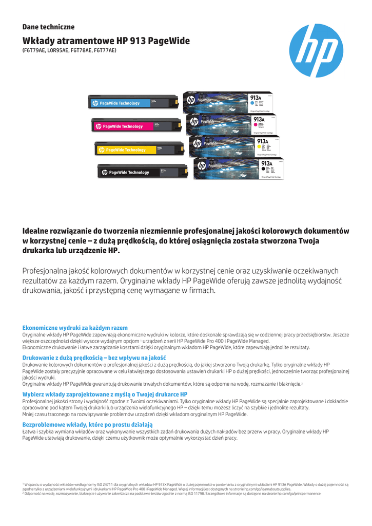 Dane techniczne Wkłady atramentowe HP 913 PageWide (F6T79AE, L0R95AE, F6T78AE, F6T77AE) Idealne rozwiązanie do tworzenia niezmiennie profesjonalnej jakości kolorowych dokumentów w korzystnej cenie – z dużą prędkością, do której osiągnięcia została stworzona Twoja drukarka lub urządzenie HP. Profesjonalna jakość kolorowych dokumentów w korzystnej cenie oraz uzyskiwanie oczekiwanych rezultatów za każdym razem. Oryginalne wkłady HP PageWide oferują zawsze jednolitą wydajność drukowania, jakość i przystępną cenę wymagane w firmach. Ekonomiczne wydruki za każdym razem Oryginalne wkłady HP PageWide zapewniają ekonomiczne wydruki w kolorze, które doskonale sprawdzają się w codziennej pracy przedsiębiorstw. Jeszcze większe oszczędności dzięki wysoce wydajnym opcjom 1 urządzeń z serii HP PageWide Pro 400 i PageWide Managed. Ekonomiczne drukowanie i łatwe zarządzanie kosztami dzięki oryginalnym wkładom HP PageWide, które zapewniają jednolite rezultaty. Drukowanie z dużą prędkością – bez wpływu na jakość Drukowanie kolorowych dokumentów o profesjonalnej jakości z dużą prędkością, do jakiej stworzono Twoją drukarkę. Tylko oryginalne wkłady HP PageWide zostały precyzyjnie opracowane w celu łatwiejszego dostosowania ustawień drukarki HP o dużej prędkości, jednocześnie tworząc profesjonalnej jakości wydruki. Oryginalne wkłady HP PageWide gwarantują drukowanie trwałych dokumentów, które są odporne na wodę, rozmazanie i blaknięcie.2 Wybierz wkłady zaprojektowane z myślą o Twojej drukarce HP Profesjonalnej jakości strony i wydajność zgodne z Twoimi oczekiwaniami. Tylko oryginalne wkłady HP PageWide są specjalnie zaprojektowane i dokładnie opracowane pod kątem Twojej drukarki lub urządzenia wielofunkcyjnego HP – dzięki temu możesz liczyć na szybkie i jednolite rezultaty. Mniej czasu traconego na rozwiązywanie problemów urządzeń dzięki wkładom oryginalnym HP PageWide. Bezproblemowe wkłady, które po prostu działają Łatwa i szybka wymiana wkładów oraz wykonywanie wszystkich zadań drukowania dużych nakładów bez przerw w pracy. Oryginalne wkłady HP PageWide ułatwiają drukowanie, dzięki czemu użytkownik może optymalnie wykorzystać dzień pracy. W oparciu o wydajności wkładów według normy ISO 24711 dla oryginalnych wkładów HP 973X PageWide o dużej pojemności w porównaniu z oryginalnymi wkładami HP 913A PageWide. Wkłady o dużej pojemności są zgodne tylko z urządzeniami wielofunkcyjnymi i drukarkami HP PageWide Pro 400 i PageWide Managed. Więcej informacji jest dostępnych na stronie hp.com/go/learnaboutsupplies. 2 Odporność na wodę, rozmazywanie, blaknięcie i używanie zakreślacza na podstawie testów zgodnie z normą ISO 11798. Szczegółowe informacje są dostępne na stronie hp.com/go/printpermanence. 1 Dane techniczne | Wkłady atramentowe HP 913 PageWide Informacje o zgodności Drukarka HP PageWide seria 352 i 377; Drukarki HP PageWide Pro seria 452 i 477; Drukarki HP PageWide Managed seria P57750 i P55250 Dane techniczne produktu P/N Opis Średnia wydajność kasety z tonerem * ** Wymiary (dł x szer x gł) Waga Kod UPC L0R95AE Czarny wkład atramentowy HP 913A Original PageWide ok. 3500 stron 215 x 28 x 48 mm 0,17 kg 889296544654 F6T77AE Błękitny wkład atramentowy HP 913A Original PageWide Ok. 3000 stron 215 x 28 x 48 mm 0,13 kg 889296544623 F6T78AE Purpurowy wkład atramentowy HP 913A Original PageWide Ok. 3000 stron 215 x 28 x 48 mm 0,13 kg 889296544630 F6T79AE Żółty wkład atramentowy HP 913A Original PageWide Ok. 3000 stron 215 x 28 x 48 mm 0,13 kg 889296544647 *Testowana w urządzeniu wielofunkcyjnym HP PageWide Pro 577dw. Przybliżona średnia wydajność jest oparta na normie ISO/IEC 24711 lub metodologii testów HP dla druku ciągłego. Rzeczywista wydajność może się znacznie różnić w zależności od zawartości drukowanych stron i innych czynników. Szczegółowe informacje są dostępne na stronie hp.com/go/learnaboutsupplies. **Testowana w urządzeniu wielofunkcyjnym HP PageWide Pro 577dw. Przybliżona średnia wydajność w stronach (błękitny/purpurowy/żółty) przy druku ciągłym mierzona zgodnie z normą ISO/IEC 24711 lub metodami testowania firmy HP. Rzeczywista wydajność może się znacznie różnić w zależności od zawartości drukowanych stron i innych czynników. Szczegółowe informacje są dostępne na stronie hp.com/go/learnaboutsupplies. Gwarancja Firma HP gwarantuje, że oryginalne wkłady i głowice drukujące HP PageWide są wolne od wad materiałowych i produkcyjnych przez okres obowiązywania gwarancji. Aby uzyskać więcej informacji na temat materiałów konsumpcyjnych HP, odwiedź http://www.hp.com Produkt może odbiegać wyglądem od widocznego na ilustracjach. © Copyright 2016 HP Development Company, L.P. Informacje zawarte w niniejszym dokumencie mogą ulec zmianie bez powiadomienia. Jedyne gwarancje, jakich firma HP udziela na produkty i usługi, są określone w oświadczeniach gwarancyjnych dostarczanych wraz z tymi produktami i usługami. Żadne informacje przedstawione w niniejszym dokumencie nie powinny być interpretowane jako dodatkowa gwarancja. Firma HP nie ponosi odpowiedzialności za błędy techniczne lub redakcyjne oraz braki występujące w niniejszym dokumencie. 4AA6-3943PLE, Luty 2016