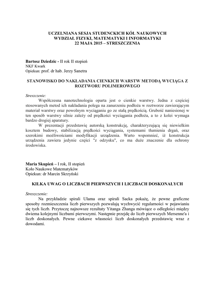 UCZELNIANA SESJA STUDENCKICH KÓŁ NAUKOWYCH WYDZIAŁ FIZYKI, MATEMATYKI I INFORMATYKI 22 MAJA 2015 – STRESZCZENIA Bartosz Dziedzic - II rok II stopień NKF Kwark Opiekun: prof. dr hab. Jerzy Sanetra STANOWISKO DO NAKŁADANIA CIENKICH WARSTW METODĄ WYCIĄGA Z ROZTWORU POLIMEROWEGO Streszczenie: Współczesna nanotechnologia oparta jest o cienkie warstwy. Jedna z częściej stosowanych metod ich nakładania polega na zanurzeniu podłoża w roztworze zawierającym materiał warstwy oraz powolnym wyciąganiu go ze stałą prędkością. Grubość naniesionej w ten sposób warstwy silnie zależy od prędkości wyciągania podłoża, a to z kolei wymaga bardzo drogiej aparatury. W prezentacji przedstawię autorską konstrukcję, charakteryzującą się niewielkim kosztem budowy, stabilizacją prędkości wyciągania, systemami tłumienia drgań, oraz szerokimi możliwościami modyfikacji urządzenia. Warto wspomnieć, iż konstrukcja urządzenia zawiera jedynie części "z odzysku", co ma duże znaczenie dla ochrony środowiska. Maria Skupień – I rok, II stopień Koło Naukowe Matematyków Opiekun: dr Marcin Skrzyński KILKA UWAG O LICZBACH PIERWSZYCH I LICZBACH DOSKONAŁYCH Streszczenie: Na przykładzie spirali Ulama oraz spirali Sacka pokażę, że pewne graficzne sposoby rozmieszczenia liczb pierwszych pozwalają wychwycić regularności w pojawianiu się tych liczb. Przytoczę najnowsze rezultaty Yitanga Zhanga mówiące o odległości między dwiema kolejnymi liczbami pierwszymi. Następnie przejdę do liczb pierwszych Mersenne'a i liczb doskonałych. Pewne ciekawe własności liczb doskonałych przedstawię wraz z dowodami. Mirosław Kiełbowicz – II rok, II stopień NKF Kwark Opiekun: dr hab. Andrzej Rybicki CZASOPRZESTRZENNA EWOLUCJA W ZDERZENIACH CIĘŻKICH JONÓW NA PRZYKŁADZIE WYSOKOENERGETYCZNYCH ZDERZEŃ JĄDER OŁOWIU Streszczenie: Badania dotyczące relatywistycznych zderzeń ciężkich jonów są ciekawym i złożonym procesem fizycznym, który wymaga znajomości informacji z dziedziny fizyki wysokich energii i fizyki jądrowej. Pozwala nam to odkryć prawa rządzące otaczającą nas subatomową materią. Wystąpienie poświęcone będzie wysokoenergetycznym zderzeniom ciężkich jonów: ołów – ołów (Pb208+Pb208) o energii wynoszącej √sNN=17.27GeV (gigaelektronowoltów na parę nukleon-nukleon), która odpowiada akceleratorowi Super Proton Synchrotron (SPS) znajdującemu się w CERN. Przedstawione zostanie zupełnie nowe podejście do modelowania zderzeń ciężkich jonów, którego pomysłodawcą jest prof. Antoni Szczurek (IFJ PAN), a także zaprezentowane zostaną rezultaty dla zderzeń jądro – jądro o różnych geometriach. Joanna Hałun – II rok, II stopień NKF Kwark Opiekun: dr hab. Zoryana Usatenko IDEALNE ŁAŃCUCHY POLIMEROWE Z ZAMKNIĘTYCH PRZESTRZENIACH GEOMETRYCZNYCH Streszczenie: Idealne łańcuchy polimerowe z zamkniętych przestrzeniach geometrycznych. Jak zachowują się rozcieńczone roztwory długich, elastycznych łańcuchów polimerowych w zamkniętych przestrzeniach geometrycznych, takich jak cienkie warstwy, porowate środowisko lub w roztworze koloidalnych cząstek dużego rozmiaru? Stosując masową teorię pola dla ustalonego wymiaru przestrzeni, gdzie d<4, dla następujących przypadków, kiedy rozcieńczony roztwór długiego, elastycznego łańcucha polimerowego w dobrym rozpuszczalniku znajduje się pomiędzy dwiema równoległymi ściankami, z których obie są obojętne, dwie różne tzn. jedna ścianka jest odpychająca, a druga obojętna oraz dwie odpychające, a także w przypadku polimeru znajdującego się pomiędzy powierzchnią i koloidalną mezoskopową cząstką o dużym promieniu otrzymano rezultaty dla potencjału zubożenia i siły zubożenia w poszczególnych przypadkach Damian Kasyan – III rok, I stopień NKF Kwark Opiekun: dr hab. Krzysztof Kozak WPŁYW POZIOMU STĘŻENIA RADONU NA TŁO SPEKTROMETRU PROMIENIOWANIA GAMMA Streszczenie: Tło spektroskopii gamma jest bardzo ważne. Dokładne badanie tła gwarantuje bardziej dokładne pomiary. Obniżając więc poziom tła, możemy przeprowadzić dokładniejsze pomiary. Niestety, środowisko wokół nas jest radioaktywne. Materiały użyte do produkcji budynków również. Ale to jest wartość stała. Głównym powodem, który może zakłócić pomiar jest radon. Jego właściwości fizyczne i chemiczne pozwalają przenikać i migrować w budynkach detektorów. Narażone są zwykle nisko położone obszary i piwnice. Część laboratoriów, w których znajdują się detektory, są nisko położone. Dlatego poziom radonu powinien być często kontrolowany. Aby wyjaśnić problem, przeprowadzę eksperyment na detektorze HPGe. Jego wyniki chciałbym przedstawić w moim wystąpieniu. Sylwia Konefał – III rok, I stopień Koło Naukowe Matematyków Opiekun: dr Margareta Wiciak WOKÓŁ PARADOKSU BERTRANDA Streszczenie: Głównym celem referatu jest przedstawienie paradoksu Bertranda oraz omówienie nowych wyników związanych z nie do końca sprecyzowanym pytaniem Bertranda. Omówimy trzy zaproponowane przez Bertranda rozwiązania. Wszystkie wydają się poprawne, ale prowadza do różnych wyników, gdyż są efektem różnych, ale poprawnych interpretacji problemu. Następnie wskażemy jak uzyskać rozwiązanie będące dowolna liczba z przedziału (0, 1). W końcu, kierując się zasadą „maksymalnej niewiedzy” pokażemy, że jeśli problem posiada rozwiązanie to musi mieć niezmienniczość obrotową, niezmienniczość skali i niezmienniczość względem translacji. W ten sposób, otrzymamy dokładne jedno rozwiązanie. Jakub Woźny – I rok, II stopień NKF Kwark Opiekun: prof. dr hab. Piotr Zieliński METODY OTRZYMYWANIA I POTENCJALNE ZASTOSOWANIE METAMATERIAŁÓW Streszczenie: Prezentacja przedstawia dotychczasowe osiągnięcia nauki i techniki w otrzymywaniu oraz zastosowaniu metamateriałów. Omówione zostaną w niej podstawowe idee będące podst
