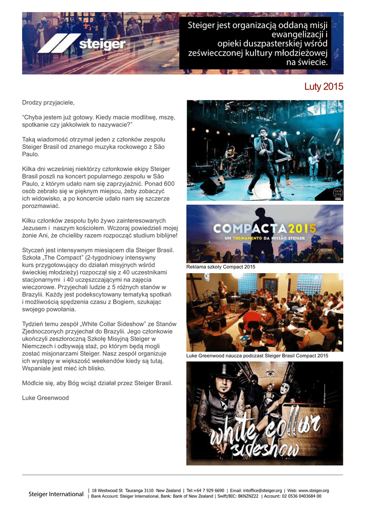 Steiger jest organizacją oddaną misji ewangelizacji i opieki duszpasterskiej wśród zeświecczonej kultury młodzieżowej na świecie. Luty 2015 Drodzy przyjaciele, “Chyba jestem już gotowy. Kiedy macie modlitwę, mszę, spotkanie czy jakkolwiek to nazywacie?” Taką wiadomość otrzymał jeden z członków zespołu Steiger Brasil od znanego muzyka rockowego z São Paulo. Kilka dni wcześniej niektórzy członkowie ekipy Steiger Brasil poszli na koncert popularnego zespołu w São Paulo, z którym udało nam się zaprzyjaźnić. Ponad 600 osób zebrało się w pięknym miejscu, żeby zobaczyć ich widowisko, a po koncercie udało nam się szczerze porozmawiać. Kilku członków zespołu było żywo zainteresowanych Jezusem i naszym kościołem. Wczoraj powiedzieli mojej żonie Ani, że chcieliby razem rozpocząć studium biblijne! Styczeń jest intensywnym miesiącem dla Steiger Brasil. Szkoła „The Compact” (2-tygodniowy intensywny kurs przygotowujący do działań misyjnych wśród świeckiej młodzieży) rozpoczął się z 40 uczestnikami stacjonarnymi i 40 uczęszczającymi na zajęcia wieczorowe. Przyjechali ludzie z 5 różnych stanów w Brazylii. Każdy jest podekscytowany tematyką spotkań i możliwością spędzenia czasu z Bogiem, szukając swojego powołania. Tydzień temu zespół „White Collar Sideshow” ze Stanów Zjednoczonych przyjechał do Brazylii. Jego członkowie ukończyli zeszłoroczną Szkołę Misyjną Steiger w Niemczech i odbywają staż, po którym będą mogli zostać misjonarzami Steiger. Nasz zespół organizuje ich występy w większość weekendów kiedy są tutaj. Wspaniale jest mieć ich blisko. Reklama szkoły Compact 2015 Luke Greenwood naucza podczast Steiger Brasil Compact 2015 Módlcie się, aby Bóg wciąż działał przez Steiger Brasil. Luke Greenwood Steiger International | 18 Westwood St Tauranga 3110 New Zealand | Tel:+64 7 929 6690 | Email: [email protected] | Web: www.steiger.org | Bank Account: Steiger International, Bank: Bank of New Zealand | Swift/BIC: BKNZNZ22 | Account: 02 0536 0403684 00 Aplikuj JUŻ TERAZ do Szkoły Misyjnej Steiger! Termin składania aplikacji upływa z dniem 1 marca Potrzebna pomoc przy remoncie!!! We wschodniej części Niemiec, w Krögis, znajduje się międzynarodowe centrum Steiger. Jest to punkt startowy dla naszych inicjatyw i misjonarzy, powołanych do głoszenia Dobrej Nowiny. Aby w pełni wykorzystać potencjał tego miejsca, konieczny jest remont, dlatego szukamy ludzi chętnych do pracy. Potrzebujemy osób, które mają pojęcie o hydraulice, elektryce, budownictwie, dekarstwie, tynkowaniu, malowaniu, murarstwie, kładzeniu kafli oraz osób do pomocy przy tych pracach. W szczególności potrzebna jest pomoc na początku marca 2015. Pracy nie zabraknie dla nikogo – niezależnie od tego, czy przyjedziesz z całą grupą osób z kościoła, czy też sam. Aby dowiedzieć się więcej, napisz do Kersten Lang pod adres email: [email protected] Szkoła Misyjna Steiger 2015 Steiger Krögis (Saksonia, Germany) 12 czerwca – 20 sierpnia, 2015 Usłysz Boga i przygotuj się na misję wśród młodzieży z całego świata. SMS15 to 10-tygodniowy intensywny kurs dla wszystkich, którzy czują się powołani do tego, by nieść Jezusa do młodych ludzi. Ukończenie szkoły jest warunkiem, jaki musi spełnić każdy, kto chce zostać misjonarzem Steiger. Aplikuj online: www.steiger.org/sms NLM DVD “Live in Minneapolis” Z radością zawiadamiamy, że została wydana nowa płyta DVD z koncertu No Longer Music na żywo! Aby obejrzeć i udostępnić, wejdź na: vimeo.com/nolongermusic/livedvd Płytę będzie można kupić wkrótce na stronie Steiger. CHCESZ NAS WESPRZEC? Skontaktuj sie z nami jesli chcialbys: • byc partnerem finansowym Steiger, zarowno przez regularne wsparcie jak i jednorazowy datek, oraz • otrzymac wiecej informacji o nas Przez e-mail: [email protected] lub poprzez nasza strone: www.steiger.org www.steiger.org All gifts made to Steiger International, Ltd. are under the control of its Board of Directors to be used for its exempt purposes. In the unlikely event a project or program is over-funded or is not able to be carried out, the board will redirect the funds for a similar purpose. Gifts may be preferenced to support the ministry of specific Steiger missionaries and/or their specific ministry efforts but these are not gifts to or for the individual but to Steiger for its exempt ministries. While the Steiger board endeavours to use funds preferenced for the ministry of specific Steiger missionaries and/or their specific ministry efforts in accordance with the donor’s preferences, at times the board may redirect the use of these gifts. No gifts are received by Steiger in exchange for goods or services.