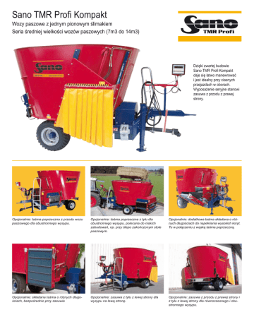 Sano TMR Profi Kompakt Wozy paszowe z jednym pionowym ślimakiem Seria średniej wielkości wozów paszowych (7m3 do 14m3) Dzięki zwartej budowie Sano TMR Profi Kompakt daje się łatwo manewrować i jest idealny przy ciasnych przejazdach w oborach. Wyposażenie seryjne stanowi zasuwa z przodu z prawej strony. Opcjonalnie: taśma poprzeczna z przodu wozu paszowego dla obustronnego wysypu. Opcjonalnie: taśma poprzeczna z tyłu dla obustronnego wysypu, polecana do niskich zabudowań, np. przy ślepo zakończonym stole paszowym. Opcjonalnie: dodatkowa taśma składana o różnych długościach do napełniania wysokich koryt. Tu w połączeniu z wąską taśma poprzeczną. Opcjonalnie: składana taśma o różnych długościach, bezpośrednio przy zasuwie Opcjonalnie: zasuwa z tyłu z lewej strony dla wysypu na lewą stronę. Opcjonalnie: zasuwa z przodu z prawej strony i z tyłu z lewej strony dla równoczesnego i obustronnego wysypu. 6 Sano TMR Profi Kompakt Wozy paszowe z jednym pionowym ślimakiem Typ Nr artykułu Długość Szerokość Wysokość mm mm mm Opony Zewnętrzny rozstaw kół mm Wewnętrzny rozstaw kół mm 7m³ EK0705 8m³ EK0805 9m³ EK0905 10m³ EK1005 10m³ T EK1105 11m³ EK1106 12m³ EK1205 14m3 EK1405 4.300 2.060 2.520 4.500 2.250 2.440 4.550 2.250 2.640 4.650 2.400 2.750 4.700 2.550 2.570 4.700 2.550 2.670 4.750 2.550 2.770 4.800 2.550 3.140 10.0/75-15.3 22PR 1.850 1.550 10.0/75-15.3 22PR 1.850 1.550 10.0/75-15.3 22PR 1.850 1.550 400/60 15.5 14PR 1.980 1.550 400/60 15.5 14PR 2.130 1.700 400/60 15.5 14PR 2.130 1.700 400/60 15.5 14PR 2.130 1.700 435/50 R19.5 2.200 1.700 1.000 7.000 7.000 2.950 1.000 7.000 7.000 3.450 1.000 7.150 7.000 3.550 1.000 7.800 8.000 3.800 1.000 9.200 8.000 4.400 4.700 Dopuszczalne obciążenie zaczepu kg Tech. dopuszczalna waga całkowita Dopuszczalna waga całkowita Masa wozu paszowego 1.000 kg kg kg Wysokość zaczepu górnego Wysokość zaczepu dolnego mm mm 840 340 840 340 840 340 900 400 850/900 400 850/900 400 850/900 400 890/940 440 Wysokość wyrzutu taśmy * Długość taśmy * Szerokość taśmy * mm mm mm 720 2.020 700 720 2.020 700 720 2.020 700 800 2.020 700 800 2.340 700 800 2.340 700 800 2.340 700 800 2.340 700 540 25 2 6 540 25 2 6 540 25 2 7 540 17/33 2 7 540 17/33 2 7 540 17/33 2 7 540 17/33 3 9 3 3 3 3 3 3 3 Liczba obrotów wałka l.obr/min 540 Liczba obrotów ślimaka l.obr/min 25 Ilość spirali 1,75 Ilość noży 5 Liczba czujników wagi 3 * dla wozów paszowych z taśmą (wyposażenie dodatkowe) 1.000 1.000 8.250 8.000 4.250 4.550 Wyposażenie seryjne: • drabinka przytwierdzona do ramy • sterowanie z ciągnika • przekładnia planetarna zintegrowana ze ślimakiem • zasuwa z przodu z prawej strony • turbo-ślimak • dodatkowa przekładnia redukcyjna (przy 10m3T, 11m3, 12m3 i 14m3) • wałek (z ułożyskowaniem do 10m ) • ustawiane, powlekane noże tnące 8mm • kanciasty pojemnik • waga sumująca • obręcz ruchoma z łańcuszkami • dwa mechaniczne przeciwnoże • hamulce hydrauliczne • obsługa z ciągnika* • belka z oświetleniem • mechaniczna stopka 3 *ciągnik musi być zaopatrzony w 1 podwójnie działający sterownik (dla zasuwy) i 1 pojedynczy sterownik (dla hamulców hydraulicznych) Wysyp seryjny: zasuwa z przodu z prawej strony Inne warianty wysypu dawki TMR: Zmiana Nr. art.. Nazwa Dł. Szer. Wys. E0050 dodatkowa zasuwa z tyłu z lewej strony E0051 dodatkowa zasuwa z tyłu w środku EK050 tylko zasuwa z tyłu z lewej i z tyłu z prawej strony E0052 tylko zasuwa z tyłu z lewej strony -- E0053 tylko zasuwa z tyłu w środku EK051 tylko taśma z przodu/ 1 silnik olejowy* 7 - 10 m³ EK053 tylko taśma z przodu/ 1 silnik olejowy 10m³T - 14 m³ EK052 tylko taśma z tyłu/ 1 silnik olejowy E0101 hydrauliczne przesunięcie taśmy lewo / prawo o 300mm** -- -- + 60mm -- + 300mm -- Cena w PLN 3.100,- -- 3.100,- -- + 60mm -- 3.700,- -- -- + 300mm - 60mm -- + 350mm - 60mm + 70mm + 600mm - 60mm + 70mm 6.500,- + 350mm - 60mm -- 6.000,- -- -- 3.000,- 560,560,5.000,- * niemożliwa dodatkowa przekładnia redukcyjna ** konieczna taśma z przodu lub z tyłu z tym oznaczeniem: dla wyposażenia dodatkowego jest konieczna dodatkowa podwójnie działająca funkcja hydrauliczna Pozostałe wyposażenie dodatkowe znajduje się na stronach 14 do 16 7