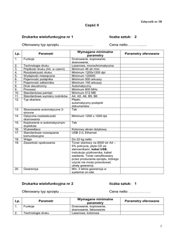 Załącznik nr 2B Część II Drukarka wielofunkcyjna nr 1 liczba sztuk: 2 Oferowany typ sprzętu ……………………… Cena netto………........ Lp. 1. Funkcje 2. 3. 4. 5. 6. 7. 8. 9. 10. 11. 12. Technologia druku Prędkość druku (A4, w czerni) Rozdzielczość druku Wydajność miesięczna Pojemność podajnika Pojemność odbiornika Druk dwustronny Procesor Standardowa pamięć Standardowe wymiary nośników Typ skanera 13. 18. 19. Skanowanie automatyczne 2stronne Optyczna rozdzielczość skanowania Kopiowanie w automatycznym dupleksie Wyświetlacz Standardowe rozwiązania komunikacyjne Waga Zawartość opakowania 20. Gwarancja 14. 15. 16. 17. Wymagane minimalne parametry Parametr Parametry oferowane Drukowanie, kopiowanie, skanowanie, Laserowa, monochromatyczna Minimum 46 str./min Minimum 1200x1200 dpi Minimum 120000 Minimum 500 arkuszy Minimum 150 arkuszy Automatyczny Minimum 800 MHz Minimum 512 MB A4, A5, A6, B5, B6 Płaski, automatyczny podajnik dokumentów Tak Minimum 1200 x 1200 dpi Tak Kolorowy ekran dotykowy USB 2.0, Ethernet Do 22 kg netto Toner startowy na 8000 str A4 – 5% pokrycia, płyta CD ze sterownikami, kabel USB, instrukcja użytkownika, kabel zasilania. Toner certyfikowany przez producenta sprzętu, którego użycie nie może powodować utraty gwarancji. Min. 3 letnia gwarancja w systemie on-site Drukarka wielofunkcyjna nr 2 liczba sztuk: 1 Oferowany typ sprzętu ………… Cena netto ……………… Lp. Parametr 1. Funkcje 2. Technologia druku Wymagane minimalne parametry Parametry oferowane Drukowanie, kopiowanie, skanowanie, faksowanie Laserowa, kolorowa 1 3. 4. 5. 6. 7. 8. 9. 10. 11. 12. 13. Prędkość druku (A4, w czerni i w kolorze) Jakość druku (w czerni) Wydajność miesięczna Pojemność podajnika Pojemność odbiornika Druk dwustronny Procesor Standardowa pamięć Standardowe wymiary nośników Typ skanera 18. Skanowanie automatyczne 2stronne Optyczna rozdzielczość skanowania Kopiowanie w automatycznym dupleksie Wyświetlacz Standardowe rozwiązania komunikacyjne Zawartość opakowania 19. Gwarancja 14. 15. 16. 17. Minimum 28 str./min Minimum 600 x 600 dpi Minimum 60000 Minimum 250 arkuszy Minimum 150 arkuszy Automatyczny Minimum 400 MHz Minimum 256 MB A4, A5, A6, B5, B6 Płaski, automatyczny podajnik dokumentów Tak Minimum 1200 x 1200 dpi Tak Kolorowy ekran dotykowy USB 2.0, interfejs Ethernet, interfejs WiFi tonery startowe na min. 1500 str. A4 – 5% pokrycia, płyta CD ze sterownikami, kabel USB, instrukcja użytkownika, kabel zasilania. Tonery certyfikowane przez producenta sprzętu, którego użycie nie może powodować utraty gwarancji. Min. 3 letnia gwarancja w systemie on-site Drukarka laserowa nr 1 liczba sztuk: 1 Oferowany typ sprzętu ……………………… Cena netto………........ Lp. Parametr 1. 2. 3. 4. 5. 6. 7. 8. 9. 10. Technologia druku Prędkość druku (w czerni) Rozdzielczość drukowania Maksymalny format papieru Automatyczny druk dwustronny Pojemność podajnika Prędkość procesora Pamięć Komunikacja Kompatybilne systemy 11. 12. Masa netto Gwarancja Wymagane minimalne parametry Parametry oferowane Laserowa mono 40 str./min. 1200 x 1200 dpi A4 Tak 500 400 MHz 128 MB USB +kabel; Ethernet Windows XP, Windows 7 32/64bit, Windows 8.1 32/64bit, Windows 10 32/64bit Do 11,5 kg Min. 3 letnia gwarancja w systemie on-site 2 Lp. Drukarka do etykiet nr 1 liczba sztuk: 1 Oferowany typ sprzętu ……………………… Cena netto………........ Parametr 1. 2. 3. 4. 5. 6. 7. 8. 9. Technologia druku Rozdzielczość druku Prędkość druku Szerokość druku Długość druku Procesor Pamięć Interfejs Kompatybilne systemy 10. 11. Waga (netto bez materiałów) Gwarancja Lp. 1. 2. 3. Wymagane minimalne parametry Parametry oferowane Termotransfer 300 dpi 101 mm/s 106 mm 450 mm 32-bit 8 MB RAM, 4 MB FLASH USB +kabel, RS-232, LPT, LAN Windows 7 32/64bit, Windows 8.1 32/64bit, Windows 10 32/64bit Do 2.5 kg Min. 12 miesięcy Skaner nr 1 liczba sztuk: 1 Oferowany typ sprzętu ……………………… Cena netto………........ Parametr 4. 5. 6. Typ skanera Rodzaj lampy Rozdzielczość (w pionie / w poziomie) Głębia koloru Interfejs Oprogramowanie 7. 8. Waga Gwarancja Wymagane minimalne parametry Parametry oferowane Płaski LED 6400 dpi / 6400 dpi 48 bit USB 2.0 Min. Abby Fine Reader Sprint 9.0 Do 4.5 kg Min. 12 miesięcy 3