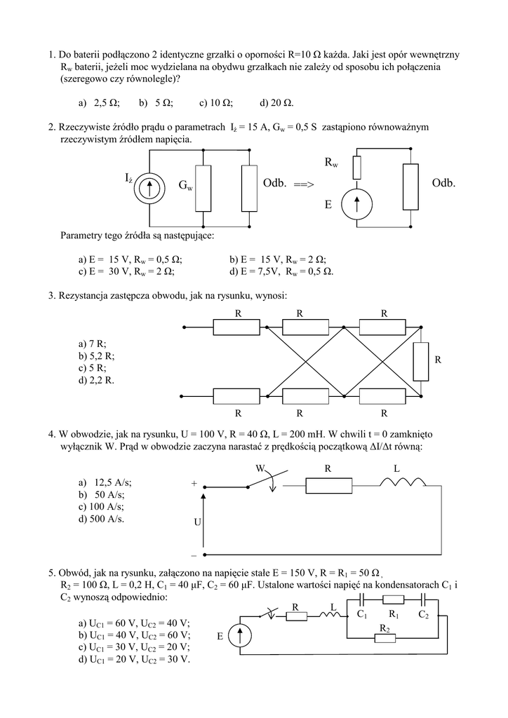 1. Do baterii podłączono 2 identyczne grzałki o oporności R=10 Ω kaŜda. Jaki jest opór wewnętrzny Rw baterii, jeŜeli moc wydzielana na obydwu grzałkach nie zaleŜy od sposobu ich połączenia (szeregowo czy równolegle)? a) 2,5 Ω; b) 5 Ω; c) 10 Ω; d) 20 Ω. 2. Rzeczywiste źródło prądu o parametrach Iź = 15 A, Gw = 0,5 S zastąpiono równowaŜnym rzeczywistym źródłem napięcia. Rw Iź Odb. ==> Gw Odb. E Parametry tego źródła są następujące: a) E = 15 V, Rw = 0,5 Ω; c) E = 30 V, Rw = 2 Ω; b) E = 15 V, Rw = 2 Ω; d) E = 7,5V, Rw = 0,5 Ω. 3. Rezystancja zastępcza obwodu, jak na rysunku, wynosi: R R R a) 7 R; b) 5,2 R; c) 5 R; d) 2,2 R. R R R R 4. W obwodzie, jak na rysunku, U = 100 V, R = 40 Ω, L = 200 mH. W chwili t = 0 zamknięto wyłącznik W. Prąd w obwodzie zaczyna narastać z prędkością początkową ∆I/∆t równą: W a) 12,5 A/s; b) 50 A/s; c) 100 A/s; d) 500 A/s. R L + U – 5. Obwód, jak na rysunku, załączono na napięcie stałe E = 150 V, R = R1 = 50 Ω , R2 = 100 Ω, L = 0,2 H, C1 = 40 µF, C2 = 60 µF. Ustalone wartości napięć na kondensatorach C1 i C2 wynoszą odpowiednio: R L C1 R1 C2 a) UC1 = 60 V, UC2 = 40 V; R2 b) UC1 = 40 V, UC2 = 60 V; E c) UC1 = 30 V, UC2 = 20 V; d) UC1 = 20 V, UC2 = 30 V. 6. Uzwojenie wzbudzenia prądnicy wyposaŜone jest w rezystor gaszący (dołączony równolegle) w celu uniknięcia duŜych przepięć powstających przy przerywaniu prądu stałego. JeŜeli napięcie powstające przy odłączaniu uzwojenia nie moŜe przekroczyć 3-krotnej wartości napięcia znamionowego, to rezystancja Rg tego rezystora nie moŜe być większa niŜ: W a) 3Rw; b) 2Rw; Lw c) Rw; UN Rg 1 d) Rw. 3 Rw 7. W trzech wierzchołkach kwadratu o boku a znajdują się jednakowe ładunki punktowe +Q. JeŜeli ładunki te zastąpi się ładunkami o wartościach –2Q, to natęŜenie pola elektrycznego w punkcie A, będącym czwartym wierzchołkiem kwadratu: +Q a +Q a) wzrośnie dwukrotnie bez zmiany znaku; b) wzrośnie dwukrotnie i zmieni znak; c) wzrośnie 2 razy i zmieni znak; d) nie ulegnie zmianie. a +Q A 8. Pustą kulę o promieniu R naładowano powierzchniowo ładunkiem dodatnim. Rozkład potencjału wewnątrz i na zewnątrz tej kuli przedstawia rysunek: V V V a) R V b) X R c) d) R X X R 9. Płaski kondensator powietrzny, jak na rysunku, ma pojemność C1 . Po usunięciu dielektryka o εr = 2 jego pojemność C2 będzie wynosić: (załoŜono równomierny rozkład pola w obu przypadkach) 2 C1; 3 3 b) C1; 2 5 c) C1; 6 6 d) C1. 5 a) εr = 2 d d d X 10. W układzie kondensatorów powietrznych, jak na rysunku, między okładziny kondensatora dołączonego do punktów K i L wstawiono dielektryk o εr = 3. Pojemność zastępcza układu widziana z zacisków A i B: C A a) nie zmieni się; b) wzrośnie 3 razy; c) wzrośnie 4/3 razy; d) wzrośnie 12/11 razy. C C C K C L C B 11. Jaka musi być wartość natęŜenia prądu w cewce obwodu magnetycznego, jak na rysunku, aby indukcja magnetyczna w rdzeniu ze stali krzemowej (4% Si) była równa 0,4π [T]? Wymiary rdzenia w [mm], δ = 0,2 mm, liczba zwojów z = 2000. ZałoŜyć, Ŝe indukcja w szczelinie powietrznej jest równa indukcji w rdzeniu. 250 50 50 50 50 z 200 δ a) ~ 0,45 A; b) ~ 0,75 A; c) ~ 0,9 A; d) ~ 1,5 A. 50 I 12. W obwodzie, jak w zadaniu 11, otrzymaną wartość prądu zmniejszono „k” razy, tak, Ŝe strumień magnetyczny w rdzeniu zmniejszył się dwukrotnie. Ile wynosi współczynnik „k”? a) k = 2; b) 1<k<2; c) k<1; d) k>2. 13. Związek natęŜenia pola magnetycznego z natęŜeniem prądu elektrycznego określa prawo: a) Coulombe'a; b) Gaussa; c) Ampere'a; d) Biota-Savarta. 14. Źródło o napięciu U dołączono do okręgu wykonanego z drutu oporowego, w wyniku czego w łukach AKB i ALB płyną prądy. Wartość indukcji magnetycznej w środku okręgu: a) jest największa, gdy łuki AKB i ALB są jednakowej długości; b) jest najmniejsza, gdy długość jednego łuku jest równa długości obwodu okręgu, a długość drugiego łuku jest równa zero; c) jest równa zero niezaleŜnie od długości obu łuków (przy załoŜeniu, Ŝe punkty A i B się nie pokrywają); d) jest największa, gdy stosunek długości dłuŜszego łuku do krótszego jest równy stosunkowi długości obwodu okręgu do długości dłuŜszego łuku (tzw. złoty podział). + A U O K B — L 15. Przez cewkę o indukcyjności L1 = 1 H przepływa prąd I1 = 10 A, a przez cewkę o indukcyjności L2 = 0,5 H, prąd I2 = 20 A. Jaki jest współczynnik sprzęŜenia cewek k, jeśli energia zgromadzona w polu magnetycznym układu jest przy sprzęŜeniu zgodnym cewek 2 razy większa niŜ przy sprzęŜeniu przeciwnym? a) 2 ; 2 b) 2 ; 4 c) 1 ; 2 d) 1 . 4 16. W jednorodnym polu magnetycznym o indukcji B = 0,5 T wiruje pręt o długości l = 0,2 m. Oś obrotu przechodzi przez koniec pręta, jest prostopadła do jego osi i równoległa do linii pola magnetycznego. JeŜeli w pręcie indukuje się napięcie E = 1 V, to stała prędkość kątowa wirowania pręta ω wynosi: a) 25 rad/s; b) 50 rad/s; c) 100 rad/s; d) 200 rad/s. 17. W obwodzie, jak na rysunku, e1 = 282 cos(ωt); e2 = 141sin(ωt), f = 50 Hz, R1 = XL = XC = 15 Ω, R2 = R3 = 10 Ω, R4 = 5 Ω. Wartość skuteczna prądu I4 wynosi: R4 b I4 a a) 2,5 A; b) 5 A; R1 R2 c) 5 2 A; L E1 E2 d) 7,5 A. R3 C c 18. W obwodzie, jak na rysunku, u = 2 100 sin(ωt), R = 20 Ω, R1 = 10 Ω, XC = 30Ω. Moc czynna P i moc bierna Q wydawane ze źródła, wynoszą odpowiednio: 3R C R1 a) 100 W, –250 VAr; b) 145 W, –250 VAr; c) 160 W, 120 VAr; R U d) 160 W, –120 VAr. R R 3R 19. W obwodzie zasilanym napięciem sinusoidalnym, jak na rysunku, parametry są następujące: R1 = R2 = 30 Ω , XL1 = 70 Ω, XL2 = 50 Ω, XC1 = 30 Ω, XC2 = 10 Ω. Źródło napięcia jest idealne. Jeśli przy otwartym wyłączniku W amperomierz wskazuje prąd I = 5 A, to wskazania mierników przy zamkniętym wyłączniku są następujące: L1 A a) U = 500 V, I = 10 A; b) U = 170 V, I = 3,4 A; R2 c) U = 1