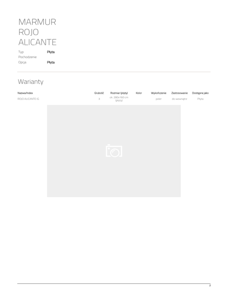 MARMUR ROJO ALICANTE Typ Płyta Pochodzenie Opcja Płyta Warianty Nazwa/Index ROJO ALICANTE IG Grubość Rozmiar (płyty) 3 ok. 280x160 cm (płyty) Kolor Wykończenie Zastosowanie Dostępne jako poler do wewnątrz Płyta 1