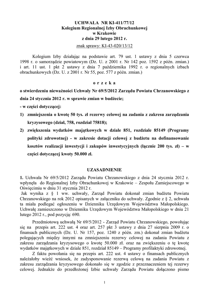 UCHWAŁA NR KI-411/77/12 Kolegium Regionalnej Izby Obrachunkowej w Krakowie z dnia 29 lutego 2012 r. znak sprawy: KI-43-020/13/12 Kolegium Izby działając na podstawie art. 79 ust. 1 ustawy z dnia 5 czerwca 1998 r. o samorządzie powiatowym (Dz. U. z 2001 r. Nr 142 poz. 1592 z późn. zmian.) i art. 11 ust. 1 pkt 2 ustawy z dnia 7 października 1992 r. o regionalnych izbach obrachunkowych (Dz. U. z 2001 r. Nr 55, poz. 577 z późn. zmian.) or ze ka o stwierdzeniu nieważności Uchwały Nr 69/5/2012 Zarządu Powiatu Chrzanowskiego z dnia 24 stycznia 2012 r. w sprawie zmian w budżecie; - w części dotyczącej: 1) zmniejszenia o kwotę 50 tys. zł rezerwy celowej na zadania z zakresu zarządzania kryzysowego (dział, 758, rozdział 75818); 2) zwiększenia wydatków majątkowych w dziale 851, rozdziale 85149 (Programy polityki zdrowotnej) - w zakresie dotacji celowej z budżetu na dofinansowanie kosztów realizacji inwestycji i zakupów inwestycyjnych (łącznie 200 tys. zł) – w części dotyczącej kwoty 50.000 zł. UZASADNIENIE 1. Uchwała Nr 69/5/2012 Zarządu Powiatu Chrzanowskiego z dnia 24 stycznia 2012 r. wpłynęła do Regionalnej Izby Obrachunkowej w Krakowie – Zespołu Zamiejscowego w Oświęcimiu w dniu 31 stycznia 2012 r. Jak wynika z § 1 ww. uchwały, Zarząd Powiatu dokonał zmian budżetu Powiatu Chrzanowskiego na rok 2012 opisanych w załączniku do uchwały. Zgodnie z § 2, uchwała ta miała podlegać ogłoszeniu w Dzienniku Urzędowym Województwa Małopolskiego. Uchwałę zamieszczono w Dzienniku Urzędowym Województwa Małopolskiego w dniu 21 lutego 2012 r., pod pozycją: 690. Przedmiotową uchwałą Nr 69/5/2012 - Zarząd Powiatu Chrzanowskiego, powołując się na przepis art. 222 ust. 4 oraz art. 257 pkt 3 ustawy z dnia 27 sierpnia 2009 r. o finansach publicznych (Dz. U. Nr 157, poz. 1240 z późn. zm.) dokonał zmian budżetu polegających między innymi na zmniejszeniu rezerwy celowej na zadania Powiatu z zakresu zarządzania kryzysowego o kwotę 50.000 zł. oraz na zwiększeniu o tę kwotę wydatków majątkowych w dziale 851, rozdział 85149 – Programy profilaktyki zdrowotnej. Z faktu powołania się na przepis art. 222 ust. 4 ustawy o finansach publicznych należałoby wieźć wniosek, że zadysponowanie rezerwą celową na zadania Powiatu z zakresu zarządzania kryzysowego dokonało się w zgodzie z przeznaczeniem tej rezerwy celowej. Jednakże do przedłożonej Izbie uchwały Zarządu Powiatu dołączono pismo 1 Przewodniczącego Rady Powiatu Chrzanowskiego informujące o pozytywnej opinii Komisji Budżetu i Finansów Rady Powiatu Chrzanowskiego dotyczącej zmiany przeznaczenia rezerwy celowej na zadania z zakresu zarządzania kryzysowego. Zgodnie z informacją, ww. rezerwa celowa w kwocie 50.000 zł została przeznaczona na sfinansowanie zadań w zakresie ochrony zdrowia, tj. na sfinansowanie zakupu wyposażenia karetki dla Szpitala Powiatowego w Chrzanowie. Jak wynika z załącznika do uchwały Nr 69/5/2012, środki z rezerwy celowej na zadania z zakresu zarządzania kryzysowego są składową kwoty dotacji z budżetu na dofinansowanie do zakupów inwestycyjnych w dziale 851 (Ochrona zdrowia), rozdziale 85149 – Programy profilaktyki zdrowotnej - w łącznej kwocie 200 tys. zł. 2. Badając przekazaną uchwałę 69/5/2012, Kolegium Regionalnej Izby Obrachunkowej w Krakowie stwierdziło, iż dokonana przez Zarząd Powiatu Chrzanowskiego zmiana budżetu narusza dotyczące wykorzystania rezerwy na zarządzanie kryzysowe – przepis art. 26 ust. 4 ustawy z dnia 26 kwietnia 2007 r. o zarządzaniu kryzysowym (Dz. U. Nr 89, poz. 590 z późn. zm.) w związku z art. 222 ust. 2 pkt 3 i art. 259 ust. 1 ustawy o finansach publicznych. W ocenie Kolegium Izby, obligatoryjnie utworzona w budżecie rezerwa na przyszłe i nie przewidywalne wydatki z tytułu zarządzania kryzysowego – z art. 222 ust. 2 pkt 3 ustawy o finansach publicznych i art. 26 ust. 4 ustawy o zarządzeniu kryzysowym - nie mogła być (i to zaraz po uchwaleniu budżetu 2012 r.) rozdysponowana na cele (wydatki) nie związane w najmniejszym stopniu z realizacją zadań Powiatu z zakresu zarządzania kryzysowego. Rezerwa ta nie powinna była posłużyć na wydatek związany z zakupem wyposażenia karetki dla Szpitala, ujmowany w rozdziale 85149 – Programy profilaktyki zdrowotnej. Odnosząc się do wyposażenia karetki dla Szpitala, przyszłe wykorzystanie samochodu (w ramach programu profilaktyki zdrowotnej) nie służy zarządzaniu kryzysowemu z art. 2 ustawy o zarządzeniu kryzysowym, aby zakup pojazdu mógł zostać sfinansowany z rezerwy celowej z art. 26 ust. 4 tej ustawy. Zarządzanie kryzysowe, jako zadanie obowiązkowe własne Powiatu Chrzanowskiego, jest bowiem (cyt.): „działalnością organów administracji publicznej będącą elementem kierowania bezpieczeństwem narodowym, która polega na zapobieganiu sytuacjom kryzysowym, przygotowaniu do przejmowania nad nimi kontroli w drodze zaplanowanych działań, reagowaniu w przypadku wystąpienia sytuacji kryzysowych, usuwaniu ich skutków oraz odtwarzaniu zasobów i infrastruktury krytycznej. O ile nie należy wykluczać tego, że rzeczona karetka (z jej wyposażeniem) mogłaby akurat kiedyś zostać wykorzystana w przypadku wystąpienia przyszłej „sytuacji kryzysowej”, jednak jej wykorzystanie (eksploatacja) nie służyłaby wyłącznie (a tylko marginalnie) „zarządzaniu kryzysowemu”. Brak jest również dowodów na to, że kwestionowany zakup wyposażenia karetki (w ramach programu profilaktyki zdrowotnej) spowodowany jest potrzebę przywrócenia Szpitalowi wcześniej utraconego samochodu, w warunkach, gdy był wykorzystany do likwidacji skutków sytuacji kryzysowej. Gdyby tak było to, zabezpieczenie środków na zakup (tj. odtworzenie utraconej karetki) zostałoby zaplanowane w wyniku przeniesienia środków z ww. rezerwy do odpowiedniego dla finansowania zadań Powiatu z ustawy o zarządzaniu kryzysowym - działu 754