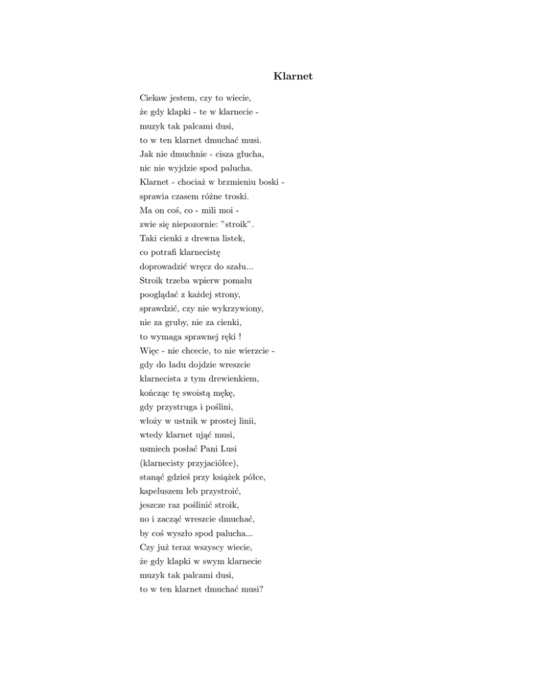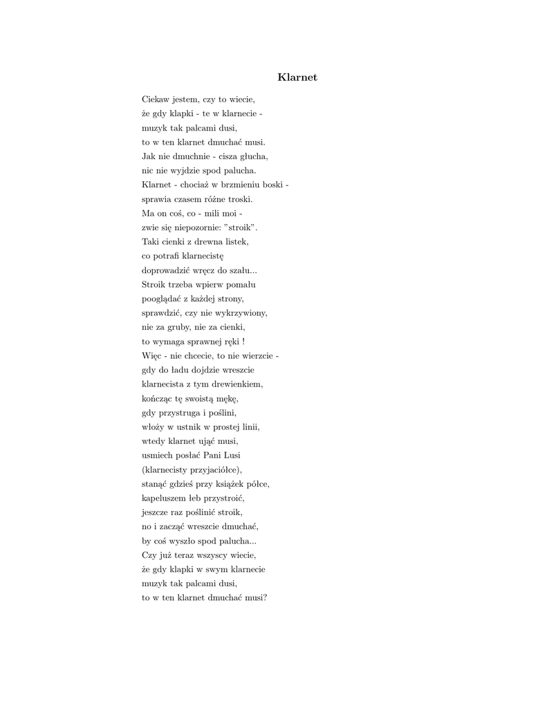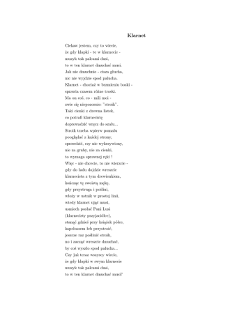 Klarnet Ciekaw jestem, czy to wiecie, że gdy klapki - te w klarnecie muzyk tak palcami dusi, to w ten klarnet dmuchać musi. Jak nie dmuchnie - cisza głucha, nic nie wyjdzie spod palucha. Klarnet - chociaż w brzmieniu boski sprawia czasem różne troski. Ma on coś, co - mili moi zwie się niepozornie: ”stroik”. Taki cienki z drewna listek, co potrafi klarnecistę doprowadzić wręcz do szału... Stroik trzeba wpierw pomału pooglądać z każdej strony, sprawdzić, czy nie wykrzywiony, nie za gruby, nie za cienki, to wymaga sprawnej ręki ! Więc - nie chcecie, to nie wierzcie gdy do ładu dojdzie wreszcie klarnecista z tym drewienkiem, kończąc tę swoistą mękę, gdy przystruga i poślini, włoży w ustnik w prostej linii, wtedy klarnet ująć musi, usmiech posłać Pani Lusi (klarnecisty przyjaciółce), stanąć gdzieś przy książek półce, kapeluszem łeb przystroić, jeszcze raz poślinić stroik, no i zacząć wreszcie dmuchać, by coś wyszło spod palucha... Czy już teraz wszyscy wiecie, że gdy klapki w swym klarnecie muzyk tak palcami dusi, to w ten klarnet dmuchać musi?