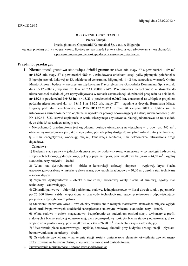 Biłgoraj, dnia 27.09.2012 r. DRM/2372/12 OGŁOSZENIE O PRZETARGU Prezes Zarządu Przedsiębiorstwa Gospodarki Komunalnej Sp. z o.o. w Biłgoraju ogłasza przetarg ustny nieograniczony, licytacyjny na sprzedaż prawa wieczystego użytkowania nieruchomości, z prawem umownym pierwokupu dotychczasowego dzierżawcy. Przedmiot przetargu: 1. Nieruchomość gruntowa stanowiąca działki gruntu: nr 18/24 ark. mapy 27 o powierzchni – 59 m2, 2 nr 18/25 ark. mapy 27 o powierzchni 989 m , zabudowana obiektami stacji paliw płynnych, położonej w Biłgoraju przy ul. Łąkowej nr 13, oddalona od centrum m. Biłgoraj ok. 1 – 2 km, stanowiąca własność Gminy Miasto Biłgoraj, będąca w wieczystym użytkowaniu Przedsiębiorstwa Gospodarki Komunalnej Sp. z o.o. do dnia 05.12.2089 r., wpisana do KW nr ZA1B/00001284/6. Przedmiotowa nieruchomość w stosunku do nieruchomości sąsiednich jest uprzywilejowana w ramach ustanowionej służebności przejazdu na działkach: nr 18/26 o powierzchni 0,0453 ha, nr 18/23 o powierzchni 0,0060 ha, oznaczonej na „Mapie z projektem podziału nieruchomości dz. nr. 18/13 i nr 18/22 ark. mapy 27” - zgodnie z decyzją Burmistrza Miasta Biłgoraj podziału nieruchomości, nr PTR.6831.25.2012.3 z dnia 20 sierpnia 2012 r. Ustala się, że ustanowiona służebność będzie odpłatna w wysokości połowy obowiązującej dla danej nieruchomości tj. dz. Nr 18/26 i 18/23, stawki odpłatności z tytułu wieczystego użytkowania, płatnej jednorazowo do roku z dołu tj. do dnia 15 stycznia za ubiegły rok. - Nieruchomość przedmiotowa jest ogrodzona, posiada utwardzoną nawierzchnię – o pow. ok. 345 m2 , obecnie wykorzystywana jest jako stacja paliw, posiada pełny dostęp do urządzeń infrastruktury technicznej, tj – linia energetyczna, wodociąg miejski, kanalizacja sanitarna, linia telefoniczna, utwardzona droga dojazdowa. - Zabudowa 1) Budynek stacji paliwa – jednokondygnacyjny, nie podpiwniczony, wzniesiony w technologii tradycyjnej, stropodach betonowy, jednospadowy, pokryty papą na lepiku, pow. użytkowa budynku – 44,50 m2 , ogólny stan techniczny budynku – średni. 2) Wiata nad dystrybutorami – obiekt o konstrukcji stalowej, słupowo – ryglowej, kryty blachą trapezową,wyposażony w instalację elektryczną, powierzchnia zabudowy – 30,00 m2 , ogólny stan techniczny – zadowalający. 3) Wysepka dystrybutorów – obiekt o konstrukcji betonowej okuty blachą aluminiową, ogólny stan techniczny – zadowalający. 4) Zbiorniki paliwowe – zbiorniki podziemne, stalowe, jednopłaszczowe, w ilości dwóch sztuk o pojemności po 25 000 litrów każdy, wyposażone w przewody technologiczne, ssące, przelewowe i odpowietrzające, połączone z dystrybutorem paliwa. 5) Studzienki nadzbiornikowe – dwa obiekty wzniesione z różnych materiałów, stanowiące miejsce wglądu do zbiorników paliwowych, studzienki zabezpieczone stalowym i włazami, stan techniczny – średni. 6) Wiata stalowa – obiekt magazynowy, bezpośrednio za budynkiem obsługi stacji, wykonany z profili stalowych i blachy stalowej ocynkowanej, dach jednospadowy, pokryty blachą stalową ocynkowaną, drzwi wejściowe w postaci kraty, pow. użytkowa obiektu – 26,80 m 2 , stan techniczny – zadowalający. 7) Utwardzenie placu manewrowego - trylinką betonową, chodnik przy budynku obsługi stacji - płytkami betonowymi, stan techniczny – średni. 8) Oświetlenie zewnętrzne – na terenie stacji zostały umieszczone elementy oświetlenia zewnętrznego, zlokalizowane na budynku obsługi stacji oraz na wiacie nad dystrybutorem. 2. Przeznaczenie nieruchomości i sposób zagospodarowania: Przedmiotowa nieruchomość jest obecnie użytkowana jako stacja paliw. Dla nieruchomości brak jest obecnie obowiązującego miejscowego planu zagospodarowania przestrzennego. Zgodnie z ustaleniami studium uwarunkowań i kierunków zagospodarowania przestrzennego m. Biłgoraja nieruchomość położona jest w obszarze oznaczonym symbolem „PS – biznes – przemysł, składy itp. wymagające izolacji” . W bezpośrednim sąsiedztwie i otoczeniu nieruchomości znajdują się inne zabudowane nieruchomości o charakterze usługowo – handlowym, zabudowania mieszkalne. 3. Cena wywoławcza – 360 000,00 zł (sprzedaż zwolniona), słownie zł – trzysta sześćdziesiąt tysięcy zł 00/100. 4. Koszty sporządzenia aktu notarialnego ponosi kupujący (nabywca nieruchomości) Warunki przetargu: 1. Sprzedaż z prawem pierwokupu dotychczasowego dzierżawcy przedmiotowej nieruchomości. 2. Przetarg odbędzie się w dniu 12 października 2012 r. o godz. 10:00 w pokoju nr 5 – świetlica, w siedzibie Przedsiębiorstwa Gospodarki Komunalnej Sp. z o.o. w Biłgoraju, przy ul. Łąkowej 13. 3. Przed przystąpieniem do przetargu wymagane jest wniesienie wadium. Wadium wnosi się w pieniądzu. 4. Wadium w wysokości - 36 000,00 zł (słownie zł: trzydzieści sześć tysięcy 00/100) należy wpłacić na konto Przedsiębiorstwa Gospodarki Komunalnej Sp. z o.o. w Biłgoraju, w PKO BP o/Biłgoraj Nr 42 1020 5385 0000 9602 0002 5627 , do dnia 12 października 2012 r. (za dzień wpłaty wadium uznaje się dzień wpływu środków finansowych na konto spółki), co najmniej jedną godzinę przed otwarciem przetargu (tj. do godz. 9:00). 5. Przed otwarciem przetargu uczestnicy zobowiązani są przedłożyć komisji przetargowej dowód wpłacenia wadium. 6. Postąpienia licytacji – 5 000,00 zł. 7. Nabywcą przedmiotowej nieruchomości zostanie osoba która zaoferuje najwyższą cenę o ile dotychczasowy dzierżawca przedmiotowej nieruchomości nie zaaprobuje tej ceny najwyższej w ramach przysługującego mu prawa pierwokupu. Prawo pierwokupu umowne przysługuje dotychczasowemu dzierżawcy przedmiotowej nieruchomości a nadto przysługuje ustawowe prawo pierwokupu Gminie Miasto Biłgoraj z mocy ustanowionego prawa wieczystego użytkowania przedmiotowej nieruchomości. 8. W przypadku uchylenia się nabywcy, u