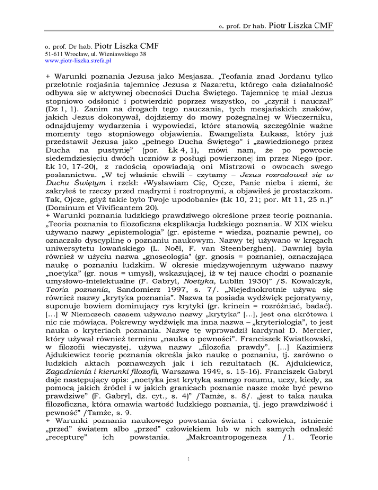 o. prof. Dr hab. Piotr Liszka CMF o. prof. Dr hab. Piotr Liszka CMF 51-611 Wrocław, ul. Wieniawskiego 38 www.piotr-liszka.strefa.pl + Warunki poznania Jezusa jako Mesjasza. „Teofania znad Jordanu tylko przelotnie rozjaśnia tajemnicę Jezusa z Nazaretu, którego cała działalność odbywa się w aktywnej obecności Ducha Świętego. Tajemnicę tę miał Jezus stopniowo odsłonić i potwierdzić poprzez wszystko, co „czynił i nauczał” (Dz 1, 1). Zanim na drogach tego nauczania, tych mesjańskich znaków, jakich Jezus dokonywał, dojdziemy do mowy pożegnalnej w Wieczerniku, odnajdujemy wydarzenia i wypowiedzi, które stanowią szczególnie ważne momenty tego stopniowego objawienia. Ewangelista Łukasz, który już przedstawił Jezusa jako „pełnego Ducha Świętego” i „zawiedzionego przez Ducha na pustynię” (por. Łk 4, 1), mówi nam, że po powrocie siedemdziesięciu dwóch uczniów z posługi powierzonej im przez Niego (por. Łk 10, 17-20), z radością opowiadają oni Mistrzowi o owocach swego posłannictwa. „W tej właśnie chwili – czytamy – Jezus rozradował się w Duchu Świętym i rzekł: «Wysławiam Cię, Ojcze, Panie nieba i ziemi, że zakryłeś te rzeczy przed mądrymi i roztropnymi, a objawiłeś je prostaczkom. Tak, Ojcze, gdyż takie było Twoje upodobanie» (Łk 10, 21; por. Mt 11, 25 n.)” (Dominum et Vivificantem 20). + Warunki poznania ludzkiego prawdziwego określone przez teorię poznania. „Teoria poznania to filozoficzna eksplikacja ludzkiego poznania. W XIX wieku używano nazwy „epistemologia” (gr. episteme = wiedza, poznanie pewne), co oznaczało dyscyplinę o poznaniu naukowym. Nazwy tej używano w kręgach uniwersytetu lowańskiego (L. Noël, F. van Steenberghen). Dawniej była również w użyciu nazwa „gnoseologia” (gr. gnosis = poznanie), oznaczająca naukę o poznaniu ludzkim. W okresie międzywojennym używano nazwy „noetyka” (gr. nous = umysł), wskazującej, iż w tej nauce chodzi o poznanie umysłowo-intelektualne (F. Gabryl, Noetyka, Lublin 1930)” /S. Kowalczyk, Teoria poznania, Sandomierz 1997, s. 7/. „Niejednokrotnie używa się również nazwy „krytyka poznania”. Nazwa ta posiada wydźwięk pejoratywny, suponuje bowiem dominujący rys krytyki (gr. krinein = rozróżniać, badać). […] W Niemczech czasem używano nazwy „krytyka” […], jest ona skrótowa i nic nie mówiąca. Pokrewny wydźwięk ma inna nazwa – „kryteriologia”, to jest nauka o kryteriach poznania. Nazwę tę wprowadził kardynał D. Mercier, który używał również terminu „nauka o pewności”. Franciszek Kwiatkowski, w filozofii wieczystej, używa nazwy „filozofia prawdy”. […] Kazimierz Ajdukiewicz teorię poznania określa jako naukę o poznaniu, tj. zarówno o ludzkich aktach poznawczych jak i ich rezultatach (K. Ajdukiewicz, Zagadnienia i kierunki filozofii, Warszawa 1949, s. 15-16). Franciszek Gabryl daje następujący opis: „noetyka jest krytyką samego rozumu, uczy, kiedy, za pomocą jakich źródeł i w jakich granicach poznanie nasze może być pewno prawdziwe” (F. Gabryl, dz. cyt., s. 4)” /Tamże, s. 8/. „jest to taka nauka filozoficzna, która omawia wartość ludzkiego poznania, tj. jego prawdziwość i pewność” /Tamże, s. 9. + Warunki poznania naukowego powstania świata i człowieka, istnienie „przed” światem albo „przed” człowiekiem lub w nich samych odnaleźć „recepturę” ich powstania. „Makroantropogeneza /1. Teorie 1 o. prof. Dr hab. Piotr Liszka CMF niekreacjonistyczne. Termin „antropogeneza” obejmuje w węższym znaczeniu „pochodzenie” człowieka, czyli protologię, a w szerszym znaczeniu – ciągłe stawanie się i dzianie się ludzkości aż po jej kres na ziemi. Nie sposób jednak omawiać tu znaczenia szerokiego, bo weszlibyśmy na teren historii uniwersalnej, teologii dziejów, teologii „międzyczasu” (między początkiem a końcem ludzkości) oraz eschatologii. Zajmiemy się tu pokrótce tylko pierwszym zagadnieniem antropogenezy: pojawieniem się człowieka na ziemi. W tym punkcie zajmujemy się makroantropogenezą, czyli protologią wielką (filogenezą), nie zaś mikroantropogenezą, czyli protologią małą (ontogenezą, jawieniem się jednostek). Przy tym na makrogenezę chcemy spojrzeć możliwie wielostronnie, nie tylko ściśle konfesyjnie. Dlatego przedstawimy też niektóre teorie niekreacjonistyczne. 1° Teoria agnostyczna. Wielu uczonych, mających duży zmysł tajemnicy makroantropogenezy, rezygnuje w ogóle z teorii powstania świata, a w nim ludzkości, na płaszczyźnie filozofii i nauk szczegółowych (E. Kant, A. Einstein, K. Barth, A. Wolszczan). Dopuszczają oni pewne odpowiedzi, płynące jedynie z przekonań czysto osobistych lub z wiary religijnej” /Cz. S. Bartnik, Dogmatyka Katolicka, t. 1, Redakcja Wydawnictw KUL, Lublin 2000, s. 418/. W nauce, według nich, trzeba by w tej kwestii wznieść się ponad wszelkie doświadczenie (experientia) i ponad ten świat w ogóle, a to jest niemożliwe w nauce i w filozofii. Żeby poznać naukowo powstanie świata i człowieka, trzeba by istnieć „przed” światem albo „przed” człowiekiem lub w nich samych odnaleźć „recepturę” ich powstania. Przy tym agnostycyzm przybiera z reguły dwie postacie: negatywną – bliską w ogóle zaprzeczaniu początków i wrogą wobec kreacjonizmu, oraz pozytywną – kontemplującą samą możliwość początków, ale pozostawiającą odpowiedź samej teologii. Tutaj też przypominam, że według wielkiej rzeszy uczonych protestanckich nawet teologia może mówić jedynie o „dziejach zbawienia” świata i człowieka, a nic nie może powiedzieć o dziejach doczesnych, a więc, czy ludzkość została stworzona, czy nie stworzona na płaszczyźnie „świeckiej”. O stworzeniu, według nich, nie może nic powiedzieć żaden rozum: ani potoczny, ani naukowy, ani filozoficzny, ani wreszcie i teologiczny, a jedynie subiektywna wiara. Ka