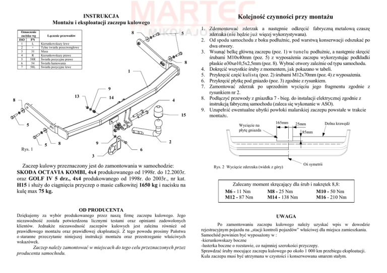 INSTRUKCJA MontaŜu i eksploatacji zaczepu kulowego Oznaczenie zacisku wg ISO PN 1 L 2 + 3 31 4 R 5 58R 6 54 7 58L Kolejność czynności przy montaŜu 8 Łączenie przewodów 5 Kierunkowskazy lewe Tylne światła przeciwmgłowe Masa Kierunkowskazy prawe Światła pozycyjne prawe Światła hamowania Światła pozycyjne lewe 8 1 9 13 8 14 4 15 5 1. Zdemontować zderzak a następnie odkręcić fabryczną metalową czaszę zderzaka (nie będzie juŜ więcej wykorzystywana). 2. Od spodu samochodu z boku podłuŜnic, pod warstwą konserwacji odszukać po dwa otwory. 3. Wsunąć belkę główną zaczepu (poz. 1) w tunelu podłuŜnic, a następnie skręcić śrubami M10x40mm (poz. 5) z wyposaŜenia zaczepu wykorzystując podkładki płaskie ø30xø10,5x2,5mm (poz. 8). Wybrać otwory zaleŜnie od typu samochodu. 4. Dokręcić wszystkie śruby z momentem, jak pokazano w tabeli. 5. Przykręcić część kulistą (poz. 2) śrubami M12x70mm (poz. 4) z wyposaŜenia. 6. Przykręcić płytkę pod gniazdo (poz. 3) zgodnie z rysunkiem. 7. Zamontować zderzak po uprzednim wycięciu jego fragmentu zgodnie z rysunkiem nr 2. 8. Podłączyć przewody z gniazdka 7 - bieg. do instalacji elektrycznej zgodnie z instrukcją fabryczną samochodu (zaleca się wykonanie w ASO). 9. Uzupełnić ewentualne ubytki powłoki malarskiej zaczepu powstałe w trakcie montaŜu. Wycięcie na płytę gniazda 5 Rys. 1 25mm Dolna krawędź 85mm 2 9 8 165mm 6 3 Zaczep kulowy przeznaczony jest do zamontowania w samochodzie: SKODA OCTAVIA KOMBI, 4x4 produkowanego od 1998r. do 12.2003r. oraz GOLF IV 5 drz., 4x4 produkowanego od 1998r. do 2003r., nr kat. H15 i słuŜy do ciągnięcia przyczep o masie całkowitej 1650 kg i nacisku na kulę max 75 kg. Rys. 2 Wycięcie zderzaka (widok z góry) Oś symetrii Zalecany moment skręcający dla śrub i nakrętek 8,8: M6 - 11 Nm M8 - 25 Nm M10 - 50 Nm M12 - 87 Nm M14 - 138 Nm M16 - 210 Nm OD PRODUCENTA Dziękujemy za wybór produkowanego przez naszą firmę zaczepu kulowego. Jego niezawodność została potwierdzona licznymi testami oraz opiniami zadowolonych klientów. JednakŜe niezawodność zaczepów kulowych jest zaleŜna równieŜ od prawidłowego montaŜu oraz prawidłowej eksploatacji. Z tego powodu prosimy Państwa o staranne przeczytanie niniejszej instrukcji montaŜu oraz przestrzeganie właściwych wskazówek. Zaczep naleŜy zamontować w miejscach do tego celu przeznaczonych przez producenta samochodu. UWAGA Po zamontowaniu zaczepu kulowego naleŜy uzyskać wpis w dowodzie rejestracyjnym pojazdu na „stacji kontroli pojazdów” właściwej dla miejsca zamieszkania. Samochód powinien być wyposaŜony w : -kierunkowskazy boczne -lusterka boczne o rozstawie, co najmniej szerokości przyczepy. Sprawdzać śruby mocujące zaczepu kulowego po około 1 000 km przebiegu eksploatacji. Kula zaczepu musi być utrzymana w czystości i konserwowana smarem stałym. PPUH AUTO-HAK S.J. WyposaŜenie zaczepu: Produkcja Zaczepów Kulowych Henryk & Zbigniew Nejman 76-200 SŁUPSK ul. Słoneczna 16K tel/fax (059) 8-414-414; 8-414-413 E-mail: [email protected] www. autohak.com.pl Zaczep kulowy bez wyposaŜenia elektrycznego Klasa: A50-X Nr kat. H15 Przeznaczony do zamontowania w samochodzie: SKODA OCTAVIA KOMBI 4x4 produkowanego od 1998r. do 12.2003r. oraz VW GOLF IV 5 drz., 4x4 produkowanego od 1998r. do 2003r. Dane techniczne: Wartość siły D: 9,2 kN maksymalna masa przyczepy: 1650 kg maksymalny nacisk na kulę: 75 kg Numer homologacji zgodnie z wytycznymi regulaminu EKG/ONZ 55.01: E20-55R-01 1497 KARTA GWARANCYJNA Producent udziela gwarancji niniejszą kartą gwarancyjną na okres 24 miesięcy licząc od dnia zakupu zaczepu kulowego do samochodu: SKODA OCTAVIA KOMBI 4x4 produkowanego od 1998r. do 12.2003r. VOLKSWAGEN GOLF IV 5 drz. 4x4 produkowanego od 1998r. Data produkcji .............................. Data zakupu........................................ Zakres gwarancji obejmuje wyłącznie wady jakościowe wynikające z winy producenta. Gwarancja nie obejmuje natomiast uszkodzeń zawinionych przez nabywcę, wynikających z niewłaściwego montaŜu, uŜytkowania lub konserwacji, uszkodzeń mechanicznych, normalnego zuŜycia podczas eksploatacji itp. Reklamacje naleŜy zgłaszać w punkcie sprzedaŜy, składając jednocześnie kartę gwarancyjną. Usunięcie "wady" następuje po stwierdzeniu przez punkt sprzedaŜy wspólnie z producentem słuszności złoŜonej reklamacji. Reklamacja powinna być załatwiona w ciągu czternastu dni od dnia uznania reklamacji. Karta gwarancyjna jest niewaŜna jeŜeli nie jest wypełniona i podpisana. Data zgłoszenia reklamacji: ................................................................... INFORMACJA WSTĘPNA Zaczep kulowy jest skonstruowany zgodnie z zasadami bezpieczeństwa ruchu drogowego. Zaczep kulowy jest elementem wpływającym na bezpieczeństwo jazdy i moŜe zostać zainstalowany wyłącznie przez personel wyspecjalizowany. Niedopuszczalne jest dokonywanie jakichkolwiek zmian w konstrukcji zaczepu. Powoduje to wygaśniecie dopuszczenia do stosowania. W przypadku obecności masy izolacyjnej lub osłony podwozia w miejscu przylegania zaczepu, naleŜy ją usunąć. Nieosłonięte miejsca karoserii oraz wywiercone otwory naleŜy pomalować farbą antykorozyjną. Informacjami wiąŜącymi odnośnie wartości obciąŜeń są dane podawane przez producenta samochodu, względnie wartości maksymalnej masy przyczepy oraz maksymalnego nacisku na kulę, przy czym wartości parametrów zaczepu kulowego nie mogą być przekroczone. Wzór do obliczania wartości siły D: Maks. masa przyczepy [kg] x Masa całkowita samochodu [kg] 9,81 = X + 1000 Maks. masa przyczepy [kg] + Masa całkowita samochodu [kg] + D [kN]