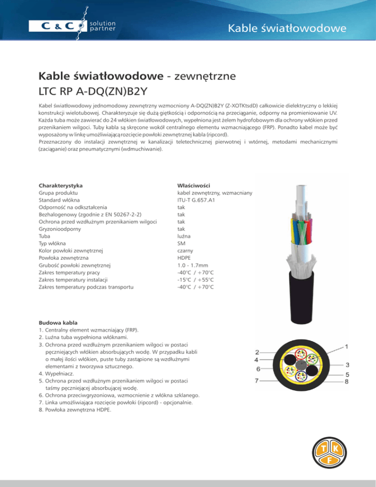 Kable światłowodowe Kable światłowodowe - zewnętrzne LTC RP A-DQ(ZN)B2Y Kabel światłowodowy jednomodowy zewnętrzny wzmocniony A-DQ(ZN)B2Y (Z-XOTKtsdD) całkowicie dielektryczny o lekkiej konstrukcji wielotubowej. Charakteryzuje się dużą giętkością i odpornością na przeciąganie, odporny na promieniowanie UV. Każda tuba może zawierać do 24 włókien światłowodowych, wypełniona jest żelem hydrofobowym dla ochrony włókien przed przenikaniem wilgoci. Tuby kabla są skręcone wokół centralnego elementu wzmacniającego (FRP). Ponadto kabel może być wyposażony w linkę umożliwiającą rozcięcie powłoki zewnętrznej kabla (ripcord). Przeznaczony do instalacji zewnętrznej w kanalizacji teletechnicznej pierwotnej i wtórnej, metodami mechanicznymi (zaciąganie) oraz pneumatycznymi (wdmuchiwanie). Charakterystyka Grupa produktu Standard włókna Odporność na odkształcenia Bezhalogenowy (zgodnie z EN 50267-2-2) Ochrona przed wzdłużnym przenikaniem wilgoci Gryzonioodporny Tuba Typ włókna Kolor powłoki zewnętrznej Powłoka zewnętrzna Grubość powłoki zewnętrznej Zakres temperatury pracy Zakres temperatury instalacji Zakres temperatury podczas transportu Właściwości kabel zewnętrzny, wzmacniany ITU-T G.657.A1 tak tak tak tak luźna SM czarny HDPE 1.0 - 1.7mm -40°C / +70°C -15°C / +55°C -40°C / +70°C Budowa kabla 1. Centralny element wzmacniający (FRP). 2. Luźna tuba wypełniona włóknami. 3. Ochrona przed wzdłużnym przenikaniem wilgoci w postaci pęczniejących włókien absorbujących wodę. W przypadku kabli o małej ilości włókien, puste tuby zastąpione są wzdłużnymi elementami z tworzywa sztucznego. 4. Wypełniacz. 5. Ochrona przed wzdłużnym przenikaniem wilgoci w postaci taśmy pęczniejącej absorbującej wodę. 6. Ochrona przeciwgryzoniowa, wzmocnienie z włókna szklanego. 7. Linka umożliwiająca rozcięcie powłoki (ripcord) - opcjonalnie. 8. Powłoka zewnętrzna HDPE. Kable światłowodowe Nazwa Nr katalogowy Konstrukcja Promień gięcia [mm] Waga [kg/km] Średnica kabla [mm] Maks. siła naprężająca [N] A-DQ(ZN)B2Y 4J 8007 7 803-00 4 x SM (2x2) 150 46 7.6 1500 A-DQ(ZN)B2Y 6J 8007 7 804-00 6 x SM (3x2) 150 47 7.6 1500 A-DQ(ZN)B2Y 8J 8007 7 805-00 8 x SM (4x2) 150 47 7.6 1500 A-DQ(ZN)B2Y 12J 8007 7 806-00 12 x SM (6x2) 150 48 7.6 1500 A-DQ(ZN)B2Y 12J 8007 7 800-00 12 x SM (2x6) 150 46 7.6 1500 A-DQ(ZN)B2Y 12J 8007 7 747-00 12 x SM (3x4) 150 47 7.6 1500 A-DQ(ZN)B2Y 12J 8007 4 172-00 12 x SM (1x12) 170 55 8.6 3500 A-DQ(ZN)B2Y 16J 8007 7 748-00 16 x SM (4x4) 150 47 7.6 1500 A-DQ(ZN)B2Y 24J 8007 7 749-00 24 x SM (6x4) 150 48 7.6 1500 A-DQ(ZN)B2Y 24J 8007 7 801-00 24 x SM (4x6) 150 47 7.6 1500 A-DQ(ZN)B2Y 24J 8007 7 750-00 24 x SM (2x12) 170 56 8.6 3500 A-DQ(ZN)B2Y 36J 8007 7 802-00 36 x SM (6x6) 150 49 7.6 1500 A-DQ(ZN)B2Y 36J 8007 7 751-00 36 x SM (3x12) 170 57 8.6 3500 A-DQ(ZN)B2Y 48J 8007 7 784-00 48 x SM (6x8) 170 58 8.6 3500 A-DQ(ZN)B2Y 48J 8007 7 752-00 48 x SM (4x12) 170 57 8.6 3500 A-DQ(ZN)B2Y 48J 8007 7 785-00 48 x SM (8x6) 180 70 9.0 3500 A-DQ(ZN)B2Y 60J 8007 7 753-00 60 x SM (5x12) 170 58 8.6 3500 A-DQ(ZN)B2Y 72J 8007 7 754-00 72 x SM (6x12) 170 59 8.6 3500 A-DQ(ZN)B2Y 96J 8007 7 755-00 96 x SM (8x12) 200 88 10.1 6000 A-DQ(ZN)B2Y 120J 8007 7 756-00 120 x SM (10x12) 230 111 11.5 6000 A-DQ(ZN)B2Y 144J 8007 7 767-00 144 x SM (12x12) 255 132 12.7 6000 A-DQ(ZN)B2Y 144J 8007 7 778-00 144 x SM (6x24) 220 102 11.1 4000 A-DQ(ZN)B2Y 192J 8007 7 779-00 192 x SM (8x24) 260 137 13.0 6000 A-DQ(ZN)B2Y 216J 8007 7 780-00 216 x SM (9x24) 275 153 13.7 6000 A-DQ(ZN)B2Y 6J 8007 4 549-00 6 x SM (3x2) 215 88 10.5 4000 A-DQ(ZN)B2Y 8J 8007 4 550-00 8 x SM (4x2) 215 88 10.5 4000 A-DQ(ZN)B2Y 12J 8007 4 551-00 12 x SM (6x2) 215 89 10.5 4000 A-DQ(ZN)B2Y 12J 8007 4 552-00 12 x SM (2x6) 210 87 10.5 4000 A-DQ(ZN)B2Y 12J 8007 4 553-00 12 x SM (3x4) 210 87 10.5 4000 A-DQ(ZN)B2Y 24J 8007 4 554-00 24 x SM (6x4) 215 91 10.5 4000 A-DQ(ZN)B2Y 24J 8007 4 555-00 24 x SM (4x6) 210 88 10.5 4000 A-DQ(ZN)B2Y 24J 8007 7 604-00 24 x SM (2x12) 210 86 10.6 4000 A-DQ(ZN)B2Y 36J 8007 4 557-00 36 x SM (6x6) 210 92 10.5 4000 A-DQ(ZN)B2Y 36J 8007 7 605-00 36 x SM (3x12) 210 87 10.6 4000 A-DQ(ZN)B2Y 48J 8007 4 559-00 48 x SM (6x8) 230 112 11.8 4000 A-DQ(ZN)B2Y 48J 8007 4 560-00 48 x SM (4x12) 230 104 11.4 4000 A-DQ(ZN)B2Y 48J 8007 7 606-00 48 x SM (8x6) 210 88 10.6 4000 C&C Partners Sp. z o.o. ul. 17 Stycznia 119, 121 64-100 Leszno Infolinia: 65 525 55 00 C&C Partners Sp. z o.o. ul. Polanki 67c 80-302 Gdańsk e-mail: [email protected] C&C Partners Sp. z o.o. ul. Malinowa 8 40- 692 Katowice www.ccpartners.pl C&C Partners Sp. z o.o. Ursynów Business Park ul. Puławska 303 wejście B 02-785 Warszawa