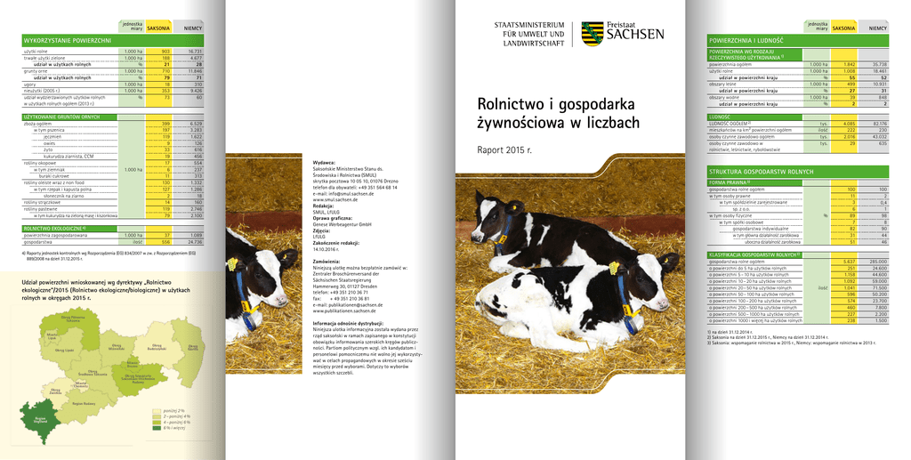 jednostka miary SAKSONIA jednostka miary SAKSONIA NIEMCY WYKORZYSTANIE POWIERZCHNI użytki rolne trwałe użytki zielone udział w użytkach rolnych grunty orne udział w użytkach rolnych ugory nieużytki (2005 r.) udział wydzierżawionych użytków rolnych w użytkach rolnych ogółem (2013 r.) UŻYTKOWANIE GRUNTÓW ORNYCH zboża ogółem w tym pszenica jęczmień owies żyto kukurydza ziarnista, CCM rośliny okopowe w tym ziemniak buraki cukrowe rośliny oleiste wraz z non food w tym rzepak i kapusta polna słonecznik na ziarno rośliny strączkowe rośliny pastewne w tym kukurydza na zieloną masę i kiszonkowa ROLNICTWO EKOLOGICZNE 4) powierzchnia zagospodarowana gospodarstwa POWIERZCHNIA I LUDNOŚĆ 1.000 ha 1.000 ha % 1.000 ha % 1.000 ha 1.000 ha % 903 188 21 710 79 18 353 73 16.731 4.677 28 11.846 71 310 9.426 60 1.000 ha 399 197 119 9 33 19 17 6 11 130 127 2 14 119 79 6.529 3.283 1.622 126 616 456 554 237 313 1.332 1.286 18 160 2.746 2.100 37 556 1.089 24.736 1.000 ha ilość 4)Raporty jednostek kontrolnych wg Rozporządzenia (EG) 834/2007 w zw. z Rozporządzeniem (EG) 889/2008 na dzień 31.12.2015 r. Udział powierzchni wnioskowanej wg dyrektywy „Rolnictwo ekologiczne”/2015 (Rolnictwo ekologiczne/biologiczne) w użytkach rolnych w okręgach 2015 r. Okręg Północna Saksonia Miasto Lipsk Okręg Miśnieński Okręg Lipski Okręg Budziszyński Okręg Görlitz Miasto Drezno Okręg Środkowa Saksonia Okręg Zwickau Miasto Chemnitz Okręg Szwajcaria Saksońska-Wschodnie Rudawy Region Rudawy Region Vogtland NIEMCY poniżej 2 % 2 – poniżej 4 % 4 – poniżej 6 % 6 % i więcej Rolnictwo i gospodarka żywnościowa w liczbach Raport 2015 r. Wydawca: Saksońskie Ministerstwo Stanu ds. Środowiska i Rolnictwa (SMUL) skrytka pocztowa 10 05 10, 01076 Drezno telefon dla obywateli: +49 351 564 68 14 e-mail: [email protected] www.smul.sachsen.de Redakcja: SMUL, LfULG Oprawa graficzna: Genese Werbeagentur GmbH Zdjęcia: LfULG Zakończenie redakcji: 14.10.2016 r. Zamówienia: Niniejszą ulotkę można bezpłatnie zamówić w: Zentraler Broschürenversand der Sächsischen Staatsregierung Hammerweg 30, 01127 Dresden telefon: +49 351 210 36 71 fax: + 49 351 210 36 81 e-mail: [email protected] www.publikationen.sachsen.de Informacja odnośnie dystrybucji: Niniejsza ulotka informacyjna została wydana przez rząd saksoński w ramach zapisanego w konstytucji obowiązku informowania szerokich kręgów publiczności. Partiom politycznym wzgl. ich kandydatom i personelowi pomocniczemu nie wolno jej wykorzystywać w celach propagandowych w okresie sześciu miesięcy przed wyborami. Dotyczy to wyborów wszystkich szczebli. POWIERZCHNIA WG RODZAJU RZECZYWISTEGO UŻYTKOWANIA 1) powierzchnia ogółem użytki rolne udział w powierzchni kraju obszary leśne udział w powierzchni kraju obszary wodne udział w powierzchni kraju 1.000 ha 1.000 ha % 1.000 ha % 1.000 ha % 1.842 1.008 55 499 27 39 2 35.738 18.461 52 10.931 31 848 2 tys. ilość tys. tys. 4.085 222 2.016 29 82.176 230 43.032 635 % 100 11 3 6 89 7 82 31 51 100 2 0,4 1 98 8 90 44 46 5.637 251 1.158 1.092 1.041 596 574 460 227 238 285.000 24.600 44.600 59.000 71.500 50.200 23.700 7.800 2.200 1.500 LUDNOŚĆ LUDNOŚĆ OGÓŁEM 2) mieszkańców na km² powierzchni ogółem osoby czynne zawodowo ogółem osoby czynne zawodowo w rolnictwie, leśnictwie, rybołówstwie STRUKTURA GOSPODARSTW ROLNYCH FORMA PRAWNA 3) gospodarstwa rolne ogółem w tym osoby prawne w tymspółdzielnie zarejestrowane sp. z o.o. w tym osoby fizyczne w tymspółki osobowe gospodarstwa indywidualne w tym główna działalność zarobkowa uboczna działalność zarobkowa KLASYFIKACJA GOSPODARSTW ROLNYCH 3) gospodarstwa rolne ogółem o powierzchni do 5 ha użytków rolnych o powierzchni 5 – 10 ha użytków rolnych o powierzchni 10 – 20 ha użytków rolnych o powierzchni 20 – 50 ha użytków rolnych o powierzchni 50 – 100 ha użytków rolnych o powierzchni 100 – 200 ha użytków rolnych o powierzchni 200 – 500 ha użytków rolnych o powierzchni 500 – 1000 ha użytków rolnych o powierzchni 1000 i więcej ha użytków rolnych ilość 1)na dzień 31.12.2014 r. 2)S aksonia na dzień 31.12.2015 r., Niemcy na dzień 31.12.2014 r. 3)S aksonia: wspomaganie rolnictwa w 2015 r., Niemcy: wspomaganie rolnictwa w 2013 r. źródła: ❘Federalny Urząd Statystyczny Niemiec ❘Instytut Obliczeń Kumulowanych Ekonomiki Krajów Związkowych ❘Federalne Ministerstwo Gospodarki Żywnościowej i Rolnictwa ❘Federalny Urząd ds. Rolnictwa i Gospodarki Żywnościowej ❘Krajowy Urząd Statystyczny Wolnego Kraju Związkowego Saksonia ❘Saksoński Urząd Krajowy ds. Środowiska, Rolnictwa i Geologii ❘Państwowe Zakłady ds. Geodanych i Pomiarów Saksonii (GeoSN) Jeżeli nie podano inaczej, prezentowane dane dotyczą 2015 r. Liczby oznakowane * stanowią dane tymczasowe. ILOŚĆ MIĘSA Z UBOJU* zwierzęta rzeźne ogółem w tymbydło i cielęta trzoda chlewna 1.000 t 15 358 279 129 94 3.224 385 302 59.361 95 17 4 12 6.781 1.132 5.116 7) b ydło, trzoda chlewna, owce – stan na dzień 03.11.2015 r., kury i nieparzystokopytne – stan na dzień 01.03.2013 r. 8) Niemiecki Związek Kontroli Wydajności i Jakości s.z. (DLQ) - rok kontrolny 01.10.2014 r. – 30.09.2015 r. 9) zwierzęta z kraju i zagranicy Wnioskowane w 2015 r. Ekologiczne Obszary Priorytetowe w myśl Rozporządzenia Wykonawczego w o płatnościach bezpośrednich (w ha) 11.116 ugory bufory i pasma obrzeżne 955 elementy krajobrazowe 812 plantacje krótkointensywne 109 poplony 51.332 motylkowe pierwsze zalesienie 15.587 217 UDZIAŁ PROCENTOWY W EKSPORCIE artykuły spożywcze i pasze produkcja napojów 19.968 569.170 4.350 727 596 148.463 39.659 16.206 431 1.742 k.N. 11) 132 879 10.076 24.583 4.006 9.911 20.126 13 7 22 12 mln euro procent 10) z akłady liczące 20 i więcej zatrudnionych 11) brak danych EKSPORT OGÓŁEM* gospodarka żywnościowa ogółem w tymmleko i produkty mleczne (bez sera i masła) ser mięso i wyroby 
