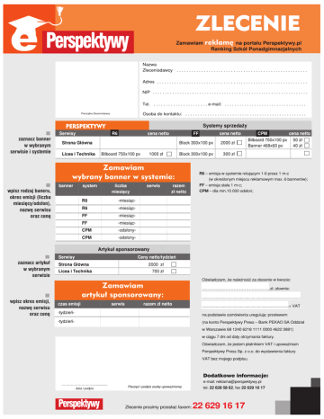 ZLECENIE e Zamawiam reklamę na portalu Perspektywy.pl Ranking Szkół Ponadgimnazjalnych Nazwa Zleceniodawcy . . . . . . . . . . . . . . . . . . . . . . . . . . . . . . . . . . . . . . . . . . . . . . . . . . . . . Adres . . . . . . . . . . . . . . . . . . . . . . . . . . . . . . . . . . . . . . . . . . . . . . . . . . . . . . . . . . . . . NIP . . . . . . . . . . . . . . . . . . . . . . . . . . . . . . . . . . . . . . . . . . . . . . . . . . . . . . . . . . . . . . . Tel. . . . . . . . . . . . . . . . . . . . . . . e-mail: . . . . . . . . . . . . . . . . . . . . . . . . . . . . . . . . . Osoba do kontaktu: . . . . . . . . . . . . . . . . . . . . . . . . . . . . . . . . . . . . . . . . . . . . . . . . . Pieczątka Zleceniodawcy PERSPEKTYWY Serwisy zaznacz banner w wybranym serwisie i systemie Systemy sprzedaży R6 cena netto FF Strona Główna Licea i Technika Bilboard 750x100 px 1000 zł Block 300x100 px 2000 zł Block 300x100 px 300 zł Zamawiam wybrany banner w systemie: banner system wpisz rodzaj baneru, okres emisji (liczba miesięcy/odsłon), nazwę serwisu oraz cenę liczba miesięcy R6 ‹miesiąc› R6 ‹miesiąc› FF ‹miesiąc› FF ‹miesiąc› CPM ‹odsłony› CPM ‹odsłony› serwis cena netto razem zł netto CPM cena netto Bilboard 750x100 px 50 zł Banner 468x60 px 40 zł R6 — emisja w systemie rotującym 1-6 przez 1 m-c (w określonym miejscu reklamowym max. 6 bannerów); FF — emisja stała 1 m-c; CPM — dla min.10 000 odsłon; Artykuł sponsorowany Serwisy zaznacz artykuł w wybranym serwisie wpisz okres emisji, nazwę serwisu oraz cenę Ceny netto/tydzień Strona Główna 2000 zł Licea i Technika 700 zł Zamawiam artykuł sponsorowany: czas emisji serwis razem zł netto ‹tydzień› Oświadczam, że należność za zlecenie w kwocie: …………………………………………..zł, słownie: ............................................................................................. ..................................................................................+ VAT na podstawie zamówienia ureguluję: przelewem ‹tydzień› (na konto Perspektywy Press — Bank PEKAO SA Oddział w Warszawie 68 1240 6218 1111 0000 4622 3881) w ciągu 7 dni od daty otrzymania faktury. Oświadczam, że jestem płatnikiem VAT i upoważniam Perspektywy Press Sp. z o.o. do wystawienia faktury VAT bez mojego podpisu. Dodatkowe informacje: ………………………................ data i podpis Pieczęć i podpis osoby upoważnionej Zlecenie prosimy przesłać faxem: e-mail: [email protected] tel. 22 628 58 62, fax 22 629 16 17 22 629 16 17