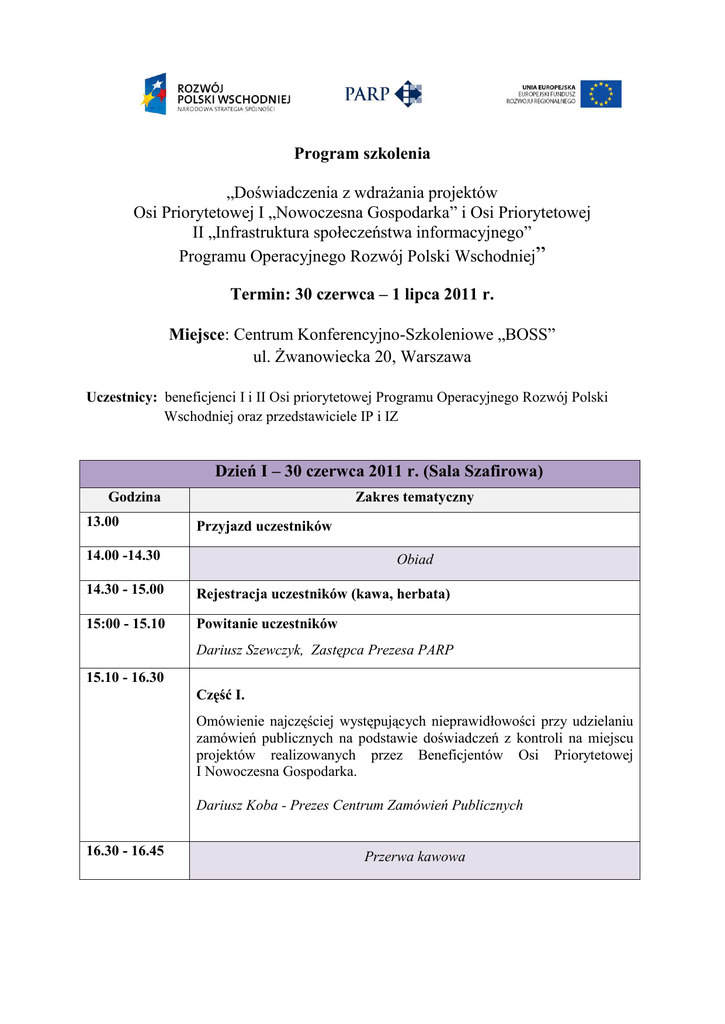 Program szkolenia „Doświadczenia z wdrażania projektów Osi Priorytetowej I „Nowoczesna Gospodarka” i Osi Priorytetowej II „Infrastruktura społeczeństwa informacyjnego” Programu Operacyjnego Rozwój Polski Wschodniej” Termin: 30 czerwca – 1 lipca 2011 r. Miejsce: Centrum Konferencyjno-Szkoleniowe „BOSS” ul. Żwanowiecka 20, Warszawa Uczestnicy: beneficjenci I i II Osi priorytetowej Programu Operacyjnego Rozwój Polski Wschodniej oraz przedstawiciele IP i IZ Dzień I – 30 czerwca 2011 r. (Sala Szafirowa) Godzina 13.00 Zakres tematyczny Przyjazd uczestników 14.00 -14.30 Obiad 14.30 - 15.00 Rejestracja uczestników (kawa, herbata) 15:00 - 15.10 Powitanie uczestników Dariusz Szewczyk, Zastępca Prezesa PARP 15.10 - 16.30 Część I. Omówienie najczęściej występujących nieprawidłowości przy udzielaniu zamówień publicznych na podstawie doświadczeń z kontroli na miejscu projektów realizowanych przez Beneficjentów Osi Priorytetowej I Nowoczesna Gospodarka. Dariusz Koba - Prezes Centrum Zamówień Publicznych 16.30 - 16.45 Przerwa kawowa 16.15 – 17.45 Część II. Omówienie najczęściej występujących nieprawidłowości przy udzielaniu zamówień publicznych na podstawie doświadczeń z kontroli na miejscu projektów realizowanych przez Beneficjentów Osi Priorytetowej I Nowoczesna Gospodarka. Dariusz Koba - Prezes Centrum Zamówień Publicznych 17.45 - 18.00 Podsumowanie – zakończenie szkolenia Dariusz Szymańczak, Dyrektor Departamentu Infrastruktury Nowoczesnej Gospodarki, 19.00 Uroczysta kolacja – Restauracja „Stary Młyn” Dzień II – 1 lipca 2011 r. Godzina Zakres tematyczny 8.00-10.00 Śniadanie 10.30 – 11.00 11.00 – 12.30 Sesja warsztatowa Sesja warsztatowa Sesja warsztatowa Sesja warsztatowa dla działania I.1 PO RPW dla działania I.3 PO RPW dla działania I.4 PO RPW dla działania II.1 PO RPW (Sala Kryształowa) (Sala Szafirowa) (Sala Turkusowa) (Sala Perłowa) Kontroler też człowiek – zasady dokonywania kontroli na miejscu projektów realizowanych w ramach PO RPW – część I Wykluczenie cyfrowe mieszkańców województw Polski Wschodniej – diagnoza obecnej sytuacji. Wskaźniki produktu i rezultatu – wartości i dokumentowanie. Zagadnienia teoretyczne: 1. Źródło i rodzaje wskaźników. 2. Raport ewaluacyjny. 3. Aktualizacja. Prowadzący: Piotr Szerszeń – PARP Rozliczanie projektu prowadzone przez IP PO RPW a sankcje wynikające z przepisów o finansach publicznych. Problematyka: Omówienie trybu i terminów dokonywania przez Beneficjentów rozliczeń wydatków ponoszonych w ramach projektów w kontekście regulacji ustawy o finansach publicznych i przepisów wykonawczych oraz postanowień umowy o dofinansowanie, ze szczególnym uwzględnieniem skutków niewłaściwego wykonania obowiązków. Prowadzący: Arkadiusz Dewódzki – PARP 1. Zagadnienia teoretyczne: 1. Wiadomości ogólne – kto, kiedy i jak może skontrolować realizację projektu 2. Obowiązki beneficjenta wynikające z umowy o dofinansowanie projektu, które podlegają kontroli. 3. Przedstawienie i omówienie zakresu oraz przebiegu kontroli. Prowadzący: Grażyna Dąbrowa - PARP Renata Michalczyk – PARP Prowadzący: Paweł Zakrzewski - PARP Program Polska Cyfrowa Równych Szans – inicjatywa na rzecz alfabetyzacji cyfrowej dorosłych Polek i Polaków. Prowadzący: Krzysztof Głomb – Prezes Stowarzyszenia „Miasta w Internecie” Wsparcie merytoryczne podczas sesji – przedstawiciele Wydziału Informacji, Promocji i Szkoleń, Departament Programów Ponadregionalnych Ministerstwo Rozwoju Regionalnego 12.30-12.45 12.45 – 14.00 Przerwa kawowa Nieprawidłowości i ich konsekwencje. Zagadnienia teoretyczne: 1. Pojęcie nieprawidłowości. 2. Konsekwencje związane z odzyskiwaniem należności. 3. Inne konsekwencje. 4. Informowanie o nieprawidłowościach. Prowadzący: Marek Szwed-Lipiński – PARP 14.00 Procedura zamykania projektu – jak skutecznie i szybko otrzymać płatność końcową dla przedsięwzięcia. Zagadnienia praktyczne – omówienie raportu z kontroli a także procesu przygotowania i przeprowadzania kontroli na miejscu realizacji projektu. Problematyka: Omówienie procesu zamykania projektu i czynności podejmowanych przez IP PO RPW oraz Beneficjenta po złożeniu wniosku o płatność końcową, ze szczególnym uwzględnieniem zakresu prowadzonej kontroli na zakończenie realizacji projektu oraz postępowania pokontrolnego, od którego zakończenia zależy przekazanie płatności końcowej i zamknięcie operacji. Prowadzący: Grażyna Dąbrowa - PARP Renata Michalczyk – PARP Zasady prawidłowego przygotowywania wniosków o płatność w ramach projektu SSPW – teoria i praktyka. Prowadzący: Paweł Zakrzewski - PARP Dorota Kocyk – PARP Wsparcie merytoryczne podczas sesji – przedstawiciele Wydziału Informacji, Promocji i Szkoleń, Departament Programów Ponadregionalnych Ministerstwo Rozwoju Regionalnego Prowadzący: Arkadiusz Dewódzki – PARP Podsumowanie szkolenia 14.30 – 15.30 Obiad 15.30 – 16.00 Zbiórka i wyjazd uczestników Spotkanie jest współfinansowane przez Unię Europejską w ramach Programu Operacyjnego Rozwój Polski Wschodniej 2007-2011