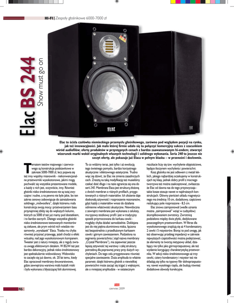 Show must go on Elac BS 244 HI-FI Zespoły głośnikowe 6000-7000 zł Elac to ścisła czołówka niemieckiego przemysłu głośnikowego, zarówno pod względem pozycji na rynku, jak też innowacyjności. Jak mało której firmie udało się tu połączyć komercyjny sukces z szacunkiem wśród audiofilów; ofertę produktów w przystępnych cenach z bardzo zaawansowanym hi-endem; stworzyć wizerunek marki wokół oryginalnych własnych technologii i solidnego wykonania. Seria 240 to jeszcze nie szczyt oferty, ale pokazuje już Elaca w pełnym blasku – w przenośni i dosłownie. T ematem testów majowego i czerwcowego są konstrukcje podstawkowe w zakresie 5000-7000 zł, lecz pojawia się też inny wspólny mianownik - niekonwencjonalne przetworniki wysokotonowe, jakimi mogą pochwalić się wszystkie prezentowane modele, a każdy z nich jest, oczywiście, inny. Również głośniki nisko-średniotonowe nie są tutaj zwyczajne i nudne, a na pewno nie byle jakie, bo ten zakres cenowy zobowiązuje do zainstalowania solidnego „midwoofera”, dzięki któremu mała konstrukcja swoją mocą i przetwarzaniem basu przynajmniej zbliży się do większych kolumn, których za 5000 zł też już mamy pod dostatkiem, i to bardzo zacnych. Dlatego wszystkie głośniki nisko-średniotonowe testowanych monitorów są ciekawe, ale prym wśród nich wiedzie niesamowity „wynalazek” Elaca. Trzeba mu chyba również przyznać przewagę, jeżeli chodzi o efekt wizualny, nad jego wysokotonowym kompanem. Tweeter jest z natury mniejszy, ale z reguły zwraca uwagę efektownym detalem. W BS244 też jest bardzo dekoracyjny, jednak nisko-średniotonowy jest spektakularnie widowiskowy. Widowisko to zaczęło się już dawno, ok. 20 lat temu, kiedy Elac opracował membrany dwuwarstwowe, gdzie zewnętrzna warstwa miała kształt miski i była wykonana z błyszczącej folii aluminiowej. 46 To co widzimy teraz, jest tylko i aż ewolucją tego świetnego pomysłu, bardzo korzystnego akustycznie i efektownego estetycznie. Trudno więc się dziwić, że Elac nie zmienia zasadniczych cech. Zresztą na taką modyfikację też musieliśmy czekać dość długo i na razie ogranicza się ona do serii 240. Membrana Elaca jest strukturą złożoną z dwóch membran o różnych profilach, przygotowanych z różnych materiałów. Ich złożenie daje doskonałą sztywność i rozproszenie rezonansów, gdyż każdy z materiałów wnosi do działania odmienne właściwości akustyczne. Niewidoczna z zewnątrz membrana jest wykonana z celulozy, ma typowy stożkowy profil i jest w tradycyjny sposób przymocowana do karkasu cewki mogłaby chyba działać samodzielnie. Doklejana jest do niej piękna aluminiowa miska, łączona też bezpośrednio z przedłużonym karkasem cewki i górnym zawieszeniem. Podzielona na segmenty powierzchnia ( stąd nazwa membrany „Crystal Membrane”), ma zapewniać jeszcze lepszą sztywność tej warstwy i całej struktury, potrzebną dla poprawnej pracy przy dużych wychyleniach. Do tego celu przygotowano również specjalne zawieszenie. Duża amplituda to właśnie parametr, dzięki któremu głośnik o niewielkiej powierzchni może zacząć się ścigać z większymi, ale o mniejszej amplitudzie - w ostatecznym czerwiec 2009 rezultacie liczy się tzw. wychylenie objętościowe, będące iloczynem wychylenia i powierzchni. Kosz głośnika nie jest odlewem z metali lekkich, jakiego najbardziej oczekujemy w konstrukcjach tej klasy, jednak dobry profil z mocnego tworzywa też można zaakceptować, zwłaszcza że Elac od dawna nas do tego przyzwyczaja takie kosze stosuje nawet w najdroższych konstrukcjach. Główny pierścień układu magnetycznego ma średnicę 10 cm, dodatkowy, częściowo redukujący pole rozproszone - 8,5 cm. Elac znowu zaimponował (wedle uznania można „zaimponował” wziąć w cudzysłów) skomplikowaniem zwrotnicy. Zwrotnicę podzielono między dwie płytki, dedykowane poszczególnym przetwornikom. W filtrze dla wysokotonowego znajdują się aż 4 kondensatory, 2 cewki i 5 rezystorów. Biorąc to pod uwagę, jak też obserwując przebieg impedancji w zakresie najwyższych częstotliwości można podejrzewać, że elementy te tworzą nietypowy układ, działający nie tylko jako górnoprzepustowy, ale też wydatnie korygujący charakterystykę przetwornika. W sekcji nisko-średniotonowego aż trzy cewki, cztery kondensatory i rezystor też nie składają się tylko na typowy filtr dolnoprzepustowy, nawet wysokiego rzędu, ale budują również dodatkowe obwody korekcyjne. ODSŁUCH Różnica pomiędzy BS244 a testowanym niegdyś BS234 odbierana jest (co najmniej przeze mnie) nieco inaczej niż dla analogicznych par „mniejszych – większych” w przypadku Dali i KEF-a. Tam mniejsze modele miały dość wyraźnie wyeksponowane wysokie tony. To zresztą nie stwarzało żadnych problemów w przyjemnym ich odbiorze, bo zakresy te były w ich wydaniu opracowane bardzo pięknie i mogły się tym dość głośno chwalić; większe monitory tych firm przynoszą jednak lepsze ogólne proporcje na skutek mocniejszego wypełnienia niskich rejestrów - nie tylko basu, ale i „niższego środka”. Natomiast mały BS243 wcale nie popisywał się górą pasma, nie robi tego też BS244, co skądinąd może być trochę zaskakujące - Elaki mają przecież bardzo ciekawy, wysokiej klasy głośnik wysokotonowy, który powinien być źródłem bardzo wyrafinowanego brzmienia w tej części pasma. I jest, tyle że konstruktor oparł się pokusie robienia z tego głównego punktu programu. Nie zamierzał przykuwać uwagi do tego zakresu, najwyraźniej najważniejsza jest dla niego dobra równowaga tonalna, w ramach której wysokie tony pod żadnym pozorem nie mogą być podkreślone. W dodatku brzmienie wysokotonowego JET-a jest samo w sobie subtelne, mimo aluminiowej membrany nie ma w nim metaliczności i ostrości, nie ma też charakterystycznej dla wielu głośników wstęgowych (do któr