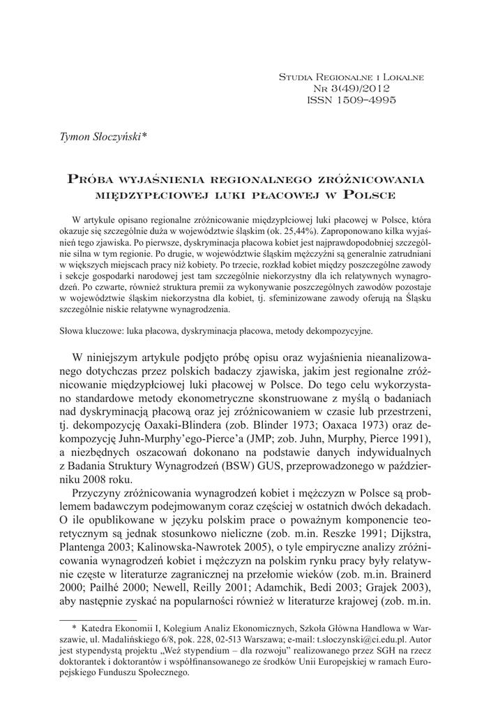 Studia Regionalne i Lokalne Nr 3(49)/2012 ISSN 1509–4995 Tymon Słoczyński* Próba wyjaśnienia regionalnego zróżnicowania międzypłciowej luki płacowej w Polsce W artykule opisano regionalne zróżnicowanie międzypłciowej luki płacowej w Polsce, która okazuje się szczególnie duża w województwie śląskim (ok. 25,44%). Zaproponowano kilka wyjaś nień tego zjawiska. Po pierwsze, dyskryminacja płacowa kobiet jest najprawdopodobniej szczególnie silna w tym regionie. Po drugie, w województwie śląskim mężczyźni są generalnie zatrudniani w większych miejscach pracy niż kobiety. Po trzecie, rozkład kobiet między poszczególne zawody i sekcje gospodarki narodowej jest tam szczególnie niekorzystny dla ich relatywnych wynagrodzeń. Po czwarte, również struktura premii za wykonywanie poszczególnych zawodów pozostaje w województwie śląskim niekorzystna dla kobiet, tj. sfeminizowane zawody oferują na Śląsku szczególnie niskie relatywne wynagrodzenia. Słowa kluczowe: luka płacowa, dyskryminacja płacowa, metody dekompozycyjne. W niniejszym artykule podjęto próbę opisu oraz wyjaśnienia nieanalizowanego dotychczas przez polskich badaczy zjawiska, jakim jest regionalne zróżnicowanie międzypłciowej luki płacowej w Polsce. Do tego celu wykorzystano standardowe metody ekonometryczne skonstruowane z myślą o badaniach nad dyskryminacją płacową oraz jej zróżnicowaniem w czasie lub przestrzeni, tj. dekompozycję Oaxaki-Blindera (zob. Blinder 1973; Oaxaca 1973) oraz dekompozycję Juhn-Murphy’ego-Pierce’a (JMP; zob. Juhn, Murphy, Pierce 1991), a niezbędnych oszacowań dokonano na podstawie danych indywidualnych z Badania Struktury Wynagrodzeń (BSW) GUS, przeprowadzonego w październiku 2008 roku. Przyczyny zróżnicowania wynagrodzeń kobiet i mężczyzn w Polsce są prob lemem badawczym podejmowanym coraz częściej w ostatnich dwóch dekadach. O ile opublikowane w języku polskim prace o poważnym komponencie teoretycznym są jednak stosunkowo nieliczne (zob. m.in. Reszke 1991; Dijkstra, Plantenga 2003; Kalinowska-Nawrotek 2005), o tyle empiryczne analizy zróżnicowania wynagrodzeń kobiet i mężczyzn na polskim rynku pracy były relatywnie częste w literaturze zagranicznej na przełomie wieków (zob. m.in. Brainerd 2000; Pailhé 2000; Newell, Reilly 2001; Adamchik, Bedi 2003; Grajek 2003), aby następnie zyskać na popularności również w literaturze krajowej (zob. m.in. * Katedra Ekonomii I, Kolegium Analiz Ekonomicznych, Szkoła Główna Handlowa w Warszawie, ul. Madalińskiego 6/8, pok. 228, 02-513 Warszawa; e-mail: [email protected]. Autor jest stypendystą projektu „Weź stypendium – dla rozwoju” realizowanego przez SGH na rzecz doktorantek i doktorantów i współfinansowanego ze środków Unii Europejskiej w ramach Europejskiego Funduszu Społecznego. 66 Tymon Słoczyński Kot, Podolec, Ulman 1999; Kalinowska-Nawrotek 2005; Łatuszyński, Woźny 2008; Magda, Szydłowski 2008; Matysiak, Słoczyński, Baranowska 2010; Rokicka, Ruzik 2010). Niemniej spośród wymienionych wyżej prac opublikowanych w Polsce wyłącznie badania Magdy i Szydłowskiego (2008), Matysiak, Słoczyńskiego i Baranowskiej (2010) oraz Rokickiej i Ruzik (2010) wykorzystywały standardowe dla tej literatury metody dekompozycyjne oraz zostały oparte na danych indywidualnych z podstawowych badań społecznych w Polsce. W żadnej z cytowanych prac nie podjęto ponadto próby opisu lub wyjaśnienia regionalnego zróżnicowania międzypłciowej luki płacowej w Polsce. W kolejnych częściach niniejszego artykułu wykorzystano najpierw dekompozycję Oaxaki-Blindera do zbadania przyczyn zróżnicowania przeciętnych wynagrodzeń miesięcznych kobiet i mężczyzn w 2008 r. (zarówno na szczeblu ogólnokrajowym, jak i w każdym z 16 województw). Stwierdziwszy, że największa międzypłciowa luka płacowa charakteryzowała w 2008 r. rynek pracy w województwie śląskim (ok. 25,44%), posłużono się następnie dekompozycją JMP do zbadania przyczyn zróżnicowania międzypłciowej luki płacowej w tym regionie oraz w każdym z pozostałych 15 województw. Zróżnicowanie przeciętnych wynagrodzeń kobiet i mężczyzn w Polsce w 2008 r. Dekompozycja Oaxaki-Blindera Gdy celem naszego badania jest stwierdzenie przyczyn zróżnicowania przeciętnych wynagrodzeń kobiet i mężczyzn, to dogodnym punktem wyjścia do takiej analizy może być zdefiniowanie międzypłciowej luki płacowej (gender wage gap) jako procentowej różnicy między przeciętnymi wynagrodzeniami obu płci. Jeśli Yi oznacza logarytm naturalny wynagrodzenia otrzymywanego przez jednostkę i (i = 1, …, N) oraz Mi jest zmienną zero-jedynkową przyjmującą wartość 1, gdy i jest mężczyzną, oraz wartość 0, gdy i jest kobietą, to ze wzoru Taylora oraz własności funkcji logarytmicznej wynika, że wyrażenie E[Yi | Mi = 1] – E[Yi | Mi = 0] jest w przybliżeniu równe międzypłciowej luce płacowej1. Dekompozycja Oaxaki-Blindera (zob. Blinder 1973; Oaxaca 1973) jest pionierską metodą ekonometryczną, która pozwala zapisać tak rozumianą międzypłciową lukę płacową jako sumę dwóch składników, tzw. składnika wyjaśnionego, określającego stopień, w jakim międzypłciowa luka płacowa wynika z faktu zróżnicowania przeciętnych wartości poszczególnych determinant wysokości wynagrodzenia w populacji kobiet i mężczyzn (tj. z faktu, że kobiety i mężczyźni są, przeciętnie rzecz biorąc, „różni”), oraz tzw. składnika niewyja Takie przybliżenie będzie, oczywiście, tym gorsze, im większa jest międzypłciowa luka płacowa. Mając na celu jasność wywodu, w artykule opisano jednak uzyskane wyniki w taki sposób, jakby międzypłciowa luka płacowa faktycznie była mierzona w procentach, a jej składniki – w punktach procentowych. Wprawdzie stosowanie takiego uproszczenia nie powinno mieć większego wpływu na interpretację uzyskanych wyników, lecz należy je