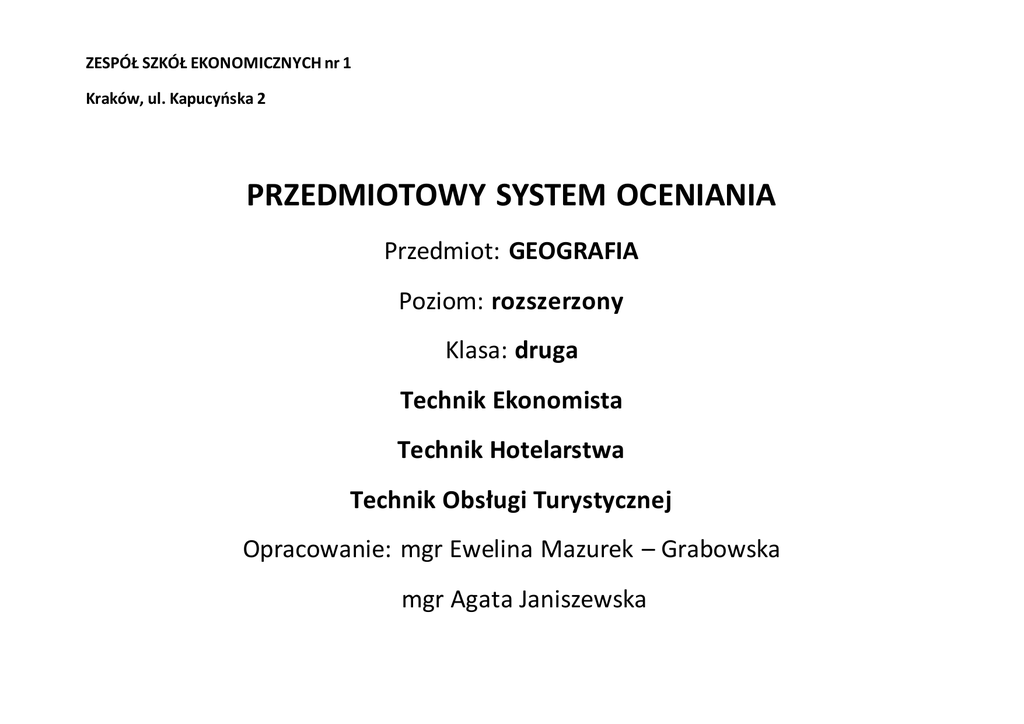 ZESPÓŁ SZKÓŁ EKONOMICZNYCH nr 1 Kraków, ul. Kapucyńska 2 PRZEDMIOTOWY SYSTEM OCENIANIA Przedmiot: GEOGRAFIA Poziom: rozszerzony Klasa: druga Technik Ekonomista Technik Hotelarstwa Technik Obsługi Turystycznej Opracowanie: mgr Ewelina Mazurek – Grabowska mgr Agata Janiszewska I. Podstawy prawne 1. Rozporządzenie Ministra Edukacji Narodowej w sprawie warunków i sposobu oceniania, klasyfikowania i promowania uczniów i słuchaczy oraz przeprowadzania sprawdzianów i egzaminów w szkołach publicznych z dnia 30 kwietnia 2007 r. Dziennik Ustaw z 2007 r. Nr 83 poz. 562 z dnia 11 maja 2007 r. z późniejszymi zmianami. 2. Statut Zespół Szkół Ekonomicznych nr 1 w Krakowie 3. Wewnątrzszkolny System Oceniania II. Ocenianiu podlega 1. Znajomość i rozumienie treści programowych. 2. Opisywanie zjawisk, procesów i zależności zachodzących w środowisku geograficznym z użyciem terminologii stosowanej w naukach geograficznych. 3. Umiejętność czytania i interpretacji map występujących w różnych pomocach naukowych (atlasach, podręcznikach, czasopismach itp.). 4. Celowe wykorzystywanie roczników statystycznych, zestawień tabelarycznych i graficznych, rysunków, przekrojów, fotografii, które mają posłużyć do prawidłowego oceniania, wnioskowania i prognozowania zmian zachodzących w środowisku. 5. Umiejętność dokonywania obserwacji, pomiarów i obliczeń (środowisko, mapa, rocznik statystyczny). 6. Celowe korzystanie z różnych nowych źródeł wiedzy. 7. Znajomość obiektów i atrakcji turystycznych i umiejętność ich lokalizacji. III. Zasady ogólne 1. Oceny wystawione przez nauczyciela są jawne dla ucznia, jego rodziców lub prawnych opiekunów. 2. Ilość ocen bieżących w danym okresie nie powinna być mniejsza niż 3. 3. Uczeń może zgłosić nieprzygotowanie do lekcji 1 raz w semestrze. Nie dotyczy to zapowiedzianych prac klasowych, sprawdzianów i kartkówek. Nieprzygotowanie obejmuje: odpowiedź ustną, niezapowiedzianą kartkówkę, brak zadania domowego, brak zeszytu, brak materiałów ćwiczeniowych, brak podręcznika. 4. Uczeń ma obowiązek prowadzenia zeszytu przedmiotowego. 5. Brak lub odpisywanie zadań domowych, korzystanie z niedozwolonych źródeł w czasie prac pisemnych, oddawanie do oceny prac nienapisanych samodzielnie, plagiatów z Internetu równa się ocenie niedostatecznej. 6. Prace pisemne napisane nieczytelnie lub rażąco nieestetyczne nie podlegają ocenianiu, jeśli uczeń nie ma orzeczenia poradni o dysfunkcjach. 7. Uczeń, który opuścił więcej niż 50% zajęć w semestrze może być nieklasyfikowany. 8. Prace klasowe i sprawdziany są obowiązkowe. Jeśli uczeń opuścił pracę klasową lub sprawdzian z przyczyn losowych (dłuższa nieobecność w szkole), powinien napisać go w terminie uzgodnionym z nauczycielem. 9. Prace klasowe i sprawdziany są zapowiedziane, co najmniej tydzień wcześniej i zapisane w dzienniku lekcyjnym. 10. Uczeń ma prawo do poprawy oceny w formie i terminie uzgodnionym z nauczycielem. 11. Uczeń, który otrzymał ocenę niedostateczną za nieuczciwe zachowanie na sprawdzianie (odpisywanie, rozmawianie, posiadanie „ściągi” itp.) traci prawo do jej poprawiania. 12. Poprawa ocen niedostatecznych (dopuszczających) może odbywać się po lekcjach. 13. Odpowiedzi pisemne (kartkówki) dotyczą trzech ostatnich tematów (nie lekcji) i nie muszą być zapowiadane przez nauczyciela. Sprawdzają przygotowanie uczniów do lekcji bieżącej. 14. Termin podania wyników kartkówki, sprawdzianu nie powinien przekraczać dwóch tygodni od czasu jego przeprowadzenia (może być przedłużony z powodu nieobecności nauczyciela lub klasy w szkole, ewentualnie przesunięty na termin uzgodniony z klasą). 15. Prace pisemne po ocenieniu nauczyciel udostępnia do wglądu, omawia błędy a następnie przechowuje je do końca roku szkolnego i udostępnia w razie potrzeby rodzicom lub opiekunom prawnym ucznia. 16. Szczegółowe zasady oceniania ustala każdy nauczyciel indywidualnie i zapoznaje z nimi uczniów na zajęciach organizacyjnych. V. Formy sprawdzania wiadomości i umiejętności: - testy - sprawdziany - odpowiedzi ustne - odpowiedzi pisemne (kartkówki) - zadania domowe - ćwiczenia praktyczne sprawdzające wybrane umiejętności i wiedzę - aktywność na zajęciach terenowych - praca samodzielna (referaty, sprawozdania z wykładów, plakaty, plansze, rysunki, prezentacje multimedialne itp.) - udział w konkursach geograficznych i olimpiadach - znajomość mapy fizycznej świata i Polski - znajomość mapy polityczno - administracyjnej świata i Polski VI. Kryteria ocen cząstkowych - sprawdziany i kartkówki są oceniane według skali procentowej: Nauczyciel ocenia prace pisemne wg następującej skali, w zależności od stopnia spełnienia wymagań edukacyjnych: celujący 100 % + bardzo dobry 97 - 99 % bardzo dobry 87 – 96 % + dobry 84 – 86 % dobry 74 – 83 % + dostateczny 71 – 73 % dostateczny 60 – 70 % + dopuszczający 57 – 59 % Poziom wymagań Nr lekcji dopuszczający Temat Lekcji dostateczny dobry I. 1. Lekcja organizacyjna 2. Geografia jako na uka 3. bardzo dobry celujący OBRAZ ZIEMI Uczeń poprawnie: Uczeń poprawnie: poda je przykłady pra ktycznego oma wia rolę systemu i nformacji za s tosowania wiedzy geogra ficznej (GIS) geogra ficznej w groma dzeniu, przetwarzaniu i a nalizowaniu danych ocenia wiarygodność i przyda tność źródeł wiedzy geogra ficznej Uczeń poprawnie: Uczeń poprawnie: Uczeń poprawnie: wyja ś nia znaczenie terminów: geografia, środowisko geograficzne, epigeosfera wymi enia cele badań geogra ficznych wymi enia źródła i nformacji geogra ficznej określa przedmiot badań geogra fii oraz i nnych nauk o Zi emi kl a syfikuje nauki geograficzne wymi enia s fery Zi emi oraz określa i ch wzajemne oddziaływanie wymi enia i klasyfikuje poś rednie i bezpośrednie źródła i nformacji geograficznej wyka zuje i nterdys cyplinarny cha ra kter nauk geog