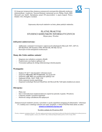 S3 Group jest światowej klasy dostawcą systemowych rozwiązań dla elektroniki uŜytkowej, telekomunikacji i medycyny. Naszymi klientami i partnerami są m.in. Philips, Oracle, IBM, Microsoft oraz Intel®. Zatrudniamy ponad 250 pracowników w pięciu krajach: Polsce, Irlandii, USA, Portugalii, Czechach. Zapraszamy aktywnych studentów na letnie, płatne praktyki studenckie. PŁATNE PRAKTYKI STUDENCI KIERUNKÓW INFORMATYCZNYCH Miejsce pracy: Wrocław Jeśli jesteś zainteresowany: - Aplikacjami, systemami tworzonymi w najnowszych technologiach (Microsoft .NET, ASP 2.0, MS SharePoint, MS Dynamics CRM, MS BizTalk, MS SQL Server) Rozwojem swoich umiejętności technicznych Mamy dla Ciebie ambitne zadania! - Integracja oraz rozbudowa systemów eHealth Projektowanie oraz budowa aplikacji web Tworzeniem aplikacji do obsługi elektronicznego rekordu pacjenta Wymagania: - Studenci IV lub V roku kierunków informatycznych Znajomość Microsoft .NET Framework, oraz języka C# Znajomość ASP .NET oraz projektowania aplikacji web Znajomość HTML, XSLT, XML, CSS Dobra znajomość języka angielskiego Znajomość technologii Microsoft SharePoint, lub Microsoft Biz Talk będzie dodatkowym atutem Oferujemy: - Płatny staŜ StaŜ w doświadczonym międzynarodowym zespole bez potrzeby wyjazdu z Wrocławia Codzienny kontakt z językiem angielskim MoŜliwość stałego zatrudnienia dla najlepszych Zainteresowanych studentów prosimy o przesłanie w języku angielskim następujących dokumentów / informacji: CV, średniej ocen z ostatniego semestru oraz opisu projektów, w których Pan/Pani brała udział, na adres: [email protected] Na oferty czekamy do 30 czerwca 2010. Prosimy o dopisanie następującej klauzuli: „WyraŜam zgodę na przetwarzanie moich danych osobowych dla potrzeb niezbędnych do realizacji procesu rekrutacji (zgodnie z ustawą z dn. 29.08.97 roku o Ochronie Danych Osobowych Dz. Ust Nr 133 poz. 883)”.