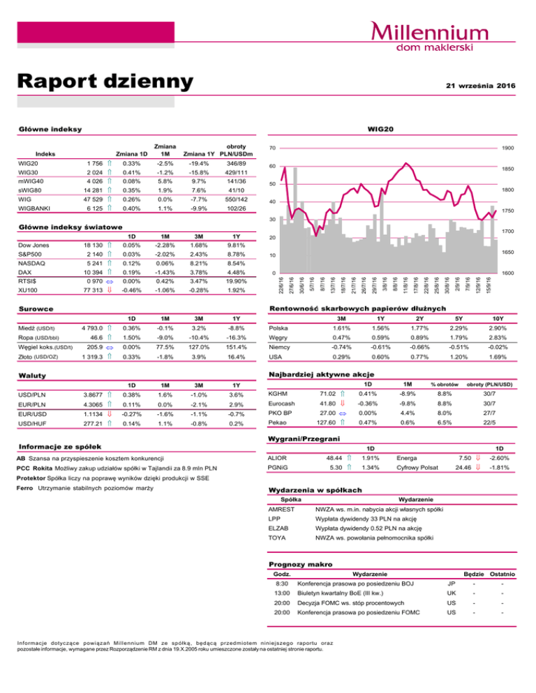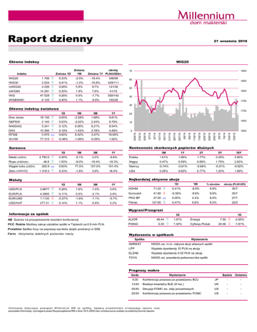 Raport dzienny 21 września 2016 Gł•wne indeksy WIG20 Indeks Zmiana 1D Zmiana 1M obroty Zmiana 1Y PLN/USDm WIG20 1 756 0.33% -2.5% -19.4% 346/89 WIG30 0.41% -1.2% -15.8% 429/111 mWIG40 2 024 4 026 0.08% 5.8% 9.7% 141/36 sWIG80 14 281 0.35% 1.9% 7.6% 41/10 WIG 47 529 0.26% 0.0% -7.7% 550/142 6 125 0.40% 1.1% -9.9% 102/26 WIGBANKI 70 1900 60 1850 50 1800 40 1750 30 Gł•wne indeksy światowe 20 18 130 0.05% -2.28% 1.68% 9.81% S&P500 2 140 0.03% -2.02% 2.43% 8.78% NASDAQ 5 241 0.12% 0.06% 8.21% 8.54% DAX 10 394 0.19% -1.43% 3.78% 4.48% RTSI$ 0 970 77 313 0.00% 0.42% 3.47% 19.90% -0.46% -1.06% -0.28% 1.92% 1D 1M 3M 1Y 4 793.0 0.36% -0.1% 3.2% -8.8% Polska Ropa (USD/bbl) Węgiel koks.(USD/t) Złoto (USD/OZ) 15/9/16 7/9/16 12/9/16 2/9/16 30/8/16 25/8/16 22/8/16 17/8/16 8/8/16 11/8/16 3/8/16 29/7/16 26/7/16 21/7/16 18/7/16 8/7/16 1600 Rentowność skarbowych papier•w dłużnych Surowce Miedź (USD/t) 0 13/7/16 XU100 1650 10 5/7/16 1Y 30/6/16 3M 27/6/16 1M 22/6/16 Dow Jones 1700 1D 3M 1Y 2Y 5Y 10Y 1.61% 1.56% 1.77% 2.29% 2.90% 46.6 1.50% -9.0% -10.4% -16.3% Węgry 0.47% 0.59% 0.89% 1.79% 2.83% 205.9 0.00% 77.5% 127.0% 151.4% Niemcy -0.74% -0.61% -0.66% -0.51% -0.02% 1 319.3 0.33% -1.8% 3.9% 16.4% USA 0.29% 0.60% 0.77% 1.20% 1.69% 1D 1M 3M 1Y Najbardziej aktywne akcje Waluty 1D 1M % obrot€w obroty (PLN/USD) USD/PLN 3.8677 0.38% 1.6% -1.0% 3.6% KGHM 71.02 0.41% -8.9% 8.8% 30/7 EUR/PLN 4.3065 0.11% 0.0% -2.1% 2.9% Eurocash 41.80 -0.36% -9.8% 8.8% 30/7 EUR/USD 1.1134 -0.27% -1.6% -1.1% -0.7% PKO BP 27.00 0.00% 4.4% 8.0% 27/7 USD/HUF 277.21 0.14% 1.1% -0.8% 0.2% Pekao 127.60 0.47% 0.6% 6.5% 22/5 Wygrani/Przegrani Informacje ze sp•łek 1D 1D AB Szansa na przyspieszenie kosztem konkurencji ALIOR 48.44 1.91% Energa PCC Rokita Możliwy zakup udział‚w sp‚łki w Tajlandii za 8.9 mln PLN PGNiG 5.30 1.34% Cyfrowy Polsat 7.50 -2.60% 24.46 -1.81% Protektor Sp‚łka liczy na poprawę wynik‚w dzięki produkcji w SSE Ferro Utrzymanie stabilnych poziom‚w marży Wydarzenia w sp•łkach Sp€łka Wydarzenie AMREST NWZA ws. m.in. nabycia akcji własnych sp‚łki LPP Wypłata dywidendy 33 PLN na akcję ELZAB Wypłata dywidendy 0.52 PLN na akcję TOYA NWZA ws. powołania pełnomocnika sp‚łki Prognozy makro Godz. Wydarzenie Będzie Ostatnio 8:30 Konferencja prasowa po posiedzeniu BOJ JP - - 13:00 Biuletyn kwartalny BoE (III kw.) UK - - 20:00 Decyzja FOMC ws. st‚p procentowych US - - 20:00 Konferencja prasowa po posiedzeniu FOMC US - - Informacje dotyczące powiązań Millennium DM ze sp‚łką, będącą przedmiotem niniejszego raportu oraz pozostałe informacje, wymagane przez Rozporządzenie RM z dnia 19.X.2005 roku umieszczone zostały na ostatniej stronie raportu. Informacje ze sp•łek AB Szansa na przyspieszenie kosztem konkurencji Zarząd AB jeszcze nie wie, czy chce podzielić się z akcjonariuszami częścią wypracowanego zysku. Argumentem za pozostawieniem zysku w sp‚łce przemawia zapotrzebowanie na kapitał obrotowy i bezpieczeństwo finansowe. Zarząd uważa, że spośr‚d gł‚wnych graczy na rynku ma najsilniejszą pozycję finansową, dzięki czemu w najbliższym czasie sp‚łka AB będzie mogła rosnąć kosztem konkurencji. Zarząd widzi, że banki i ubezpieczyciele zmieniły nastawienie do sektora na bardziej negatywne i w najbliższym czasie na rynku będzie wygrywać ten kto ma najlepszy dostęp do got‚wki. Na rynku AGD część klient‚w przechodzi do nich od innych dystrybutor‚w, co generuje zapotrzebowanie na kapitał obrotowy. PCC Rokita Możliwy zakup udział€w sp€łki w Tajlandii za 8.9 mln PLN PCC Rokita może kupić część udział‚w w sp‚łce IRPC Polyol z Tajlandii, produkującej systemy poliuretanowe i poliole, za ok. 8.9 mln PLN. Zarząd PCC Rokita po analizie potencjału IRPC Polyol ocenił, że "tego typu inwestycja byłaby zasadna". Wymagana jest jeszcze zgoda rady nadzorczej. Protektor Sp€łka liczy na poprawę wynik€w dzięki produkcji w SSE Sp‚łka liczy, że nowa siedziba z halą produkcyjną na terenie Specjalnej Strefy Ekonomicznej na Felinie (Lublin) przyczyni się do poprawy wynik‚w finansowych. W ramach kolejnego zezwolenia na działalność w SSE, sp‚łka zainwestuje co najmniej 6.8 mln PLN oraz zatrudni minimum 30 kolejnych os‚b. Obecnie planowane są dalsze inwestycje w nowoczesny park maszynowy. Ferro Utrzymanie stabilnych poziom€w marży Sp‚łka planuje utrzymanie stabilnego poziomu marży w kolejnych kwartałach, czego warunkiem jest m.in. stabilność kursu dolara, w kt‚rym rozliczane są zam‚wienia. Grupa skupia się na rozwoju sprzedaży w krajach regiony, m.in. na Węgrzech (gdzie buduje struktury od ub.r.) oraz w Bułgarii (obecność od bieżącego roku), jednak myśli o stopniowej ekspansji na kolejne rynki, rozważa m. in. kraje bałtyckie. Sp‚łka nie planuje emisji obligacji w najbliższym czasie i zakłada utrzymywanie długu netto na konserwatywnie bezpiecznym poziomie około 2x EBITDA. Pakiety Impel Trade Bridge Czechy A.S., sp‚łka związana z J‚zefem Biegajem, Członkiem Rady nadzorczej sprzedała w dniu 20 września 110,373 akcje sp‚łki po średniej cenie jednostkowej 21.25 PLN (łącznie za 2.35 mln PLN) Marvipol Książek Holding, wehikuł inwestycyjny prezesa Marvipolu, sprzedał 4.66% akcji sp‚łki (1,936,000 akcji po średniej cenie jednostkowej 8.50 PLN, tj. łącznie za 16.5 mln PLN), zmniejszając zaangażowanie do 66.01% kapitału Millennium Dom Maklerski S.A. ul. Żaryna 2A, 02-593 Warszawa Telefon: (022) 598 26 00 2 Millennium Dom Maklerski S.A. ul. Żaryna 2A, 02-593 Warszawa Telefon: (022) 598 26 00 40000 850 30000 800 20000 650 600 16/9/16 50000 7/9/16 1200 2/9/16 0 1000 29/8/16 10000 1400 24/8/16 60000 1050 19/8/16 70000 16/8/16 RTSI$ 11/8/16 3500 950 800 600 700 0 19/9/16 14/9/16 9/9/16 6/9/16 1/9/16 29/8/16 24/8/16 19/8/16 16/8/16 11/8/16 8/8/16 3/8/16 NASDAQ 8/8/16 0 29/7/16 200 3/8/16 4100 26/7/16 600 29/7/16 800 21/7/16 4700 26/7/16 1000 18/7/16 4900 13/7/