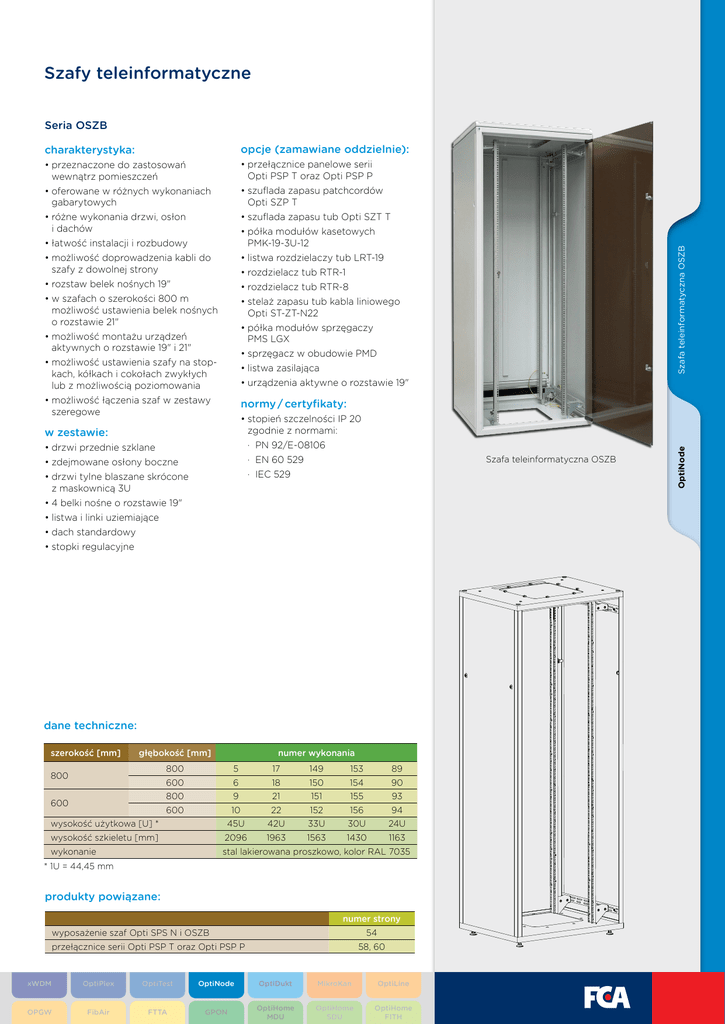 Szafy teleinformatyczne opcje (zamawiane oddzielnie): •przeznaczone do zastosowań wewnątrz pomieszczeń •oferowane w różnych wykonaniach gabarytowych •różne wykonania drzwi, osłon i dachów •łatwość instalacji i rozbudowy •możliwość doprowadzenia kabli do szafy z dowolnej strony •rozstaw belek nośnych 19" •w szafach o szerokości 800 m możliwość ustawienia belek nośnych o rozstawie 21" •możliwość montażu urządzeń aktywnych o rozstawie 19" i 21" •możliwość ustawienia szafy na stopkach, kółkach i cokołach zwykłych lub z możliwością poziomowania •przełącznice panelowe serii Opti PSP T oraz Opti PSP P •szuflada zapasu patchcordów Opti SZP T •szuflada zapasu tub Opti SZT T •półka modułów kasetowych PMK-19-3U-12 •listwa rozdzielaczy tub LRT-19 •rozdzielacz tub RTR-1 •rozdzielacz tub RTR-8 •stelaż zapasu tub kabla liniowego Opti ST-ZT-N22 •półka modułów sprzęgaczy PMS LGX •sprzęgacz w obudowie PMD •listwa zasilająca •urządzenia aktywne o rozstawie 19" •możliwość łączenia szaf w zestawy szeregowe normy / certyfikaty: •stopień szczelności IP 20 zgodnie z normami: ·· PN 92/E-08106 ·· EN 60 529 ·· IEC 529 w zestawie: •drzwi przednie szklane •zdejmowane osłony boczne •drzwi tylne blaszane skrócone z maskownicą 3U •4 belki nośne o rozstawie 19" •listwa i linki uziemiające •dach standardowy •stopki regulacyjne Szafa teleinformatyczna OSZB dane techniczne: szerokość [mm] głębokość [mm] 800 600 numer wykonania 800 5 17 149 153 89 600 6 18 150 154 90 800 9 21 151 155 93 600 10 22 152 156 94 wysokość użytkowa [U] * 45U 42U 33U 30U 24U wysokość szkieletu [mm] 2096 1963 1563 1430 1163 wykonanie stal lakierowana proszkowo, kolor RAL 7035 * 1U = 44,45 mm produkty powiązane: numer strony wyposażenie szaf Opti SPS N i OSZB 54 przełącznice serii Opti PSP T oraz Opti PSP P 58, 60 xWDM OptiPlex OptiTest OptiNode OptiDukt MikroKan OptiLine OPGW FibAir FTTA GPON OptiHome MDU OptiHome SDU OptiHome FITH OptiNode OptiNode charakterystyka: Szafa teleinformatyczna OSZB Seria OSZB
