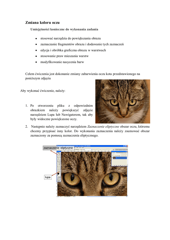 Zmiana koloru oczu Umiejętności konieczne do wykonania zadania stosować narzędzia do powiększania obrazu zaznaczanie fragmentów obrazu i dodawanie tych zaznaczeń edycja i obróbka graficzna obrazu w warstwach stosowanie praw mieszania warstw modyfikowanie nasycenia barw Celem ćwiczenia jest dokonanie zmiany zabarwienia oczu kota przedstawionego na poniższym zdjęciu Aby wykonać ćwiczenie, należy: 1. Po otworzeniu pliku z odpowiednim obrazkiem należy powiększyć zdjęcie narzędziem Lupa lub Nawigatorem, tak aby były widoczne powiększone oczy. 2. Następnie należy zaznaczyć narzędziem Zaznaczenie eliptyczne obszar oczu, któremu chcemy przypisać inny kolor. Do wykonania zaznaczenia należy zsumować obszar zaznaczony za pomocą zaznaczenia eliptycznego. 3. Kolejną operacją jest skopiowanie zaznaczonego obszaru i wklejenie go na nową warstwę. W tym celu wybieramy górne menu Edycja/Kopiuj i ponownie górne menu Edycja, następnie polecenie Wklej. Nasz obszar poprzednio zaznaczony został powielony i wklejony na nową warstwę. 4. Następnie należy wybrać górne menu Obrazek/Dopasuj/Barwa/Nasycenie. W oknie Barwa/ Nasycenie należy zaznaczyć pole koloru zaś suwaki przesunąć tak, aby uzyskać wybrany kolor. 5. Po dokonaniu zmiany koloru oczu, należy wywołać tryb mieszania warstw Kolor. 6. Tak zmodyfikowany rysunek należy zapisać w wybranej lokalizacji.