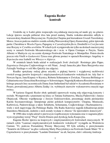 Eugenia Rezler kontralt Urodziła się w Łodzi gdzie rozpoczęła swą edukację muzyczną od nauki gry na gitarze. Lekcje śpiewu zaczęła pobierać dwa lata przed maturą. Studia wokalno-aktorskie odbyła w warszawskiej Akademii Muzycznej im. Fryderyka Chopina pod kierunkiem Urszuli TrawińskiejMoroz. Jeszcze podczas studiów została solistką Warszawskiej Opery Kameralnej, gdzie śpiewała partie: Cherubina w Weselu Figara, Papageny w Czarodziejskim flecie, Dorabellii w Cosi fan tutte oraz Rozyny w Cyruliku sewilskim. W rolach tych występowała nie tylko na deskach macierzystej sceny w ramach Festiwalu Mozartowskiego ale i m.in. w Opera Comique w Paryżu, Teatro Albeniz w Madrycie czy na scenie słynnego Festiwalu Teatralnego w Montpellier. Potem doszła jeszcze rola Vitelli w Łaskawości Tytusa oraz główne postaci w operach Rossiniego: Angeliny w Kopciuszku oraz Izabelli we Włoszce w Algierze. W ostatnich latach brała udział w realizacjach Sroki złodziejki Rosiniego jako Pippo, Eugeniusza Oniegina Czajkowskiego w roli Niani, Jenufy Janaczka jako Stara Buryjowka oraz Falstaffa Verdiego w roli Mrs Quickly (na zdjęciu). Rzadko spotykany rodzaj głosu artystki, o pięknej barwie i wyjątkowej ruchliwości zwrócił uwagę jurorów krajowych i międzynarodowych konkursów wokalnych im. Ady Sari w Nowym Sączu, Jana Kiepury w Krynicy, Roberta Schumanna w Zwickau, Vincenza Belliniego w Caltanisetta oraz Gioacchina Rossiniego w Schwetzingen. Nagrodą Konkursu Rossiniowskiego,w którego pracach Jury uczestniczyła Dama Joan Sutherland był udział w Accademia Rossiniana w Pesaro, prowadzonej przez Alberta Zeddę i in. wybitnych znawców wykonawstwa muzyki tego twórcy. W karierze Eugenii Rezler obok spektakli operowych ważną rolę odgrywają koncerty i recitale. Występowała z pianistami tej klasy co Tatiana Szebanowa, Maciej Paderewski i Janusz Olejniczak. Obecnie współpracuje z Jerzym Godziszewskim, prezentując dzieła pieśniarskie Karola Szymanowskiego. Interpretuje pieśni polskich kompozytorów: Chopina, Moniuszki, Karłowicza, Paderewskiego a także Schuberta, Schumanna, Czajkowskiego i Rachmaninowa wiele z nich nagrywając dla Polskiego Radia. Dla Radia Katowice nagrała kilkadziesiąt pieśni Stanisława Moniuszki, niektóre z nich zostały wydane w zbiorze “Ze śpiewników domowych”. W 1998 roku wzięła udział w pierwszym współczesnym wykonaniu oraz w nagraniu płytowym oryginalnej wersji “Pasji” Józefa Elsnera pod dyrekcją Jacka Kaspszyka. Eugenia Rezler śpiewa na krajowych i międzynarodowych festiwalach muzycznych. W ramach cyklu “Laureaci międzynarodowych konkursów wokalnych” wystąpiła na Wratislavia Cantans ‘91, podczas Poznańskiej Wiosny Muzycznej ‘89 była solistką w prawykonaniu “Sonetów do Orfeusza” na głos i orkiestrę Marty Ptaszyńskiej a na Festiwalu Gaude Mater ‘91 w Częstochowie w prawykonaniu “Laudate Dominum” na alt, baryton, chór i orkiestrę Andrzeja 1 2 Nikodemowicza. Występowała też na Festiwalu w Łańcucie’89 w wieczorze Marthy Eggerth, na Festiwalu Muzyka w Starym Krakowie’97 oraz podczas Dni Chopinowskich w Lipsku gdzie wystąpiła z orkiestrą w odtworzeniu pożegnalnego koncertu przed wyjazdem Chopina z Warszawy. Jest pedagogiem Akademii Muzycznej im. F. Chopina w Warszawie. Największym osiągnięciem artystycznym Eugenii Rezler stał się udział w I Festiwalu Rossiniowskim Warszawskiej Opery Kameralnej w 2001 r. Została okrzyknięta gwiazdą absolutną w typie ukochanym przez Rossiniego, o klasie porównywalnej ze światowymi legendami. 3