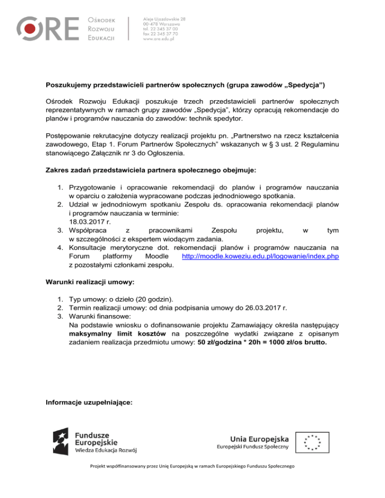 Poszukujemy przedstawicieli partnerów społecznych (grupa zawodów „Spedycja”) Ośrodek Rozwoju Edukacji poszukuje trzech przedstawicieli partnerów społecznych reprezentatywnych w ramach grupy zawodów „Spedycja”, którzy opracują rekomendacje do planów i programów nauczania do zawodów: technik spedytor. Postępowanie rekrutacyjne dotyczy realizacji projektu pn. „Partnerstwo na rzecz kształcenia zawodowego, Etap 1. Forum Partnerów Społecznych” wskazanych w § 3 ust. 2 Regulaminu stanowiącego Załącznik nr 3 do Ogłoszenia. Zakres zadań przedstawiciela partnera społecznego obejmuje: 1. Przygotowanie i opracowanie rekomendacji do planów i programów nauczania w oparciu o założenia wypracowane podczas jednodniowego spotkania. 2. Udział w jednodniowym spotkaniu Zespołu ds. opracowania rekomendacji planów i programów nauczania w terminie: 18.03.2017 r. 3. Współpraca z pracownikami Zespołu projektu, w tym w szczególności z ekspertem wiodącym zadania. 4. Konsultacje merytoryczne dot. rekomendacji planów i programów nauczania na Forum platformy Moodle http://moodle.koweziu.edu.pl/logowanie/index.php z pozostałymi członkami zespołu. Warunki realizacji umowy: 1. Typ umowy: o dzieło (20 godzin). 2. Termin realizacji umowy: od dnia podpisania umowy do 26.03.2017 r. 3. Warunki finansowe: Na podstawie wniosku o dofinansowanie projektu Zamawiający określa następujący maksymalny limit kosztów na poszczególne wydatki związane z opisanym zadaniem realizacja przedmiotu umowy: 50 zł/godzina * 20h = 1000 zł/os brutto. Informacje uzupełniające: Projekt współfinansowany przez Unię Europejską w ramach Europejskiego Funduszu Społecznego 1. Wykonawcy zobowiązani będą do przedstawiania oświadczenia w postaci protokołu o faktycznej liczbie godzin, którą przeznaczyli na realizację umowy w ujęciu miesięcznym oraz poświadczą, że łączna miesięczna liczba godzin zadań realizowanych w ramach wszystkich projektów finansowanych z funduszy strukturalnych i Funduszu Spójności oraz zadań finansowanych z innych źródeł, obejmujących okres realizacji umowy zawartej z ORE nie przekracza łącznie 276 godzin miesięcznie. Jednocześnie wykonawca będzie zobowiązany do złożenia oświadczenia, że obciążenie zawodowe nie wyklucza możliwości prawidłowej i efektywnej realizacji wszystkich zadań powierzonych mu w ramach projektu. 2. W ramach spotkań określonych w pkt. 3 Zakresu zadań przedstawiciela partnera społecznego, Zamawiający zapewnia i finansuje nocleg przed spotkaniem oraz wyżywienie w trakcie spotkania. Uczestnikom spotkania zwracane są koszty podróży (do 200 zł - zgodnie z cennikiem biletów II klasy). 3. Spotkanie Zespołu ds. opracowania rekomendacji planów i programów nauczania odbywać się będzie w weekend. Zamawiający zastrzega sobie możliwość zmiany terminów spotkań (zgodnie z harmonogramem realizacji zadań). 4. Osoby będące Partnerami Społecznymi w projekcie nie mogą brać udziału w niniejszej rekrutacji. Zamawiający zastrzega sobie możliwość niewyłonienia Wykonawców bez podania przyczyny. Wymagania stawiane Wykonawcy Wymagania obowiązkowe (oceniane: spełnia/nie spełnia): 1. Min. 3-letnie doświadczenie zawodowe w wybranym/ych zawodzie/zawodach w ramach grupy zawodów „Spedycja”. 2. Wykształcenie adekwatne do wybranego/ych zawodu/zawodów zadeklarowanego/ych w ramach grupy zawodów „Spedycja”. 3. Rekomendacja co najmniej jednego partnera społecznego, reprezentatywnego dla wybranego/ych zawodu/zawodów w ramach grupy zawodowej „Spedycja”. 4. Średnie miesięczne zaangażowanie w realizację zadań we wszystkich projektach finansowanych z funduszy strukturalnych i Funduszu Spójności oraz z zadań Projekt współfinansowany przez Unię Europejską w ramach Europejskiego Funduszu Społecznego finansowanych z innych źródeł (w tym umowa o pracę, umowy zlecenie, umowy o dzieło, działalność gospodarcza) nieprzekraczające 250 godzin. Kryteria oceny wyboru najkorzystniejszej oferty: 1. Oferent może zdobyć maksymalnie 50 punktów. 2. W ramach oceny kompetencje i doświadczenia oferent może uzyskać maksymalnie 40 punktów – kryteria wraz z punktacją zostały podane w formularzu zgłoszeniowym (Załącznik nr 1). Punktacja w zakresie kompetencji i doświadczenia stanowi sumę punktów uzyskanych przez kandydata w części 3 formularza zgłoszeniowego. 3. Zaproponowana cena, za którą można uzyskać maks. 10 pkt: - 10 pkt otrzyma oferta z najniższą ceną, wobec której pozostałe oferty będą porównywane; - cena winna być wyrażona w złotych polskich, zaokrąglona do dwóch miejsc po przecinku zgodnie z zasadami rachunkowymi; - wykonawca może podać tylko jedną cenę – bez proponowania rozwiązań wariantowych. 4. Przyjęty algorytm obliczania ceny: Cena – wzór obliczenia punktów: 𝑃= 𝐶𝑛 ∗ 10 𝑝𝑘𝑡 𝐶𝑏 P – liczba punktów przyznanych badanej ofercie w zakresie ceny Cn – najniższa cena spośród badanych ofert Cb – cena oferty badanej P= Cn Za najkorzystniejszą Zamawiający uzna tę ofertę, która po zsumowaniu obu kryteriów uzyska największą liczbę punktów. W pierwszej kolejności dokonana zostanie ocena formalna. Oferty niespełniające wymogów obowiązkowych nie będą poddawane dalszej ocenie. Minimum punktowe konieczne do uzyskania w kryterium doświadczenie i kompetencje oferenta wynosi 7 punktów. Oferty, które nie spełnią minimum nie będą podlegały dalszej ocenie w kryterium „Zaproponowana cena”. Projekt współfinansowany przez Unię Europejską w ramach Europejskiego Funduszu Społecznego Ponadto w kryteriach wskazane zostały obszary, w których oferent powinien uzyskać minimalną liczbę punktów, nieuzyskanie minimum w co najmniej jednym z ww. obszarów powoduje, że oferta taka nie będzie podlegała dalszej ocenie. Warunki zmiany umowy Zamawiający zastrzega możliwość zmiany treści umowy w st