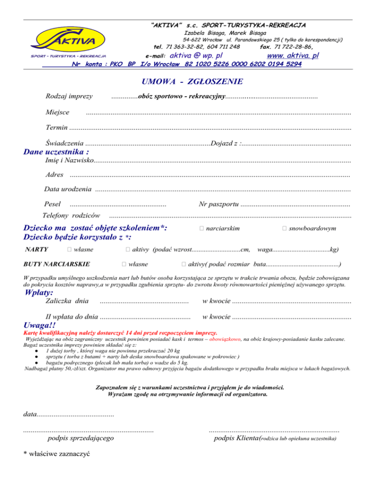 “AKTIVA” s.c. SPORT-TURYSTYKA-REKREACJA Izabela Bisaga, Marek Bisaga 54-622 Wrocław ul. Parandowskiego 25 ( tylko do korespondencji) tel. 71 363-32-82, 604 711 248 e-mail: aktiva @ wp. pl fax. 71 722-28-86, www. aktiva. pl Nr konta : PKO BP I/o Wrocław 82 1020 5226 0000 6202 0194 5294 UMOWA - ZGŁOSZENIE ..............obóz sportowo - rekreacyjny................................................ Rodzaj imprezy Miejsce ............................................................................................................................................ Termin ..................................................................................................................................................... Świadczenia ..................................................................Dojazd z :.......................................................... Dane uczestnika : Imię i Nazwisko........................................................................................................................................ Adres .................................................................................................................................................... Data urodzenia ....................................................................................................................................... Pesel ................................................... Telefony rodziców Nr paszportu .......................................................... ................................................................................................................................ Dziecko ma zostać objęte szkoleniem*: Dziecko będzie korzystało z *: NARTY własne narciarskim aktivy (podać wzrost............................cm, BUTY NARCIARSKIE własne snowboardowym waga.................................kg) aktivy( podać rozmiar buta..........................................) W przypadku umyślnego uszkodzenia nart lub butów osoba korzystająca ze sprzętu w trakcie trwania obozu, będzie zobowiązana do pokrycia kosztów naprawy,a w przypadku zgubienia sprzętu- do zwrotu kwoty równowartości pieniężnej używanego sprzętu. Wpłaty: Zaliczka dnia ............................................... w kwocie ............................................................... II wpłata do dnia ................................................ w kwocie ............................................................... Uwaga!! Kartę kwalifikacyjną należy dostarczyć 14 dni przed rozpoczęciem imprezy. Wyjeżdżając na obóz zagraniczny uczestnik powinien posiadać kask i termos – obowiązkowo, na obóz krajowy-posiadanie kasku zalecane. Bagaż uczestnika imprezy powinien składać się z: ● 1 dużej torby , której waga nie powinna przekraczać 20 kg ● sprzętu ( torba z butami + narty lub deska snowboardowa spakowane w pokrowiec ) ● bagażu podręcznego (plecak lub mała torba) o wadze do 5 kg. Nadbagaż płatny 50,-zł/szt. Organizator ma prawo odmowy przyjęcia bagażu dodatkowego w przypadku braku miejsca w lukach bagażowych. Zapoznałem się z warunkami uczestnictwa i przyjąłem je do wiadomości. Wyrażam zgodę na otrzymywanie informacji od organizatora. data......................................... ..................................................................... podpis sprzedającego * właściwe zaznaczyć ..................................................................... podpis Klienta(rodzica lub opiekuna uczestnika)