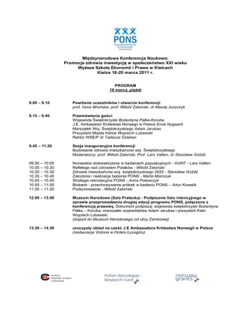 Międzynarodowa Konferencja Naukowa: Promocja zdrowia inwestycją w społeczeństwo XXI wieku Wyższa Szkoła Ekonomii i Prawa w Kielcach Kielce 18-20 marca 2011 r. PROGRAM 18 marca, piątek 9.00 – 9.15 Powitanie uczestników i otwarcie konferencji prof. Irena Wrońska, prof. Witold Zatoński, dr Maciej Juszczyk 9.15 – 9.45 Przemówienia gości: Wojewoda Świętokrzyski Bożentyna Pałka-Koruba J.E. Ambasador Królestwa Norwegii w Polsce Enok Nygaard Marszałek Woj. Świętokrzyskiego Adam Jarubas Prezydent Miasta Kielce Wojciech Lubawski Rektor WSEiP dr Tadeusz Dziekan 9.45 – 11.20 Sesja inauguracyjna konferencji Budowanie zdrowia mieszkańców woj. Świętokrzyskiego Moderatorzy: prof. Witold Zatoński, Prof. Lars Vatten, dr Stanisław Góźdź 09.50 – 10:05 10.05 – 10.20 10.20 – 10.35 10.35 – 10.45 10.45 – 10.55 10.55 – 11.05 11.05 – 11.20 Norweskie doświadczenie w badaniach populacyjnych - HUNT - Lars Vatten Refleksje nad zdrowiem Polaków - Witold Zatoński Zdrowie mieszkańców woj. świętokrzyskiego 2020 - Stanisław Góźdź Założenia i realizacja badania PONS - Marta Mańczuk Strategia rekrutacyjna PONS - Anna Polewczyk Biobank - przechowywanie próbek w badaniu PONS – Artur Kowalik Podsumowanie - Witold Zatoński 12.00 – 13.00 Muzeum Narodowe (Sala Prałacka) - Podpisanie listu intencyjnego w sprawie przeprowadzenia drugiej edycji programu PONS, połączone z konferencją prasową. Dokument podpiszą: wojewoda świętokrzyski Bożentyna Pałka – Koruba, marszałek województwa Adam Jarubas i prezydent Kielc Wojciech Lubawski. (dojazd do Muzeum Narodowego od ulicy Zamkowej) 13.30 – 14.30 uroczysty obiad na cześć J.E Ambasadora Królestwa Norwegii w Polsce (restauracja Victoria w Hotelu Łysogóry)