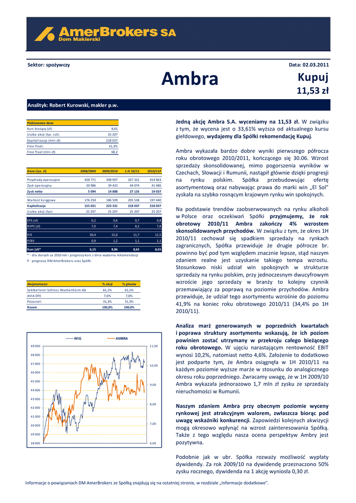 Sektor: spożywczy Data: 02.03.2011 Ambra Kupuj 11,53 zł Analityk: Robert Kurowski, makler p.w. Jedną akcję Ambra S.A. wyceniamy na 11,53 zł. W związku z tym, że wycena jest o 33,61% wyższa od aktualnego kursu giełdowego, wydajemy dla Spółki rekomendację Kupuj. Podstawowe dane Kurs bi eżący (zł): 8,65 Li czba akcji (tys . s zt): 25 207 Ka pi ta l i za cja (ml n zł): 218 037 Free fl oat: 31,3% Free fl oat (ml n zł): Dane (tys. zł) 68,2 2008/2009 2009/2010 1-H 10/11 2010/11P 428 771 398 907 267 321 414 863 20 986 39 423 44 074 41 486 5 094 14 888 27 135 19 037 Wartoś ć ks i ęgowa 176 258 186 509 205 538 197 440 Kapitalizacja 155 021 223 331 218 037 218 037 25 207 25 207 25 207 25 207 Przychody ope racyjne Zys k opera cyjny Zysk netto Li czba akcji (tys ) EPS (zł) 0,2 0,6 0,7 0,8 BVPS (zł) 7,0 7,4 8,2 7,8 30,4 15,0 11,7 11,5 0,9 1,2 1,1 1,1 6,15 8,86 8,65 8,65 P/E P/BV Kurs (zł)* * - dl a danych za 2010 rok i prognozy kurs z dni a wydani a re komendacji P - prognoza DM AmerBrokers oraz Spółki Akcjonariusze: % akcji % głosów Se ktke l l erei Schl os s Wachenhei m AG 61,1% 61,1% AVIA OFE 7,6% 7,6% Pozos tal i 31,3% 31,3% Razem 100,0% 100,0% WIG 49 000 AMBRA 11,00 48 000 47 000 10,00 46 000 45 000 9,00 44 000 Ambra wykazała bardzo dobre wyniki pierwszego półrocza roku obrotowego 2010/2011, kończącego się 30.06. Wzrost sprzedaży skonsolidowanej, mimo pogorszenia wyników w Czechach, Słowacji i Rumunii, nastąpił głównie dzięki progresji na rynku polskim. Spółka przebudowując ofertę asortymentową oraz nabywając prawa do marki win „El Sol” zyskała na szybko rosnącym krajowym rynku win spokojnych. Na podstawie trendów zaobserwowanych na rynku alkoholi w Polsce oraz oczekiwań Spółki przyjmujemy, że rok obrotowy 2010/11 Ambra zakończy 4% wzrostem skonsolidowanych przychodów. W związku z tym, że okres 1H 2010/11 cechował się spadkiem sprzedaży na rynkach zagranicznych, Spółka przewiduje że drugie półrocze br. powinno być pod tym względem znacznie lepsze, stąd naszym zdaniem realne jest uzyskanie takiego tempa wzrostu. Stosunkowo niski udział win spokojnych w strukturze sprzedaży na rynku polskim, przy jednoczesnym dwucyfrowym wzroście jego sprzedaży w branży to kolejny czynnik przemawiający za poprawą na poziomie przychodów. Ambra przewiduje, że udział tego asortymentu wzrośnie do poziomu 41,9% na koniec roku obrotowego 2010/11 (34,4% po 1H 2010/11). Analiza marż generowanych w poprzednich kwartałach i poprawa struktury asortymentu wskazują, że ich poziom powinien zostać utrzymany w przekroju całego bieżącego roku obrotowego. W ujęciu narastającym rentowność EBIT wynosi 10,2%, natomiast netto 4,6%. Założenie to dodatkowo jest podparte tym, że Ambra osiągnęła w 1H 2010/11 na każdym poziomie wyższe marże w stosunku do analogicznego okresu roku poprzedniego. Zwracamy uwagę, że w 1H 2009/10 Ambra wykazała jednorazowo 1,7 mln zł zysku ze sprzedaży nieruchomości w Rumunii. 43 000 8,00 42 000 41 000 40 000 7,00 39 000 38 000 6,00 Naszym zdaniem Ambra przy obecnym poziomie wyceny rynkowej jest atrakcyjnym walorem, zwłaszcza biorąc pod uwagę wskaźniki konkurencji. Zapowiedzi kolejnych akwizycji mogą okresowo wpłynąć na wzrost zainteresowania Spółką. Także z tego względu nasza ocena perspektyw Ambry jest pozytywna. Podobnie jak w ubr. Spółka rozważy możliwość wypłaty dywidendy. Za rok 2009/10 na dywidendę przeznaczono 50% zysku rocznego, dywidenda na 1 akcję wyniosła 0,30 zł. Informacje o powiązaniach DM AmerBrokers ze Spółką znajdują się na ostatniej stronie, w rozdziale „Informacje dodatkowe”. Ambra – raport analityczny 2 marca 2011 Sytuacja w branży Cechy branży Rynek alkoholi w Europie, w tym również w Polsce podlega zmianom, polegającym na przesuwaniu się preferencji konsumentów. O ile w Europie Zachodniej zmiany w większym stopniu dotyczą wahań w poszczególnych asortymentach (przesunięcie popytu pomiędzy whisky, likierami, koniakami, napojami Ready-To-Drink i wzrost popytu na wina z Nowego Świata), to w Polsce obejmują głównie wzrost spożycia wina ogółem i innych napojów alkoholowych, kosztem wódki i piwa. Tendencja obserwowana w Polsce jest zbieżna z występującą w większości krajów Europy Środkowo-Wschodniej. W dalszym ciągu jednak w strukturze spożycia dominuje piwo, które ma około 50% udział, na drugim miejscu są alkohole mocne (wódka i inne) z 30%, a tylko 20% przypada na wino. Wartość rynku Rynek alkoholu w Polsce ma wartość około 39 mld zł, przy czym wzrost w skali roku szacowny jest na 1 około 1,4% . Największy wzrost miał miejsce w kategorii whisky (+24%), natomiast w wódkach nastąpił 1,2% spadek spożycia. Sytuacja w poszczególnych asortymentach determinowana jest przez preferencje konsumentów, ale i przez ceny, stymulowane w głównym stopniu przez obciążenia fiskalne (akcyza). Rynek wina Rynek wina w Polsce rośnie rocznie w tempie kilkunastoprocentowym i jego wartość oszacować należy na około 2,5 mld zł – 3,0 mld zł. Wyższe tempo wzrostu notuje segment win spokojnych i wermutów (około 14-15%), natomiast w przypadku win musujących wzrost r/r wynosi około 8%. Rynek win spokojnych ma około 50% udział w całym rynku wina. Według danych Ambry, przeciętna roczna konsumpcja wina na mieszkańca w Polsce wynosi około 3-4 litrów, natomiast w Czechach około 10, a w Rumunii powyżej 20. W związku tym szacuje się, że rynek wina powinien w dalszym ciągu rosnąć w tempie kilkunastu procent rocznie, zwłaszcza w segmencie win spokojnych. Prognozy Według danych International Wine and Spirit Research (IWSR), do 2015 roku wielkość polskiego rynku 2 wina w ujęciu ilościowym zwiększy się o około 1,2% w stosunku do roku 2010, tj. do 225,9 mln litrów . Szacunki IWSR przewidują, że maleć będzie produkcja win owocowych, natomiast wzrośnie udział win gronowych (spokojnych). Z kolei E