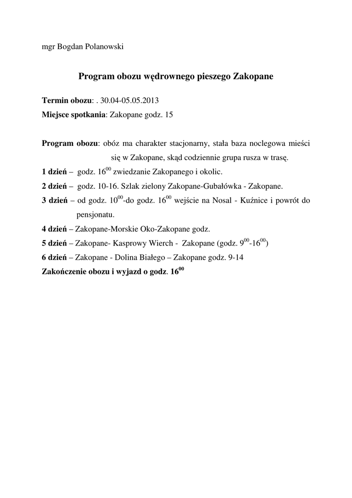 mgr Bogdan Polanowski Program obozu wędrownego pieszego Zakopane Termin obozu: . 30.04-05.05.2013 Miejsce spotkania: Zakopane godz. 15 Program obozu: obóz ma charakter stacjonarny, stała baza noclegowa mieści się w Zakopane, skąd codziennie grupa rusza w trasę. 1 dzień – godz. 1600 zwiedzanie Zakopanego i okolic. 2 dzień – godz. 10-16. Szlak zielony Zakopane-Gubałówka - Zakopane. 3 dzień – od godz. 1000-do godz. 1600 wejście na Nosal - Kuźnice i powrót do pensjonatu. 4 dzień – Zakopane-Morskie Oko-Zakopane godz. 5 dzień – Zakopane- Kasprowy Wierch - Zakopane (godz. 900-1600) 6 dzień – Zakopane - Dolina Białego – Zakopane godz. 9-14 Zakończenie obozu i wyjazd o godz. 1600 Regulamin uczestnictwa w pieszym obozie wędrownym Zakopane 30.04-05.05.2013 Obóz wędrowny w Zakopane jest integralną częścią programu nauczania obowiązującą w Wyższej Szkole Kultury Fizycznej i Turystyki w Pruszkowie. Zakwalifikowani na obóz studenci zobowiązani SA w czasie jego trwania do przestrzegania statutu Szkoły oraz godnego reprezentowania jej imienia. 1. 2. Uczestnictwo w zajęciach przewidzianych programem obozu jest obowiązkowe. Uczestnicy obozu zobowiązani są do przestrzegania Karty Turysty, przepisów o ruchu drogowym, przepisów przeciwpożarowych oraz innych, w szczególności zarządzeń władz sanitarnych i leśnych, a także zaleceń prowadzącego. 3. Przejazdy i dojazdy odbywają się na własny koszt obozu. i odpowiedzialność Uczestnika 4. O ile prowadzący nie zarządzi inaczej wyjście na trasy obozu przewidziane jest na godz. 8.00. 5. Uczestnicy obozu zobowiązani są do posiadania dokumentów tożsamości (dowód osobisty bądź paszport), Europejskiej Karty Ubezpieczenia Zdrowotnego (EKUZ) oraz do wykupienia przed rozpoczęciem obozu polisy ubezpieczeniowej NNW. 6. Uczestników obozu obowiązuje strój i wyposażenie turystyczne, w tym w szczególności butów turystycznych zakrywających staw skokowy, kurtki przeciwdeszczowej, plecaka, śpiwora oraz karimaty, a także miękkiego obuwia na zmianę. 7. Uczestnik obozu zobowiązany jest do podania prowadzącemu wszelkich informacji dot. posiadania chorób lub schorzeń, które mogą zakłócić przebieg obozu, lub które stanowią potencjalne zagrożenie zdrowia i życia uczestnika. W takich wypadkach zalecana jest konsultacja medyczna oraz posiadanie indywidualnego zestawu leków. 8. W przypadkach naruszeń ustaleń niniejszego regulaminu oraz zasad dobrego wychowania stosuje się odpowiednio karę nagany oraz wydalenia z obozu wraz z powiadomieniem Władz Szkoły . 9. W przypadkach ciężkiego naruszenia norm obyczajowych oraz czynów wymierzonych w mienie, zdrowie i życie stosuje się karę wydalenia z obozu wraz z powiadomieniem Władz Szkoły oraz powiadamia się Policję. 10. Uczestnik obozu jest odpowiedzialny za wyrządzone przez siebie szkody materialne oraz zobowiązany do ich natychmiastowego naprawienia bądź finansowego zadośćuczynienia wobec poszkodowanego. W przypadkach braku możliwości ustalenia sprawcy przy jednoczesnym istnieniu wiarygodnych podejrzeń, iż sprawcą jest uczestnik obozu, powiadamiana jest Policja. Ustalenia Policji na niekorzyść uczestnika obozu skutkuje działaniem jak w punkcie 12. 11. Warunkiem uczestnictwa w obozie wędrownym jest akceptacja ustaleń niniejszego Regulaminu dokonana przez złożenie własnoręcznego podpisu na egzemplarzu Regulaminu . 12. Ostateczna interpretacja Regulaminu należy do prowadzącego.